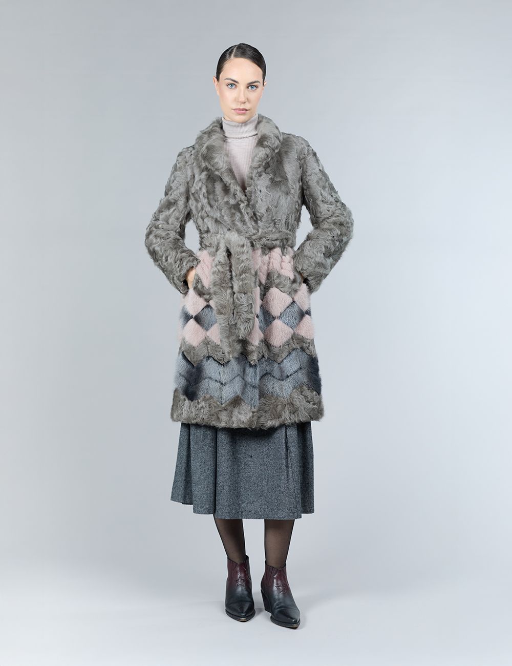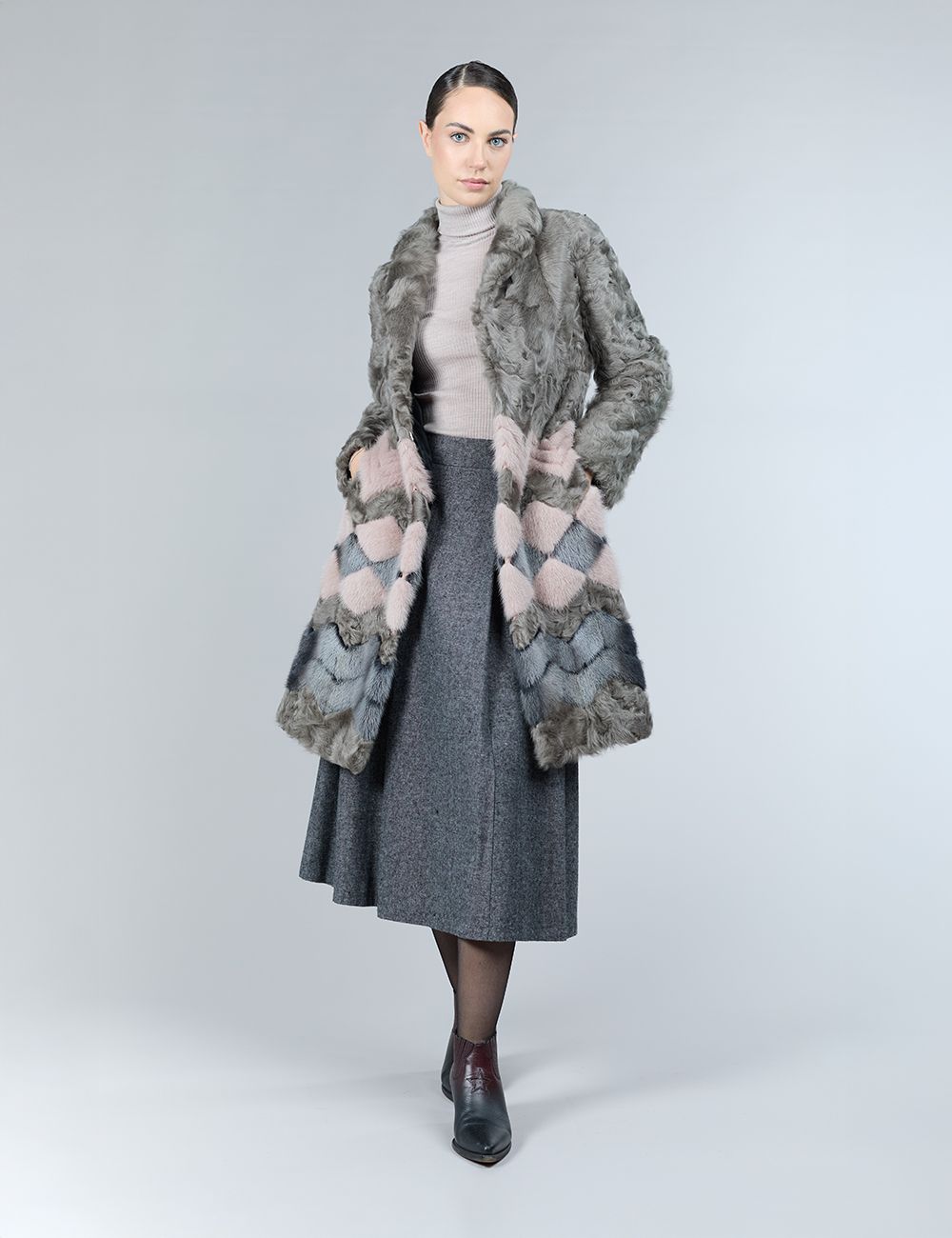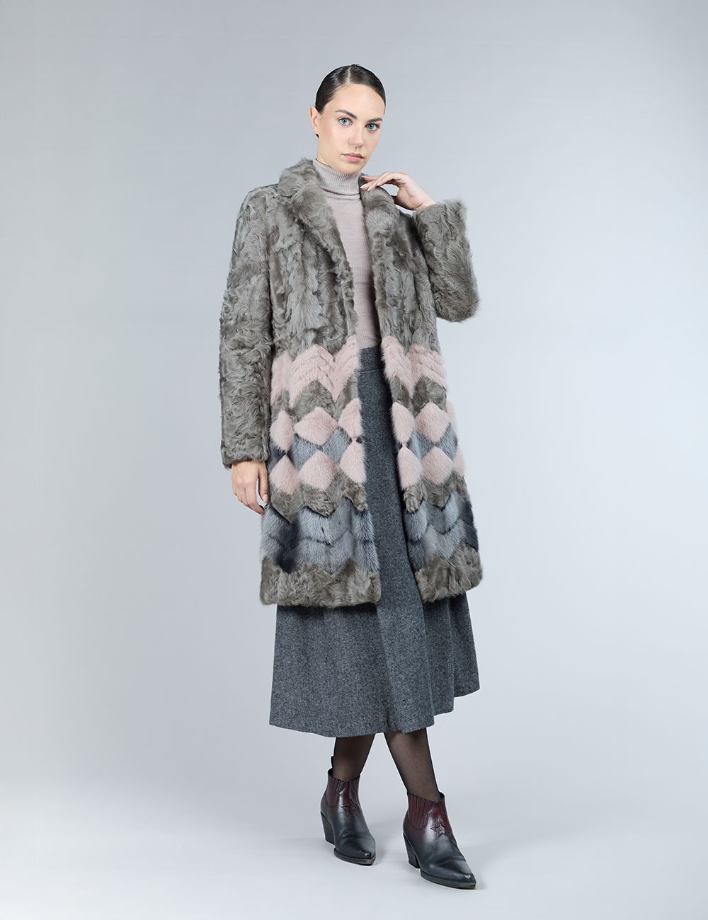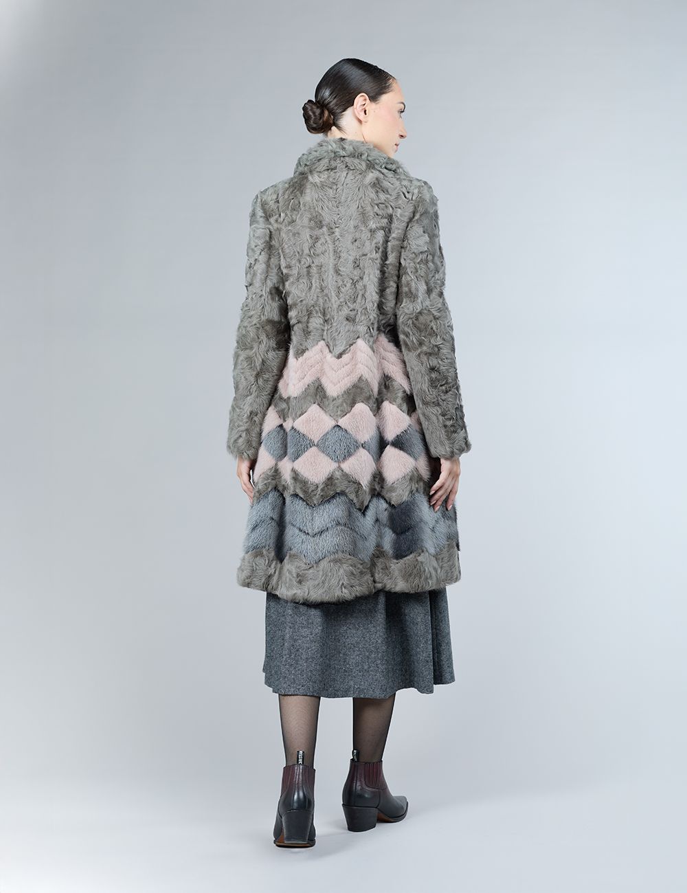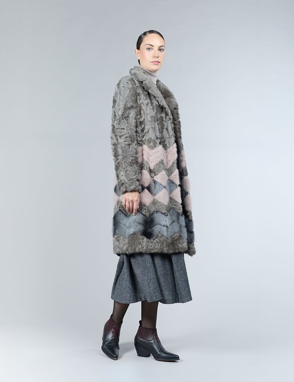 Cappotto in lambskin e visone, motivo geometrico, tortora, 100 cm