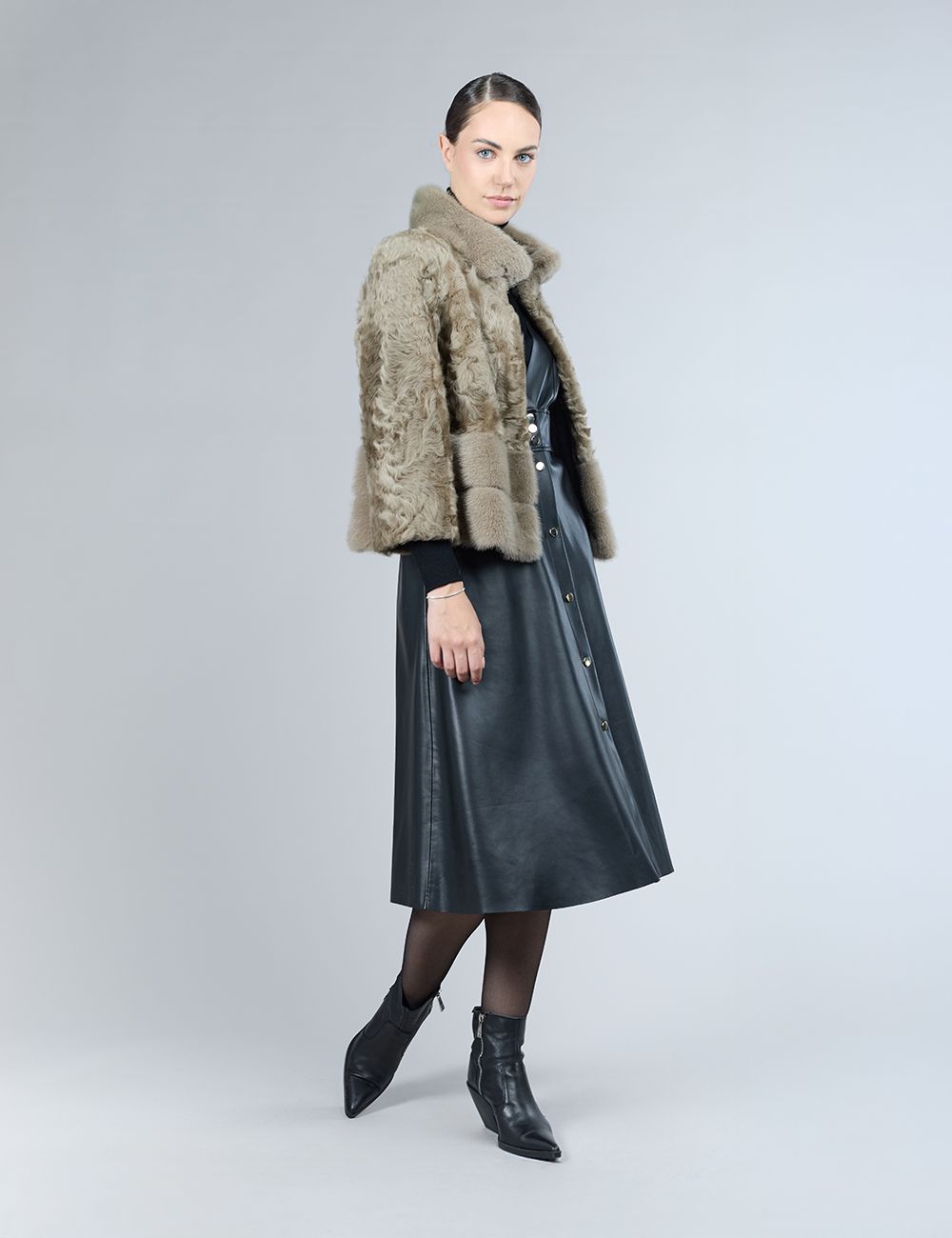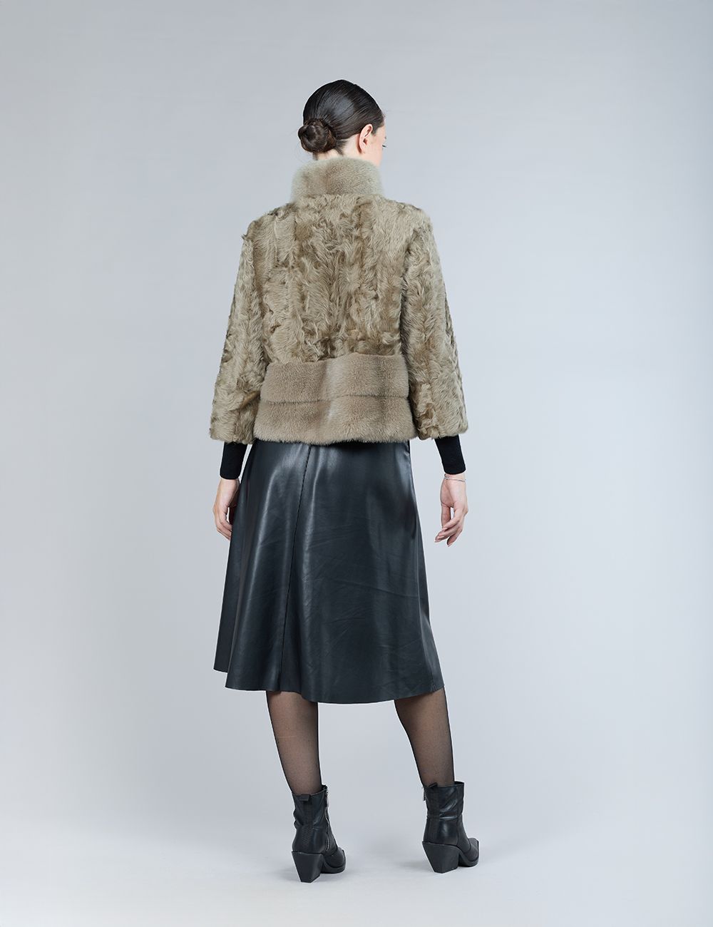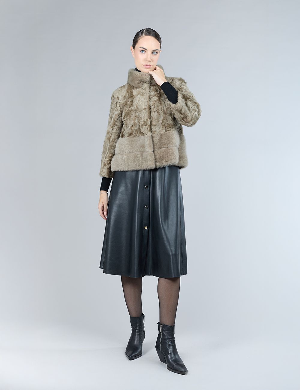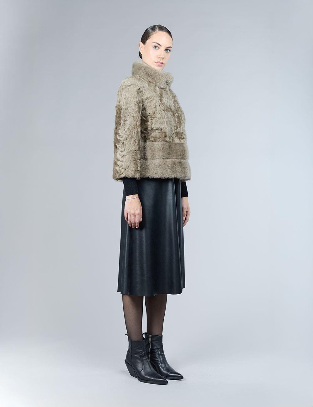 Giacca in lamb skin con inserti in visone, collo alto, silver green, 55 cm