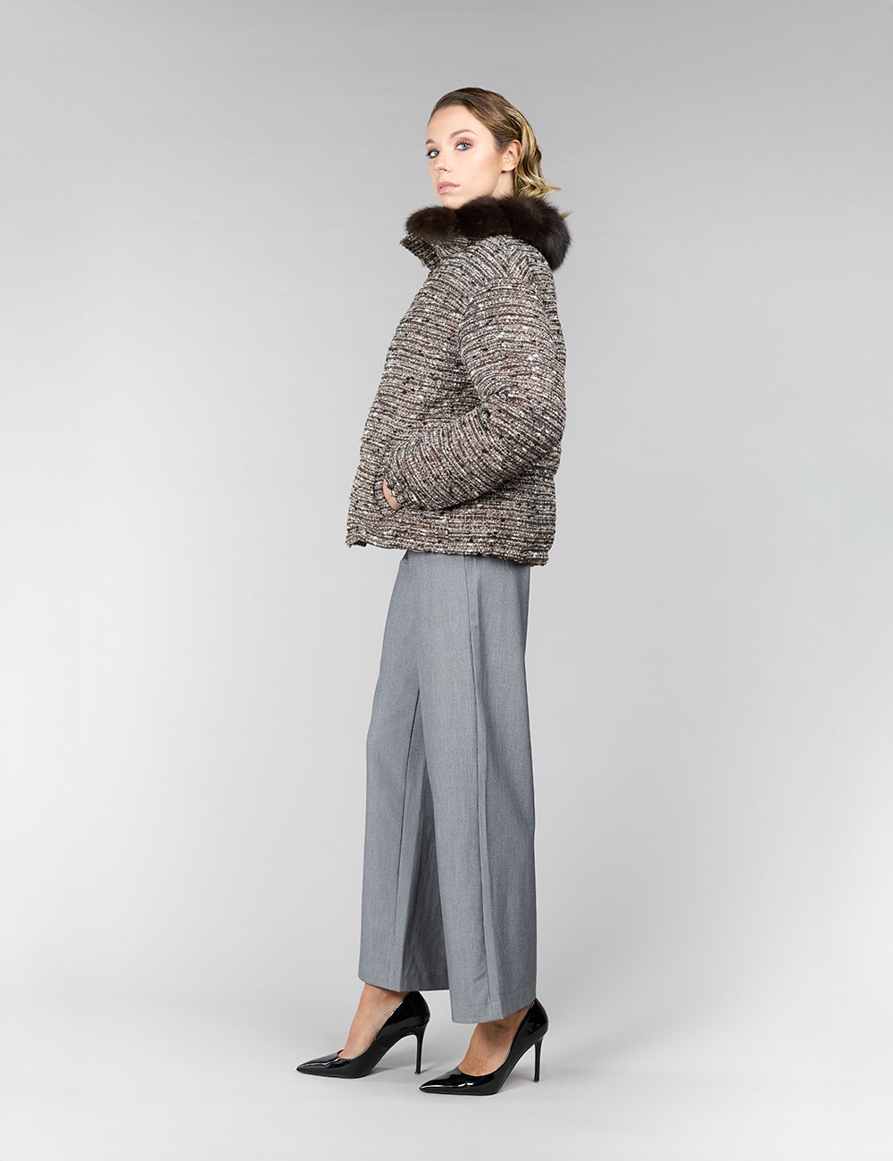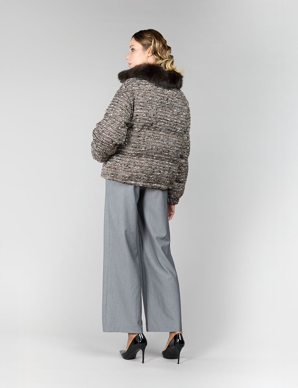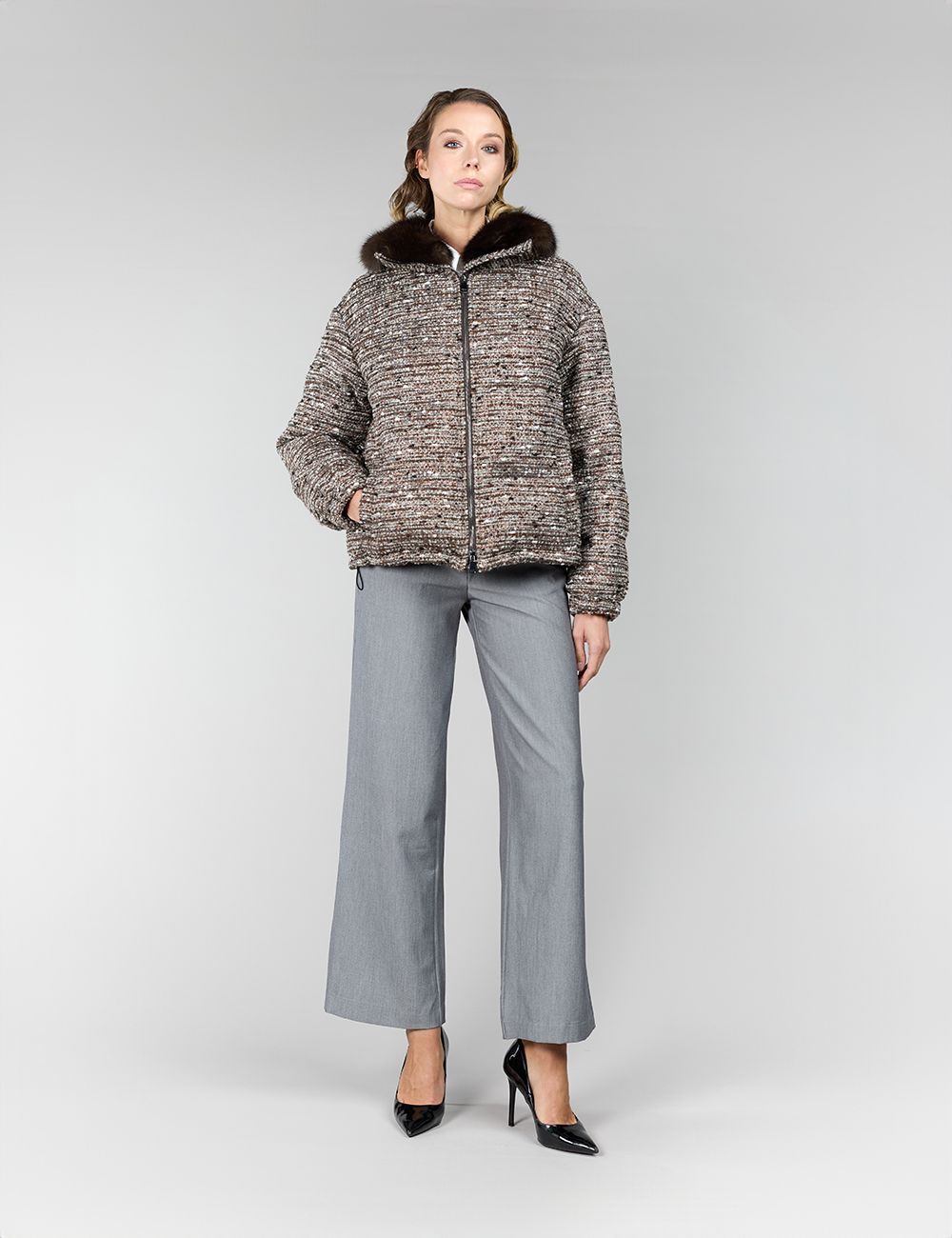 Piumino corto in tessuto tramato color marrone mélange con ampio collo in zibellino, chiusura con zip e tasche laterali, un modello pratico e sofisticato che unisce eleganza e comfort invernale, 60 cm