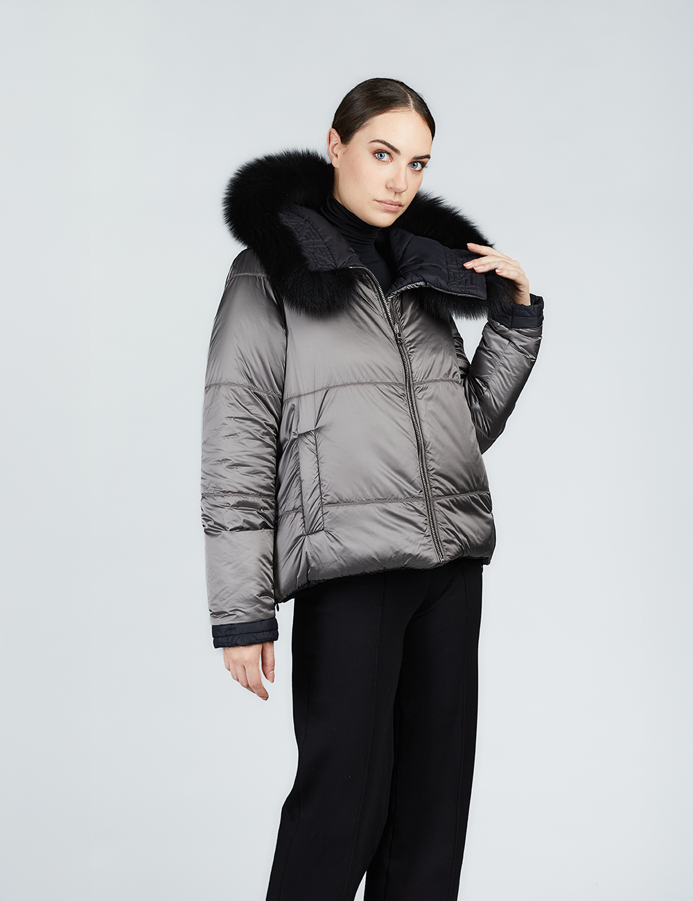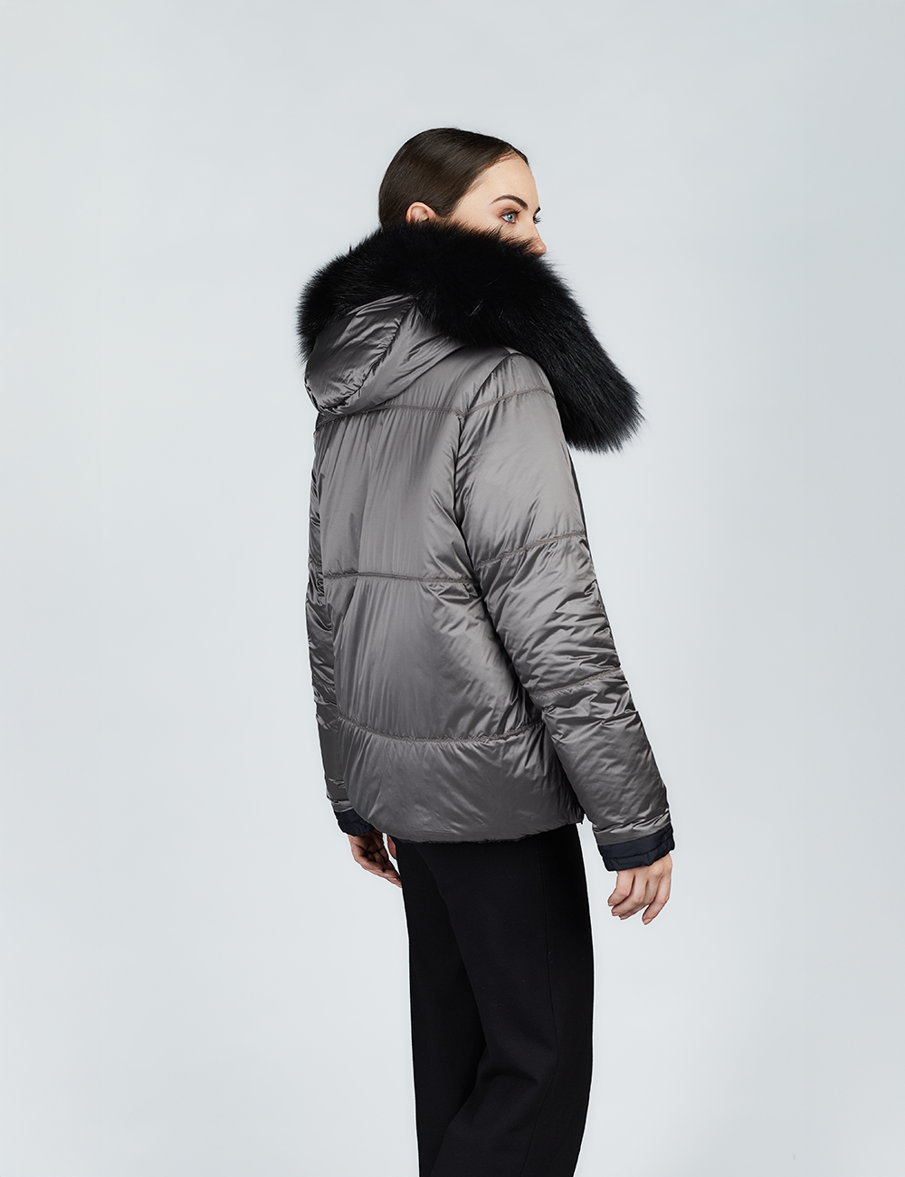 Piumino corto reversibile con cappuccio in volpe grigio 68 cm