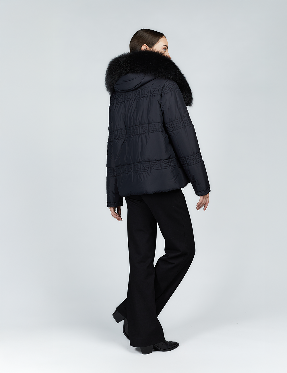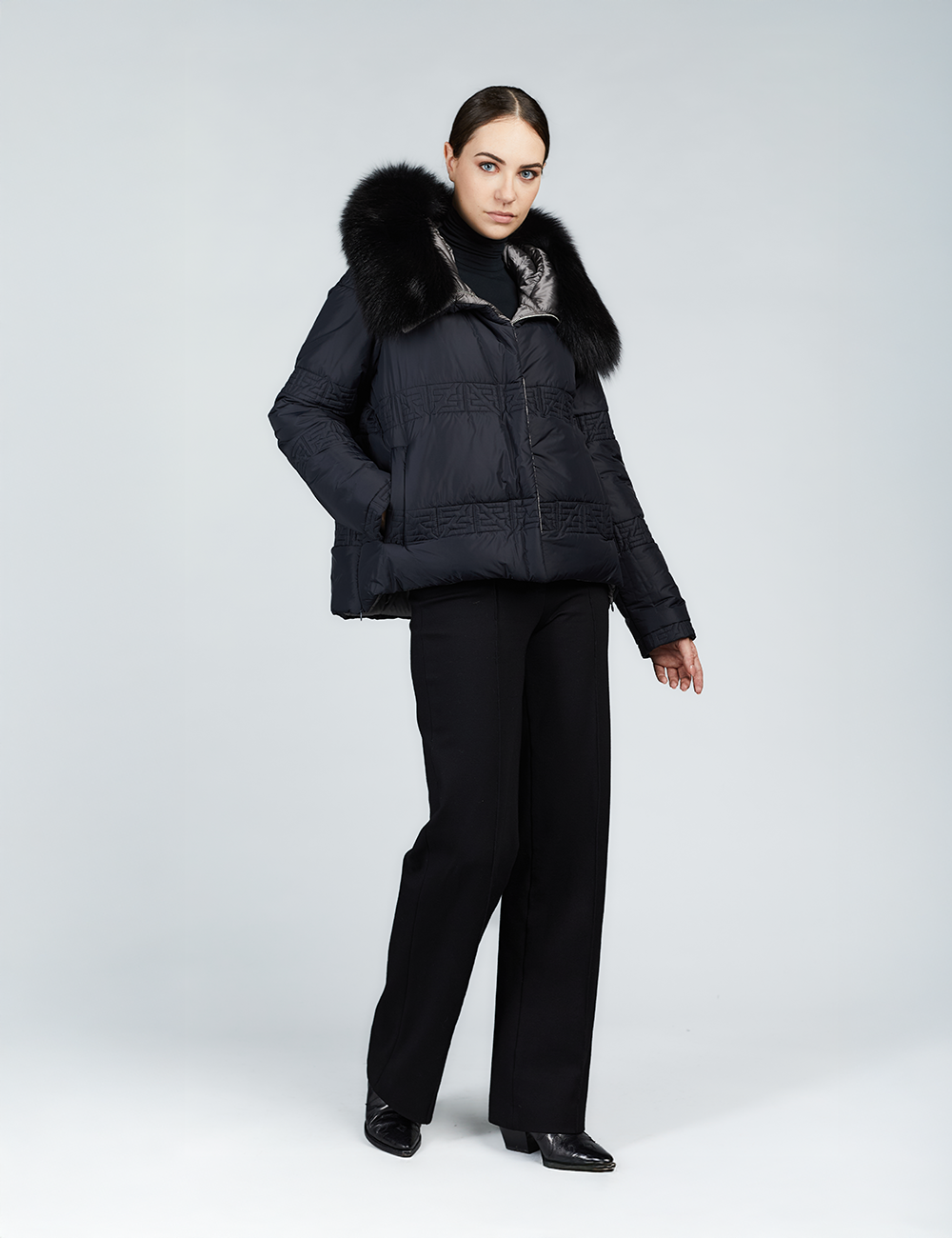 Piumino corto reversibile, cappuccio in volpe, grigio, nero, 68 cm