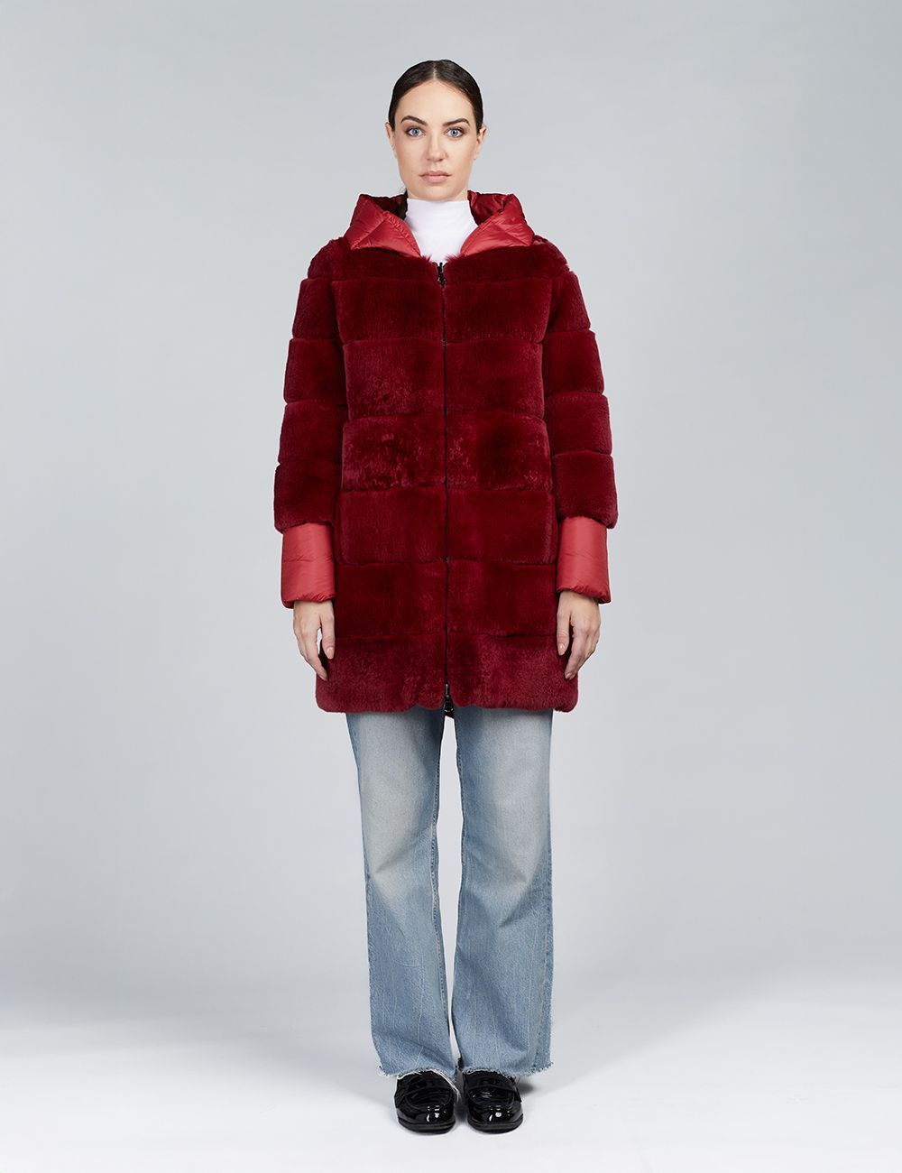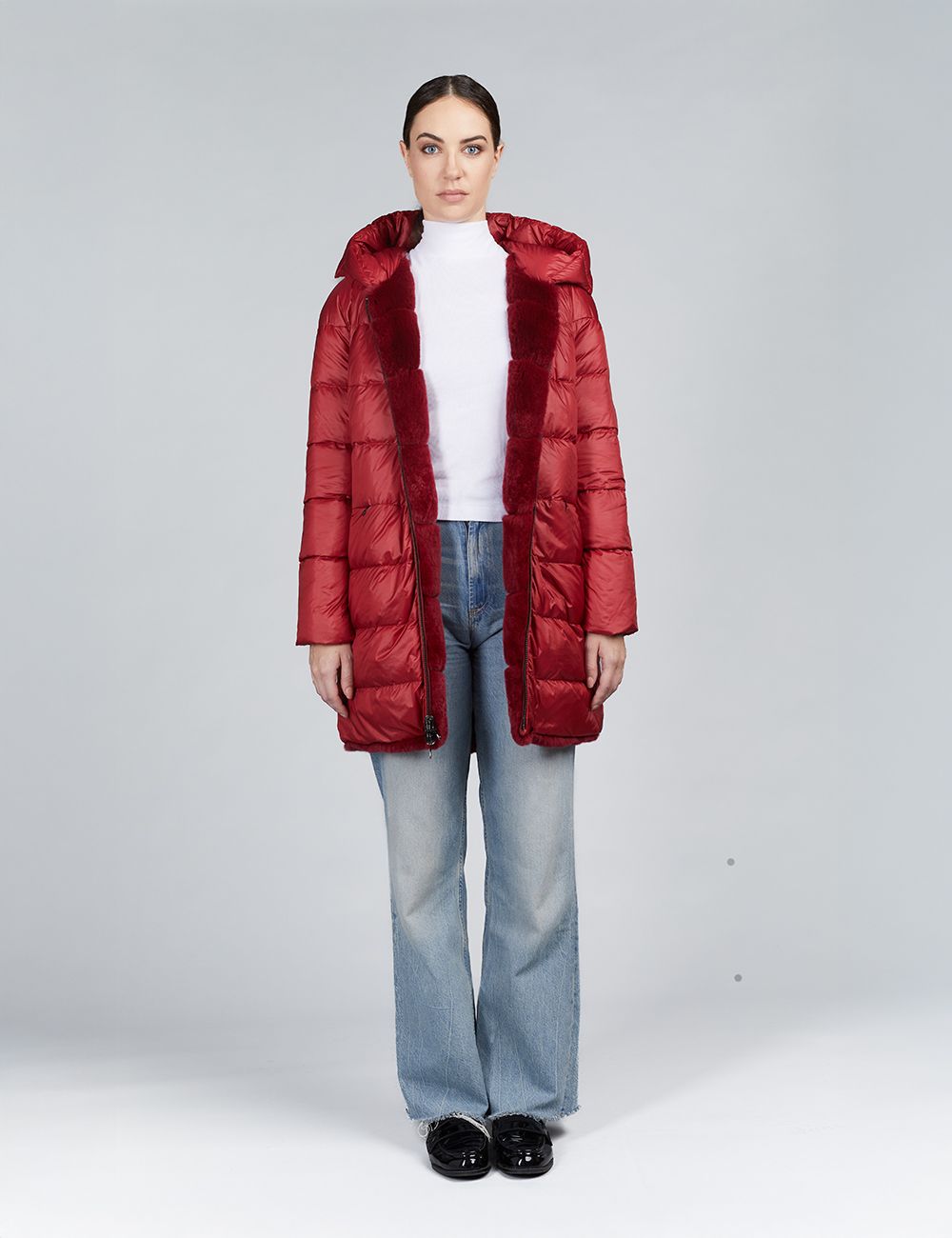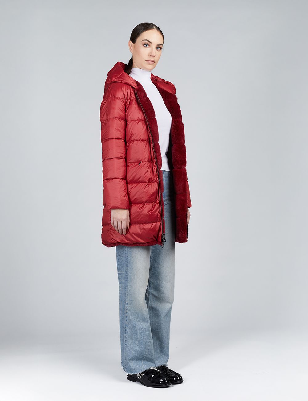 Piumino lungo con cappuccio reversibile in rex rosso 85 cm