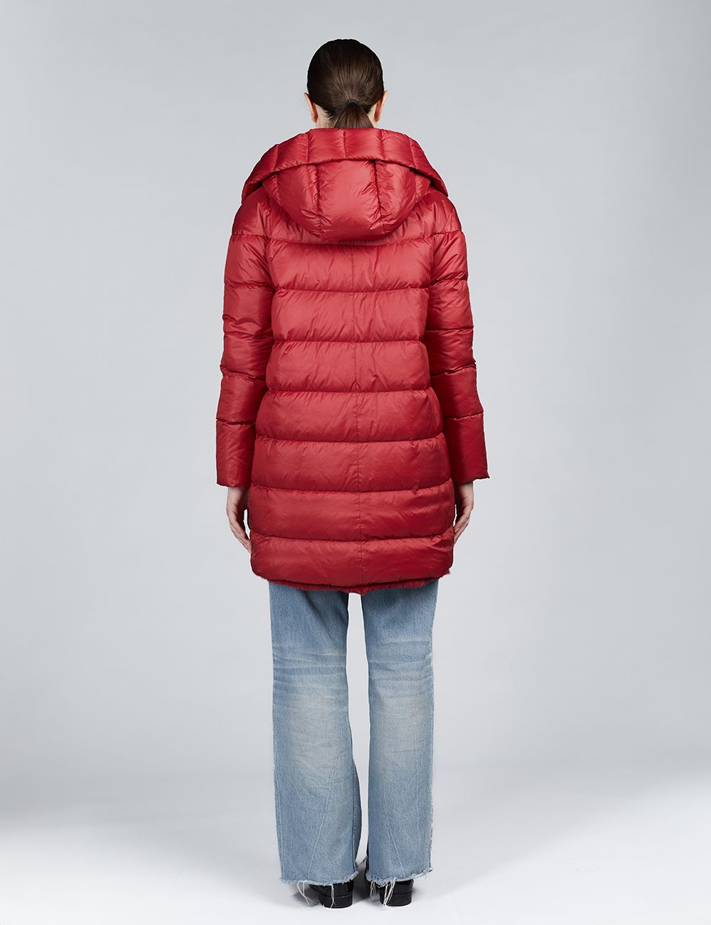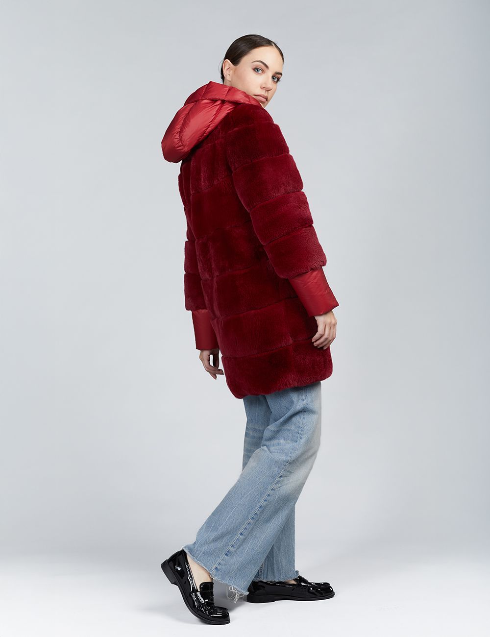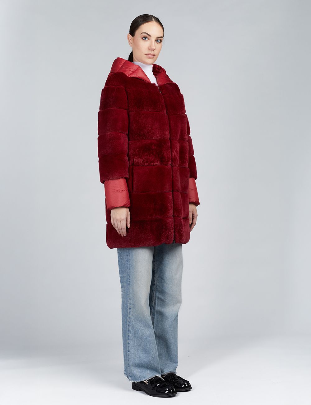 Piumino lungo con cappuccio reversibile in rex rosso 85 cm