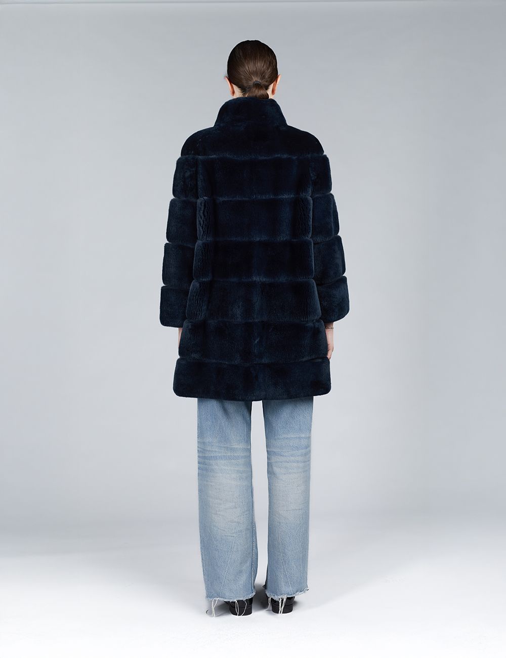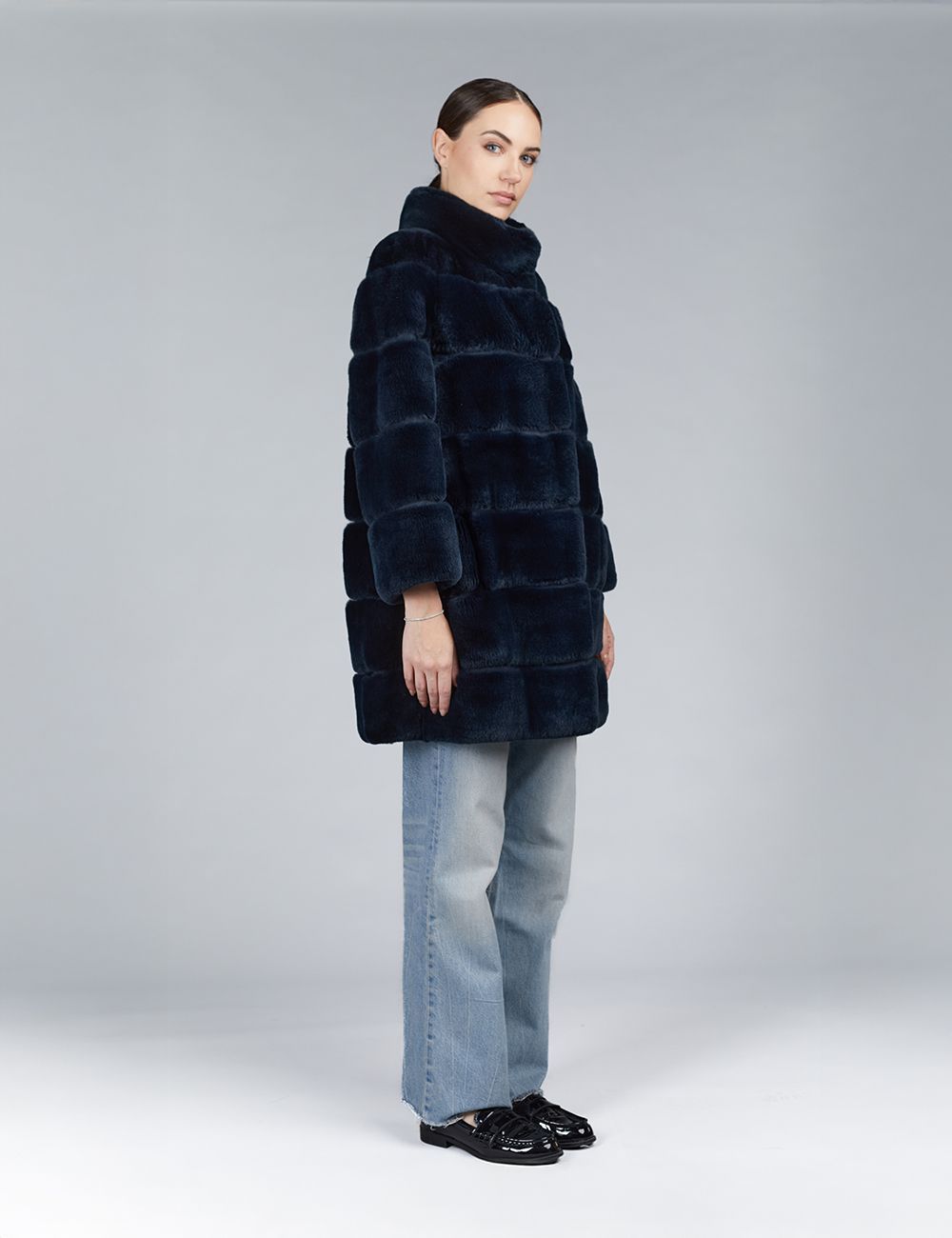 Cappotto in rex, collo alto, lavorazione orizzontale, vestibilita' comoda, blu notte, 85cm