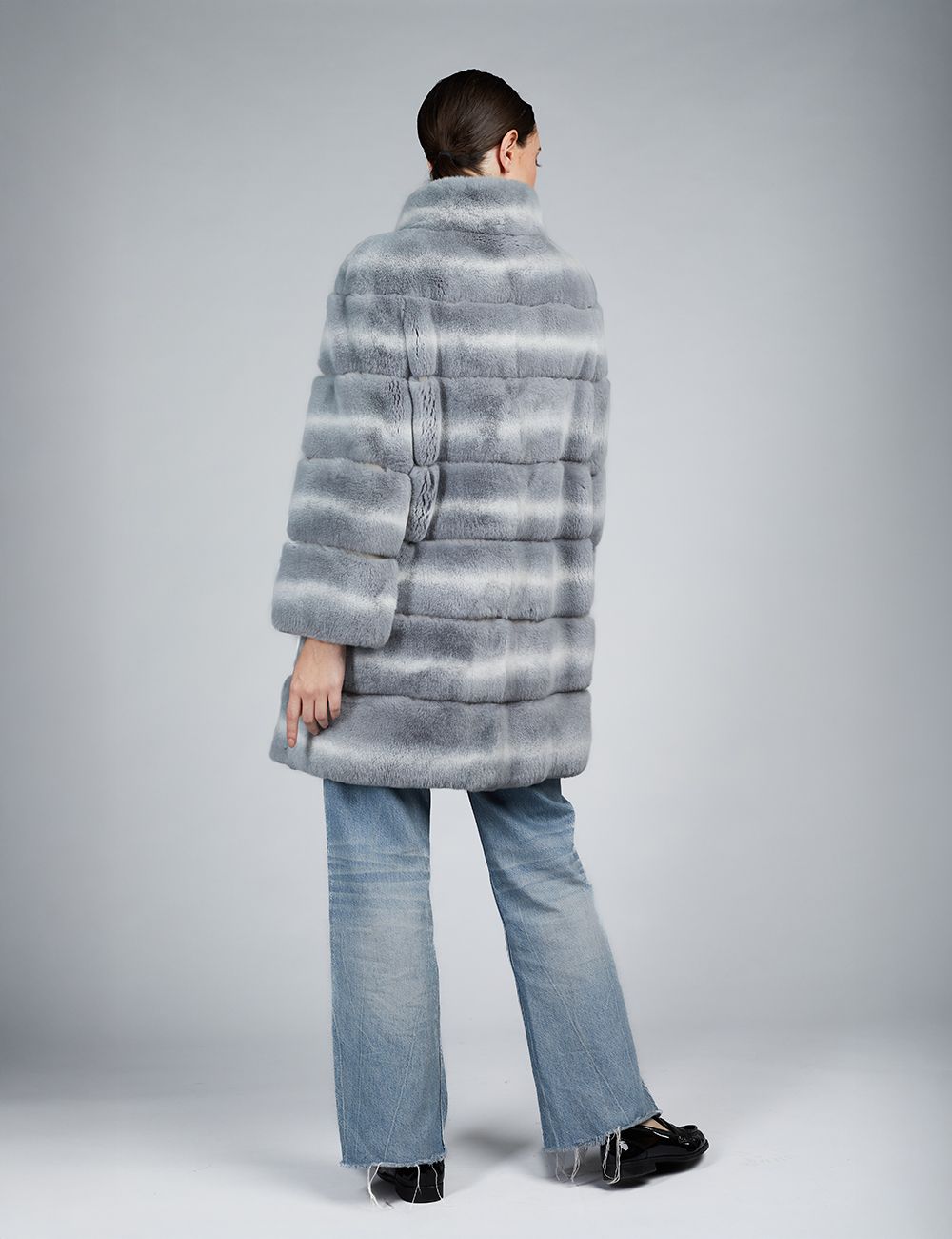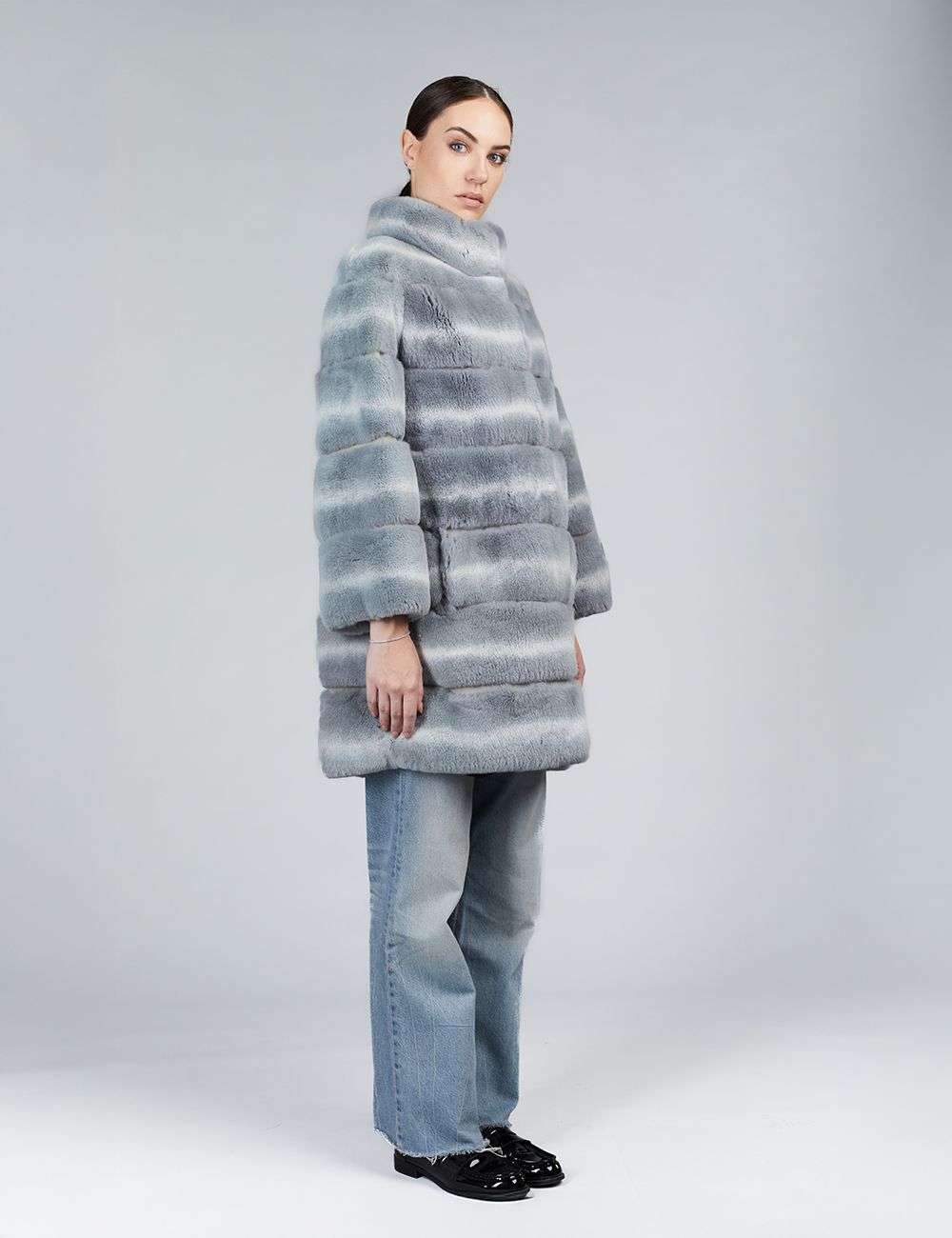 Cappotto in rex, collo alto, lavorazione orizzontale, vestibilita' comoda, grigio, 85cm