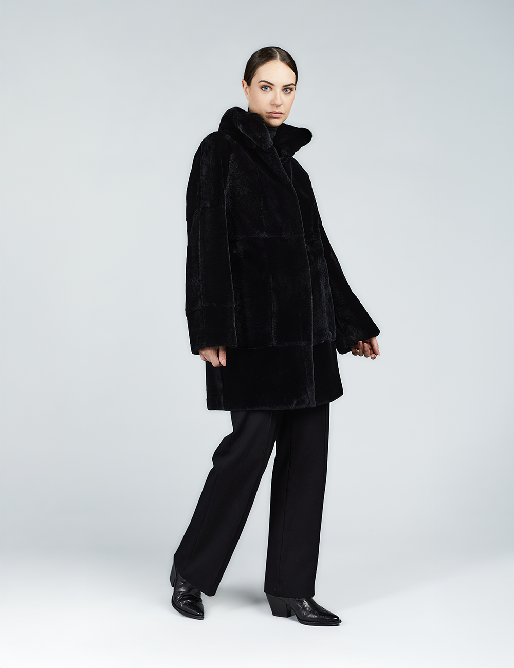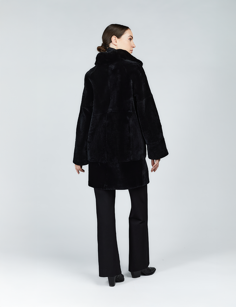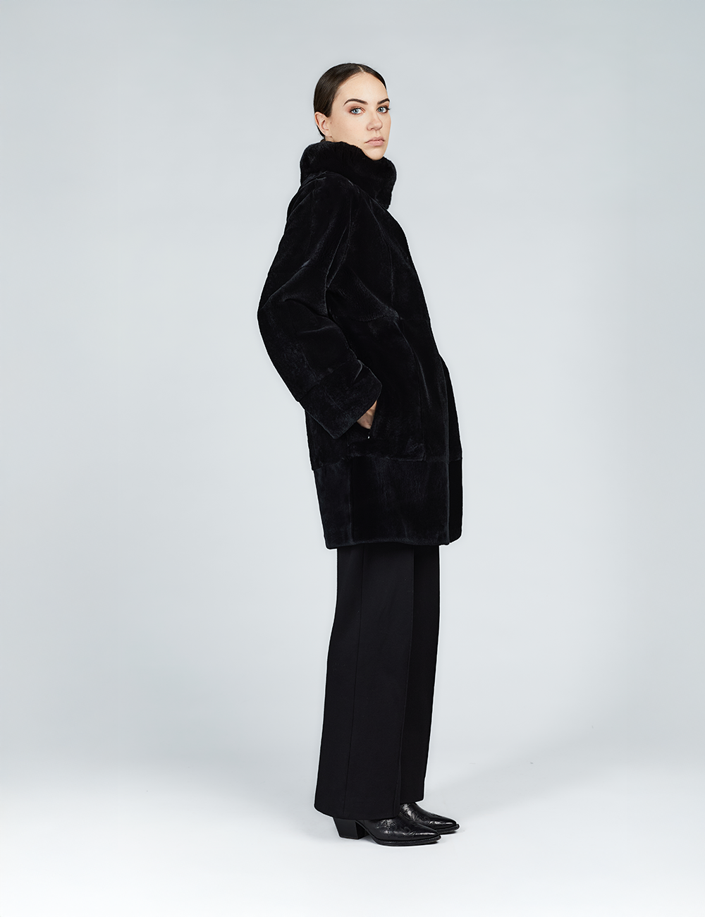Cappotto in rex reversibile con collo alto nero 85 cm