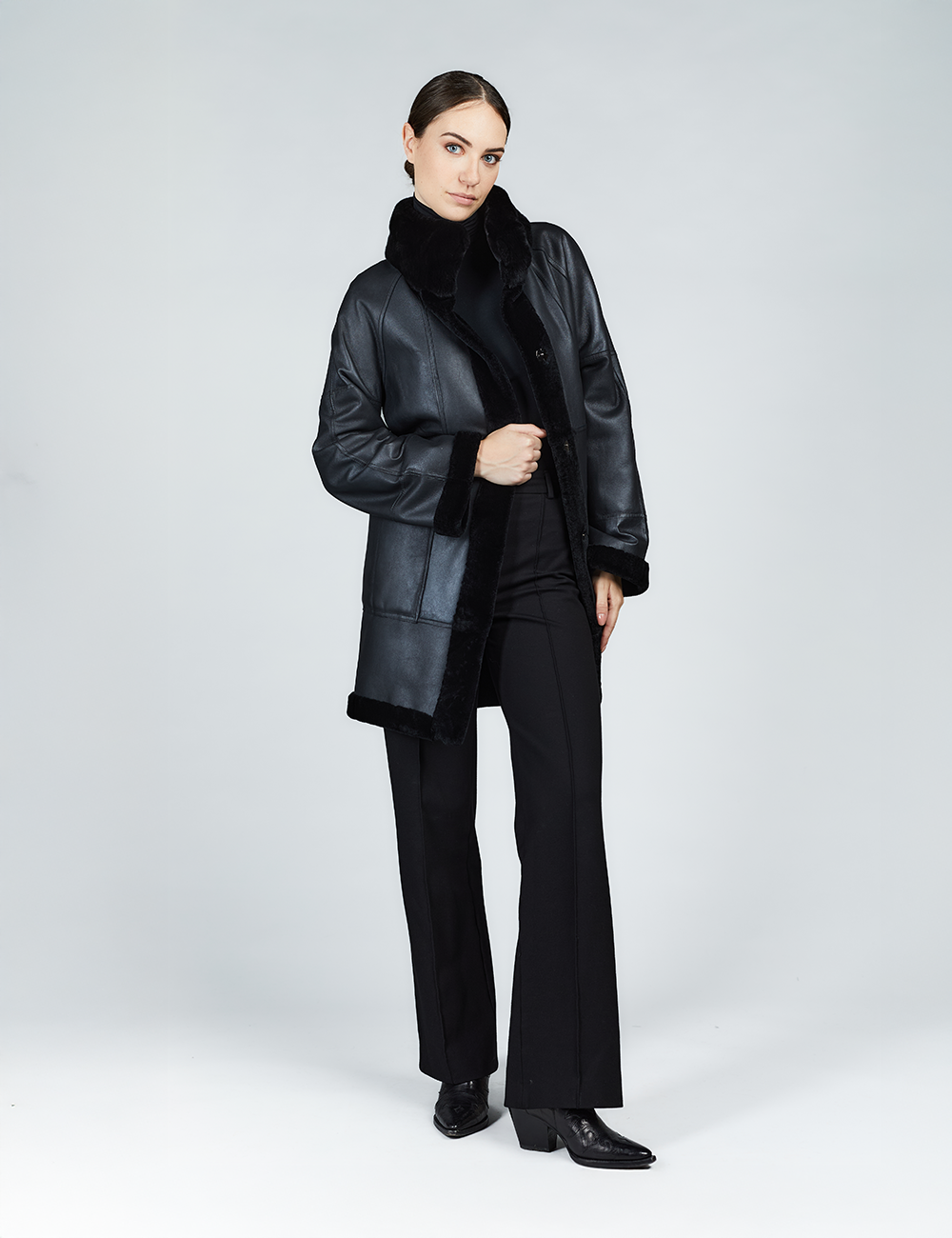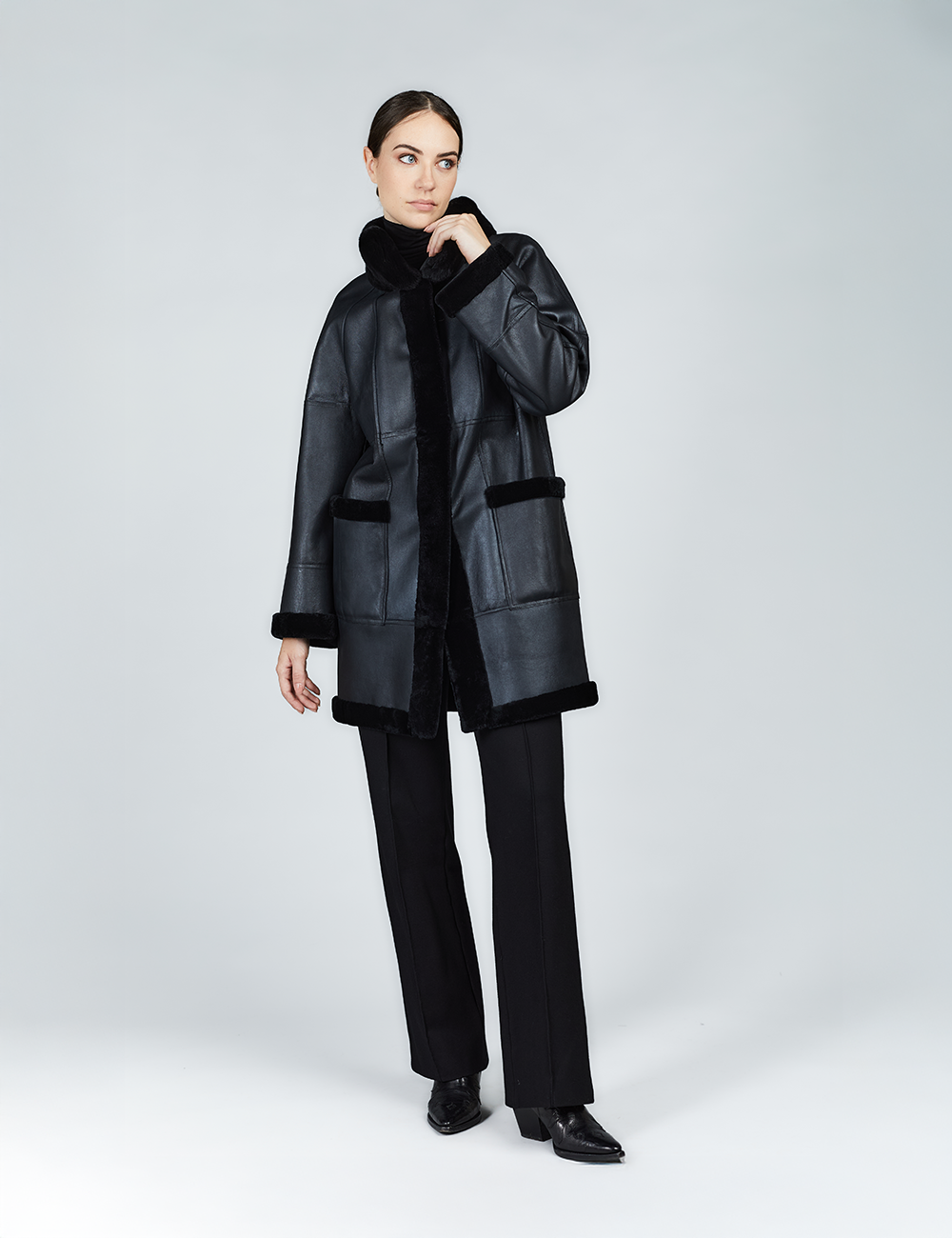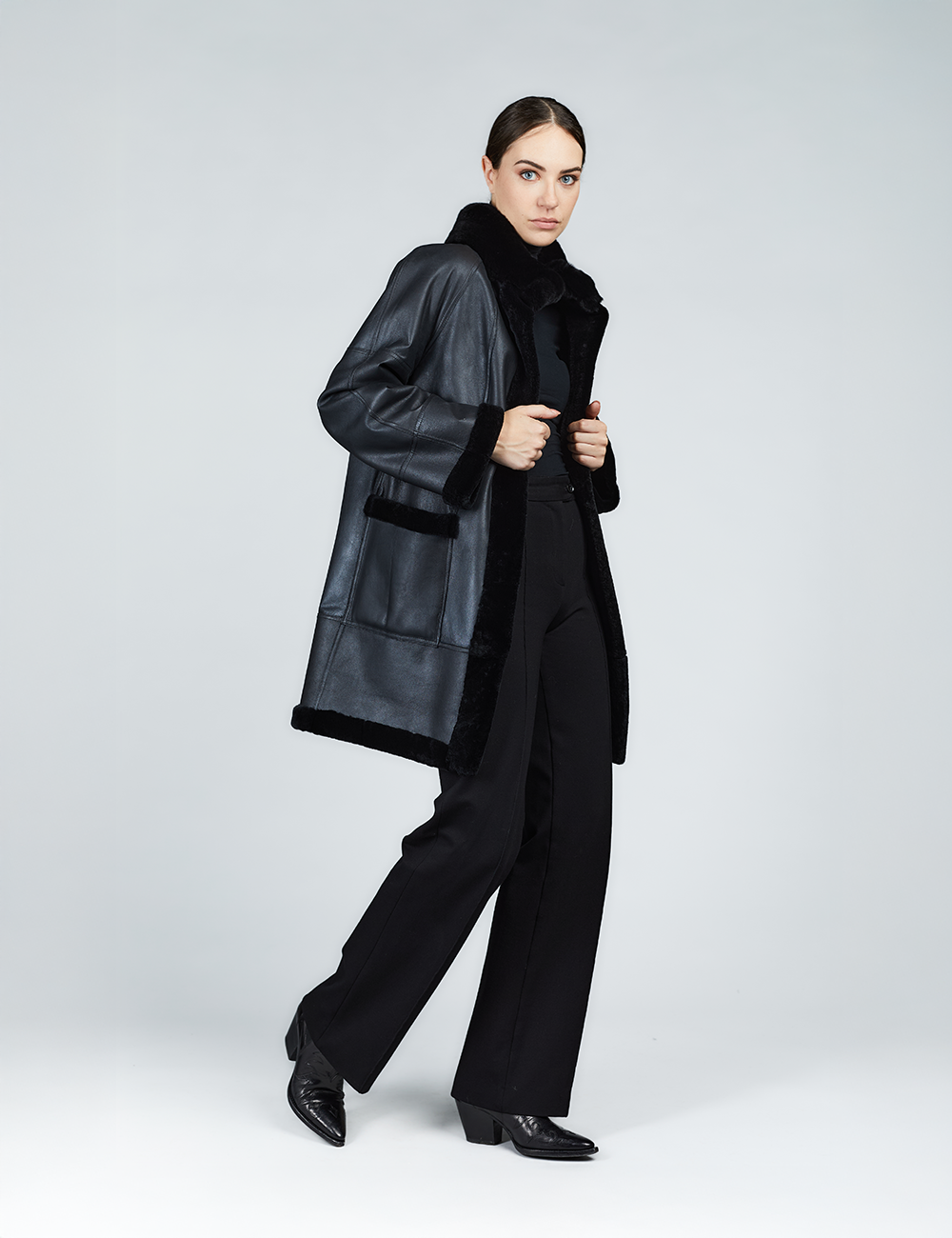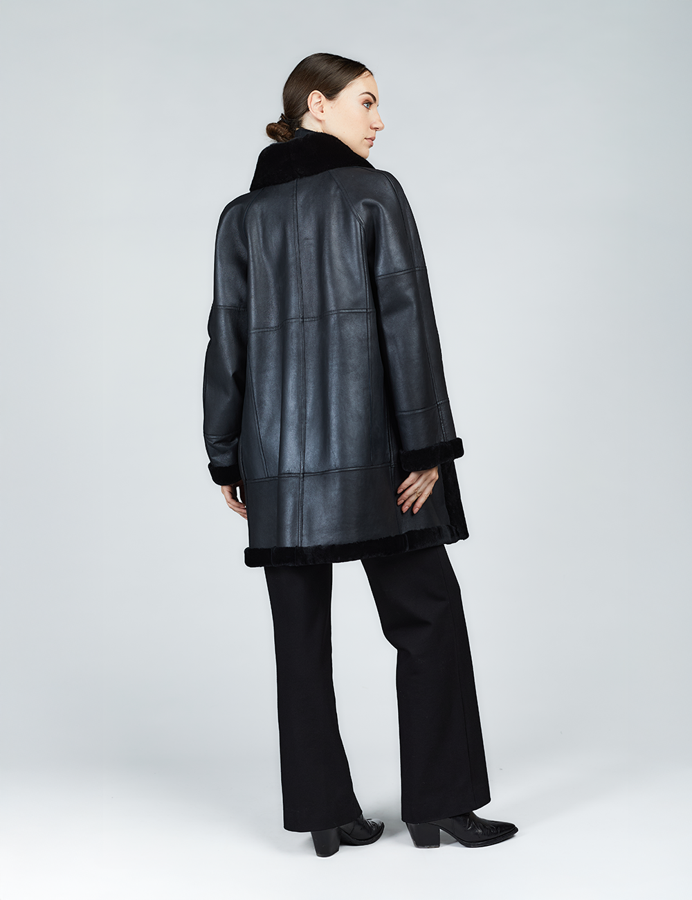 Cappotto in rex reversibile con collo alto nero 85 cm