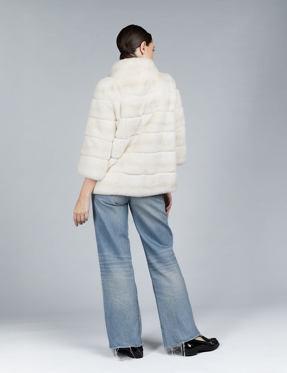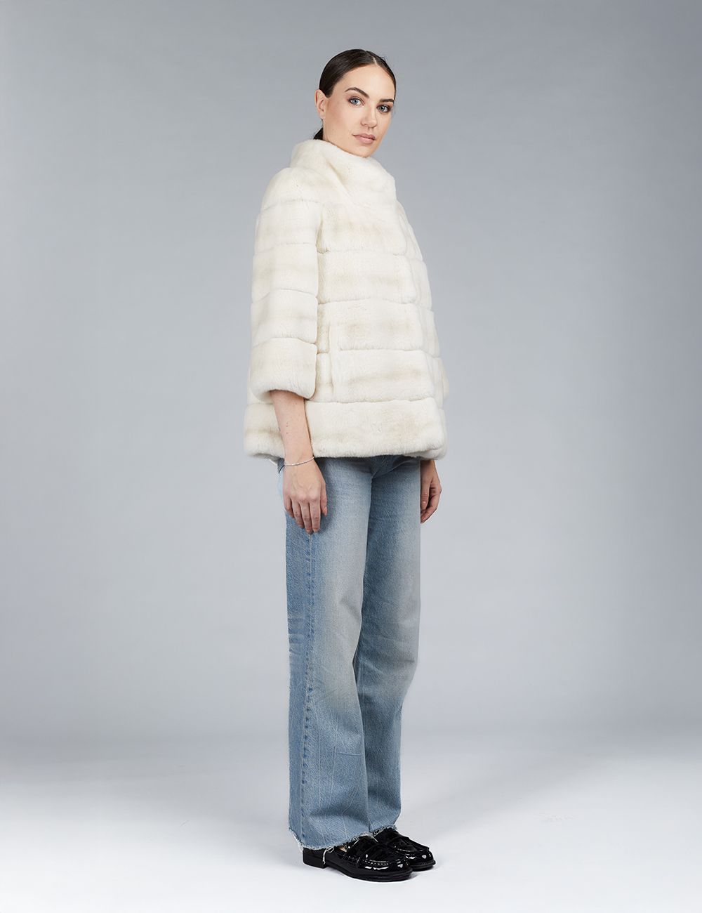 Giacca in rex, collo alto, lavorazione orizzontale, chiusura a ganci,bianco, 60cm