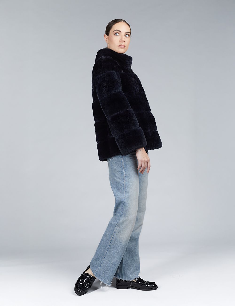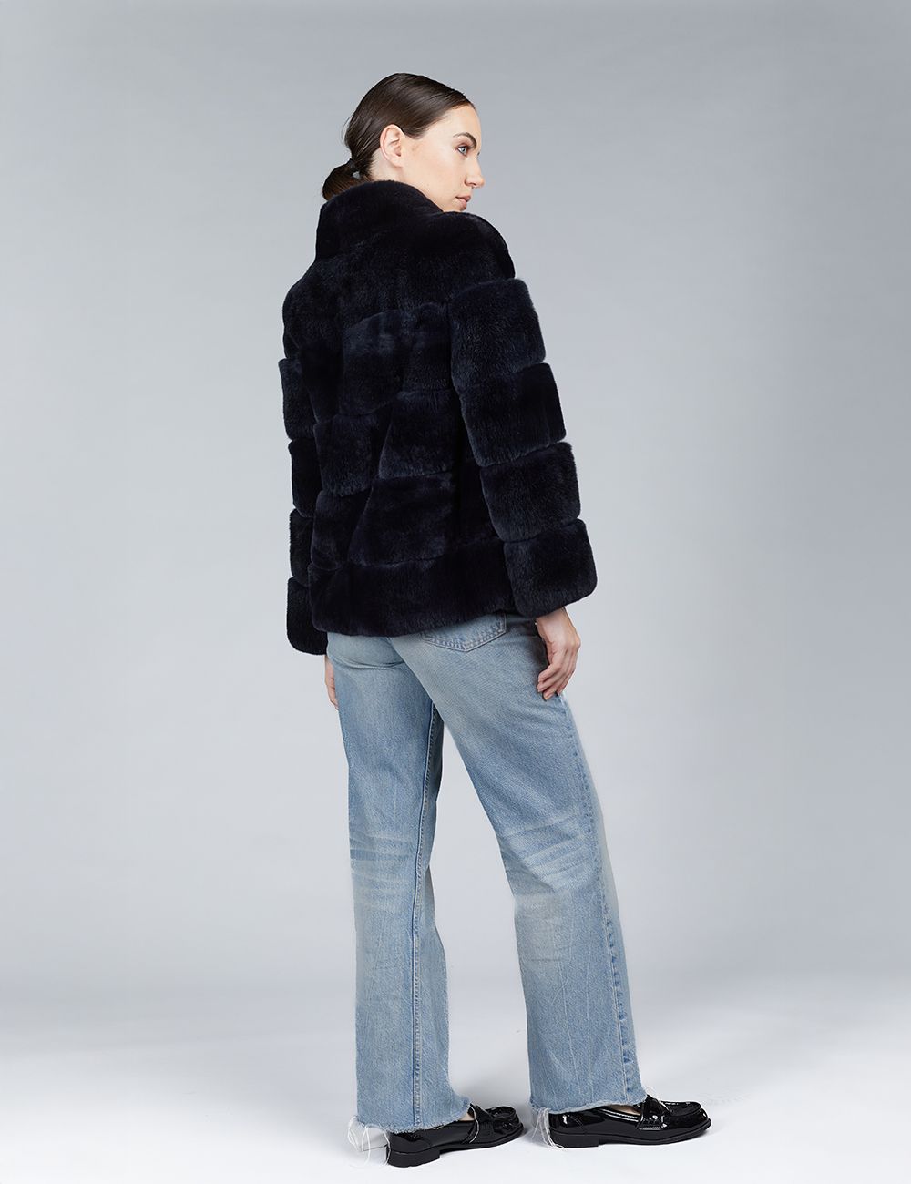 Giacca in rex, collo alto, lavorazione orizzontale, chiusura a ganci, blu notte, 60cm