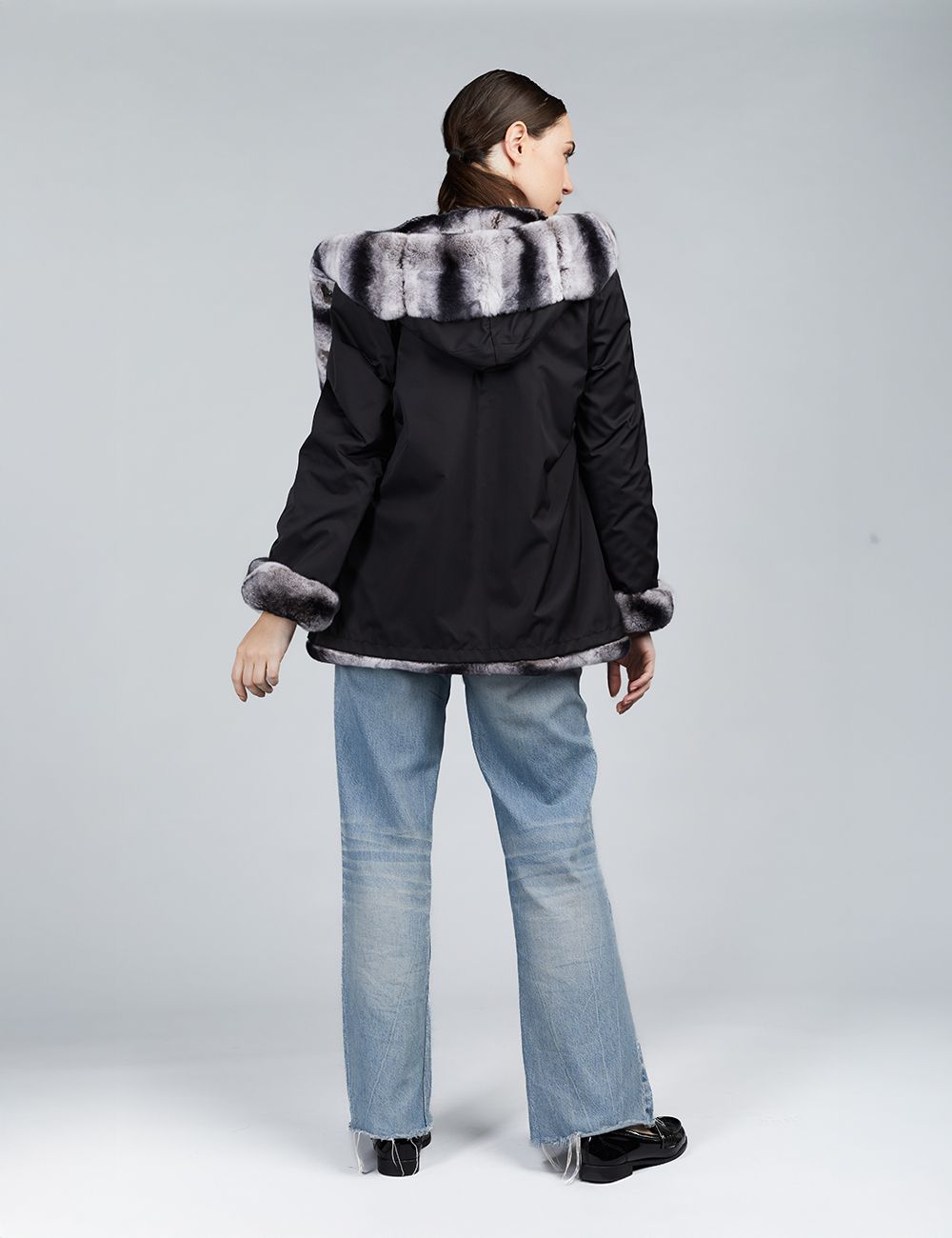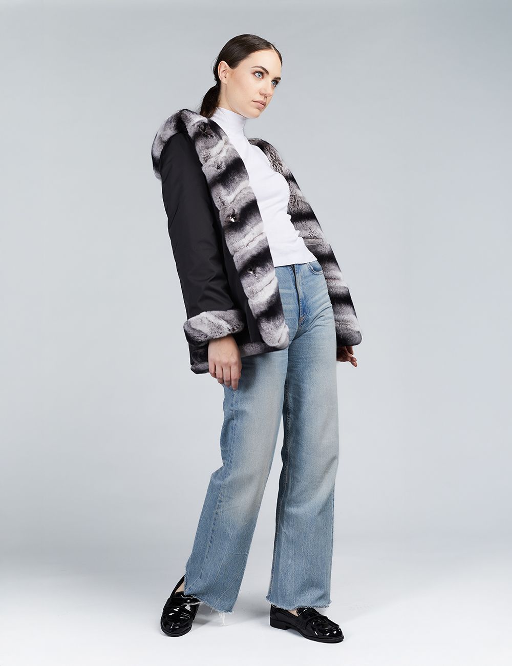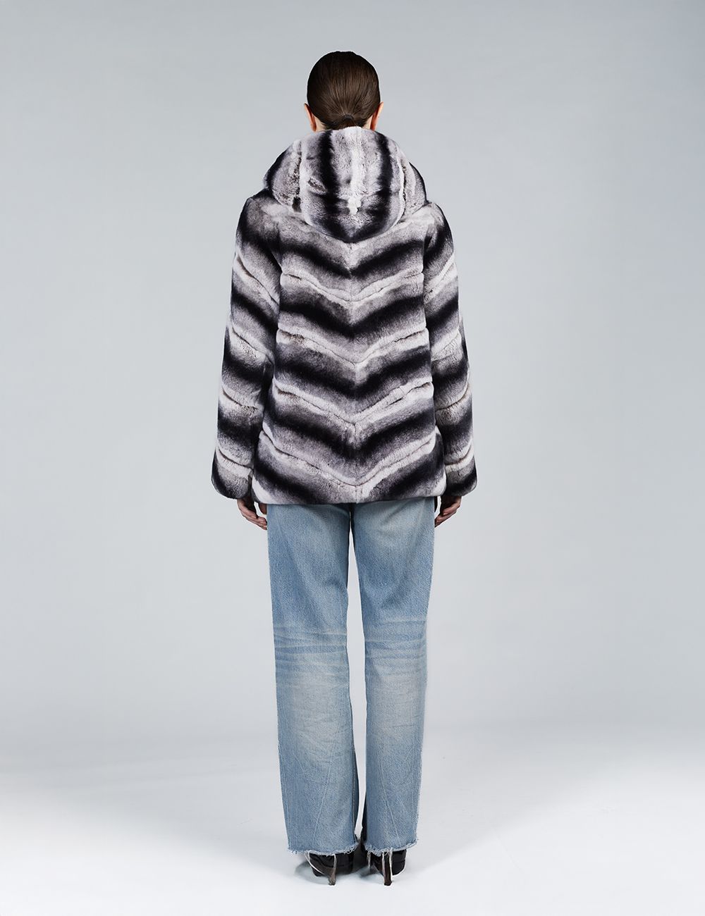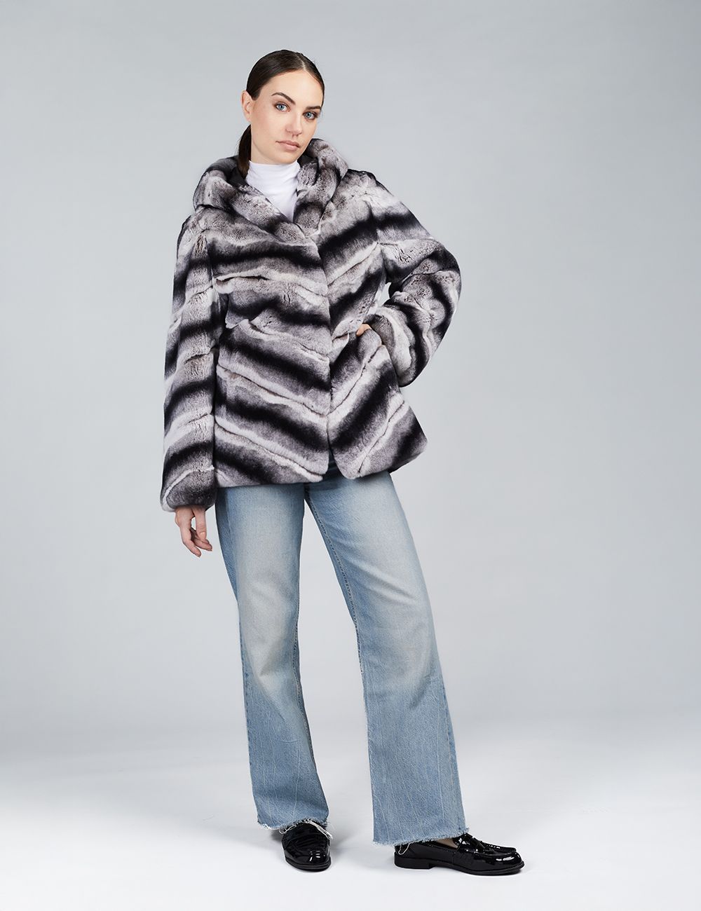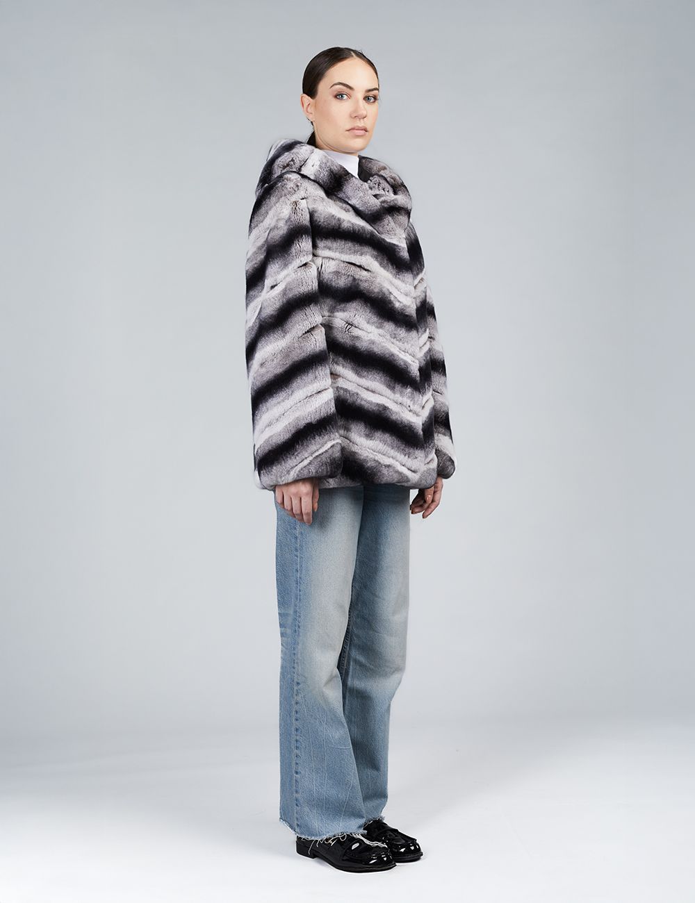 Giacca corta in rex reversibile con cappuccio a righe 70cm