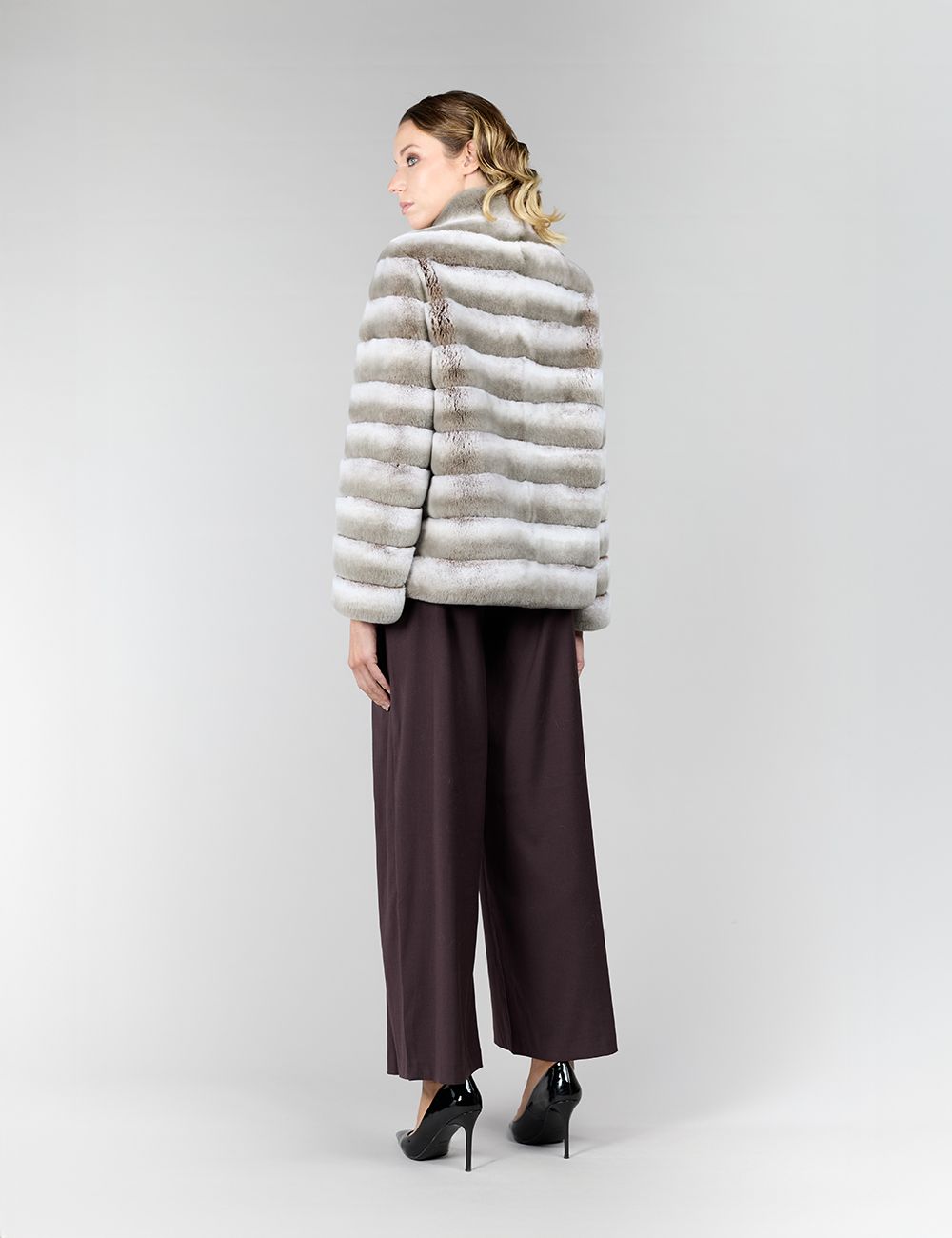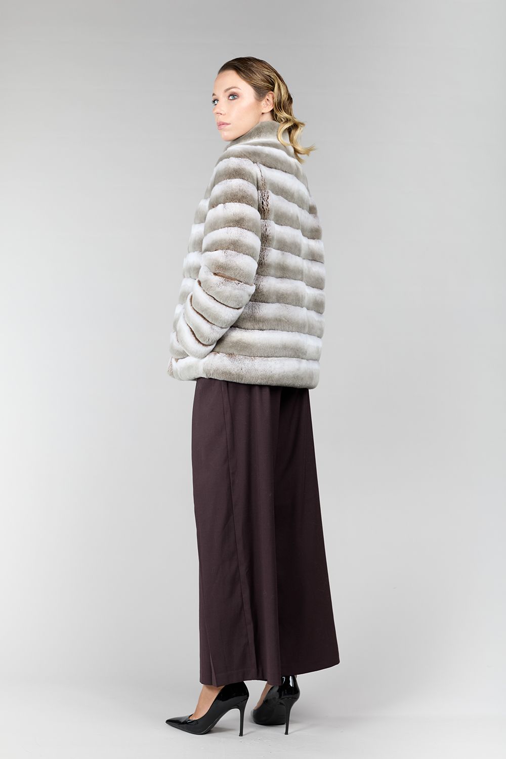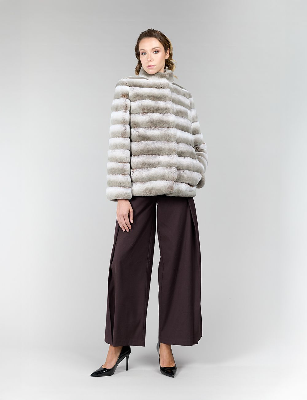 Giacca in rex con collo a listino, linea dritta e sofisticata, maniche lunghe e chiusura nascosta, colore violet, 65 cm