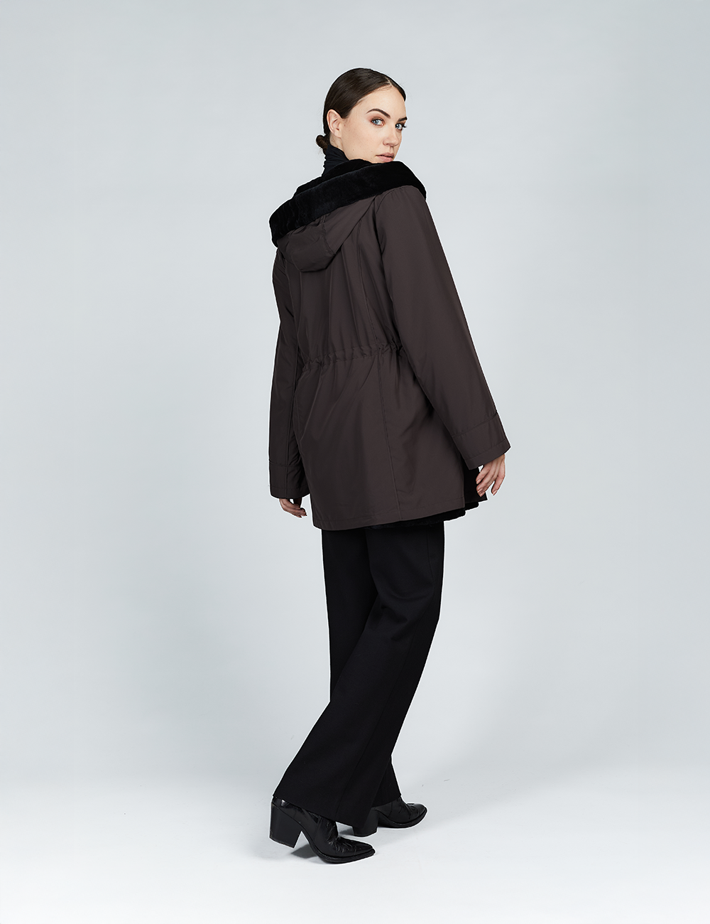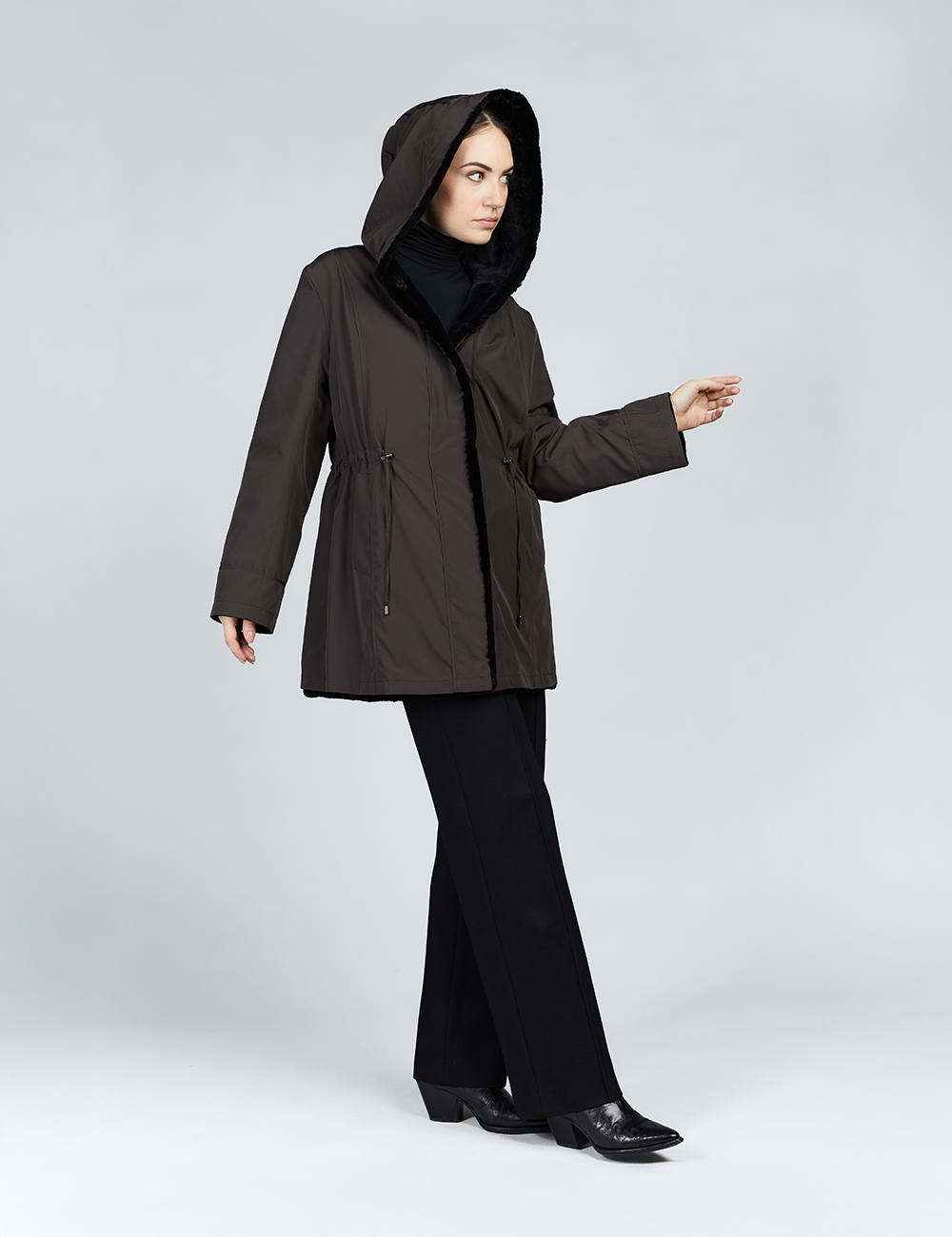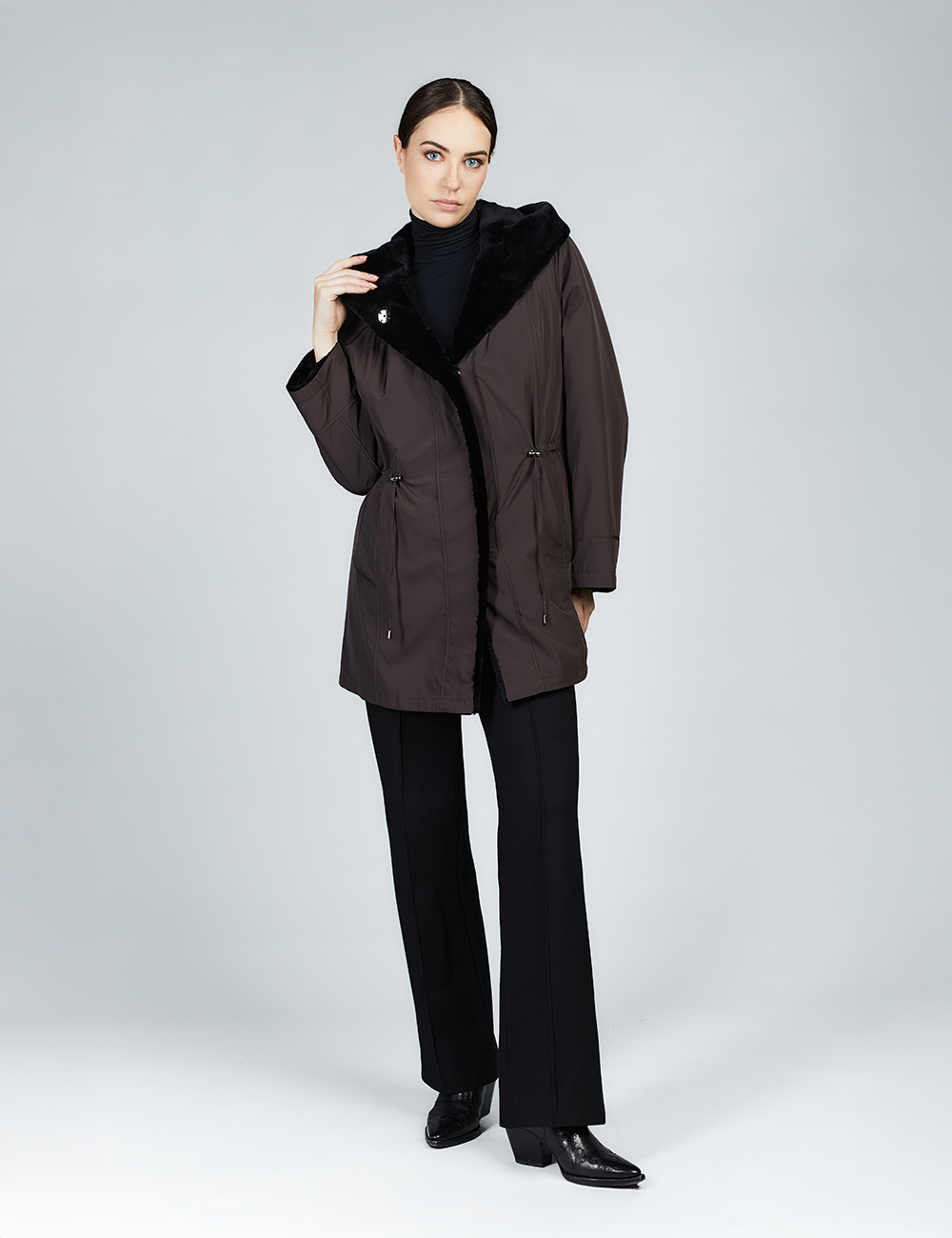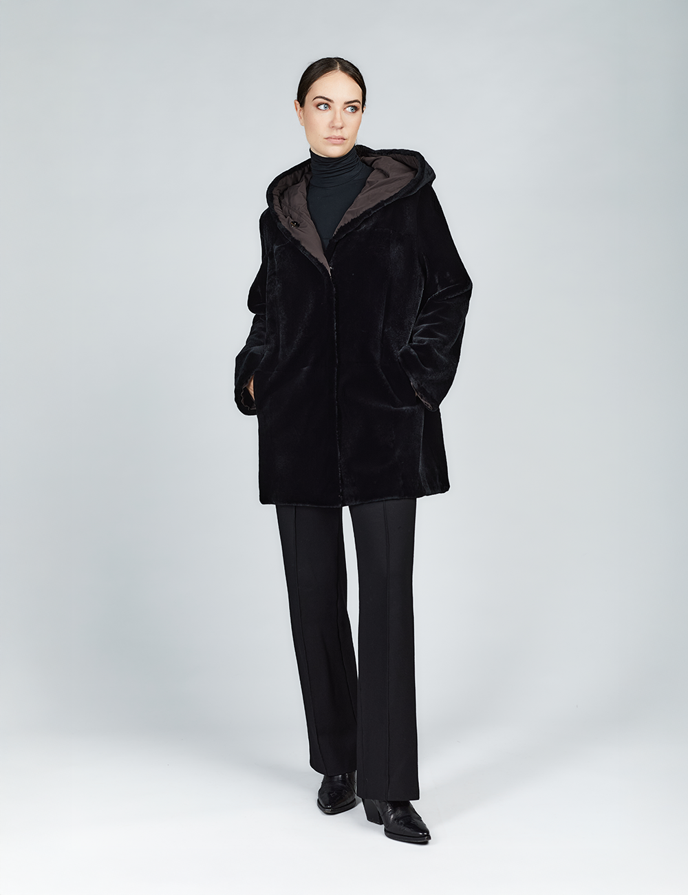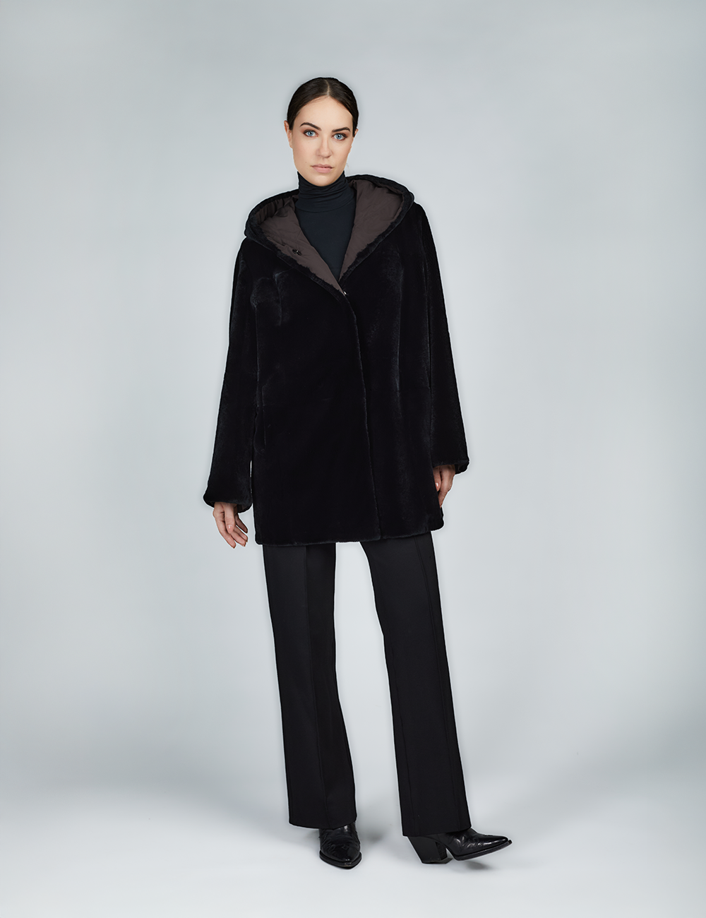 Giacca in rex reversibile con cappuccio nero 80 cm