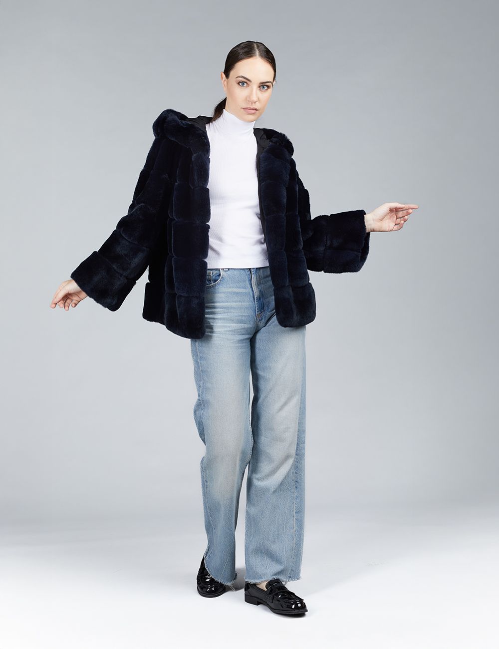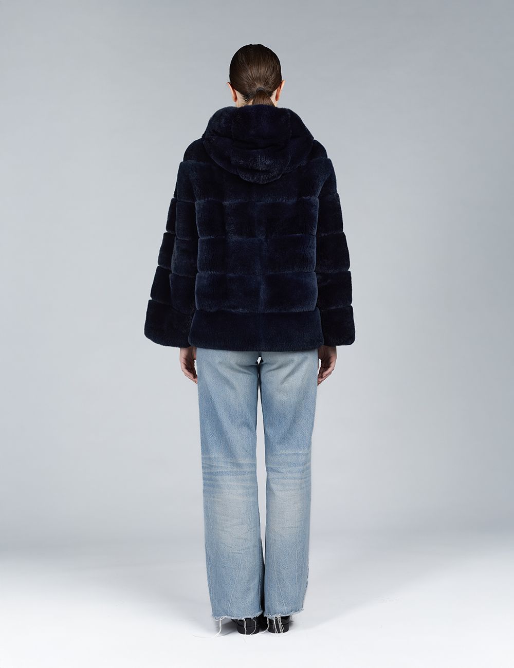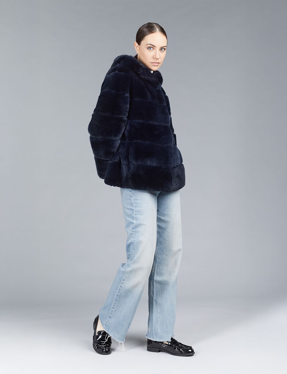 Giacca oversized in rex con cappuccio blu notte 65cm