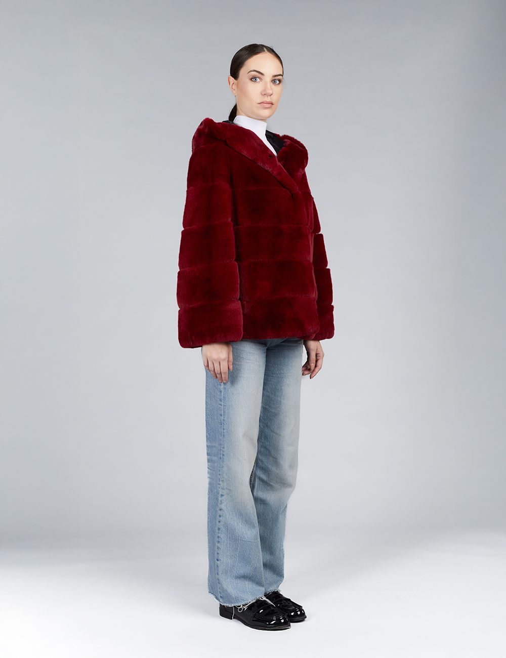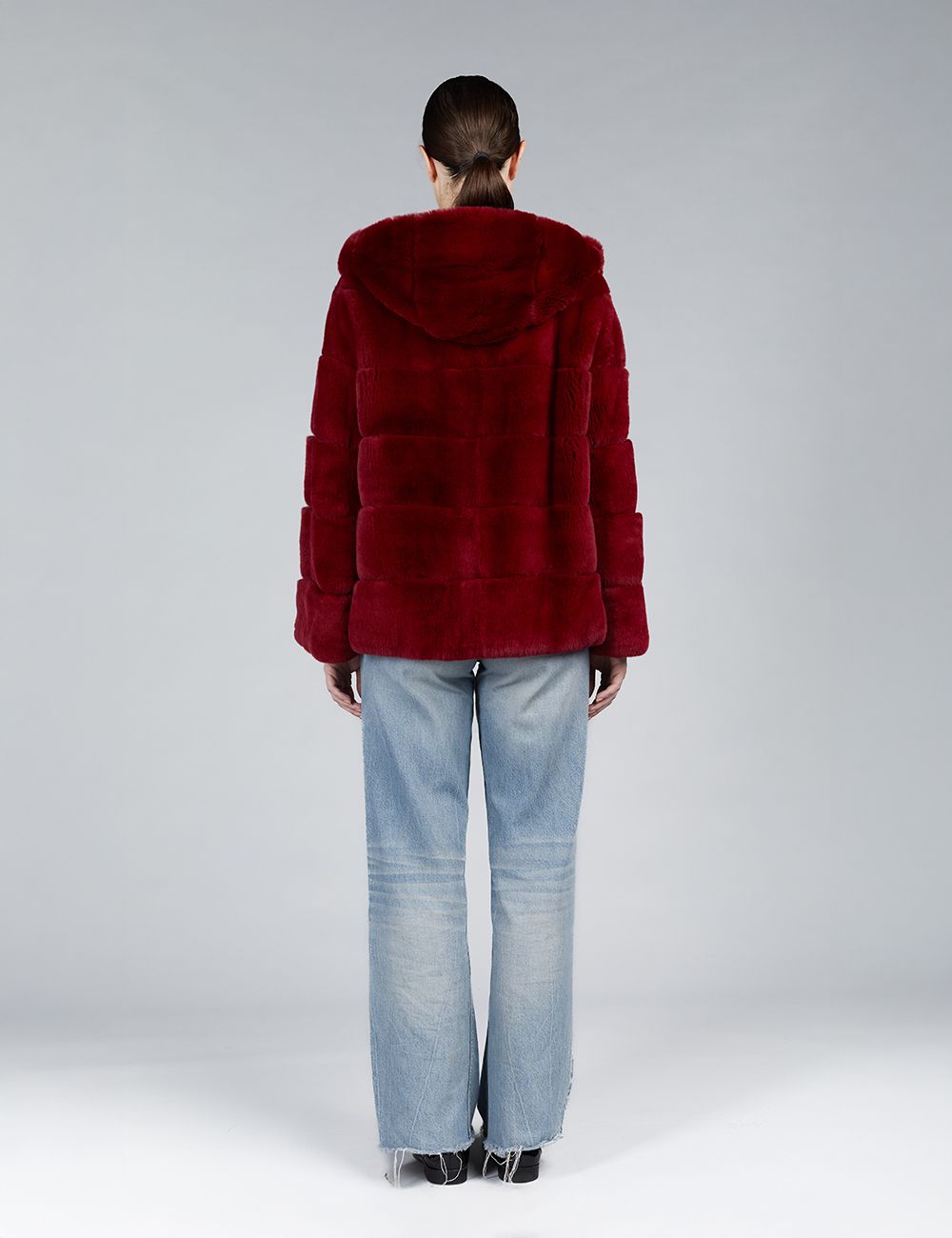 Giacca oversized in rex con cappuccio rosso 65cm