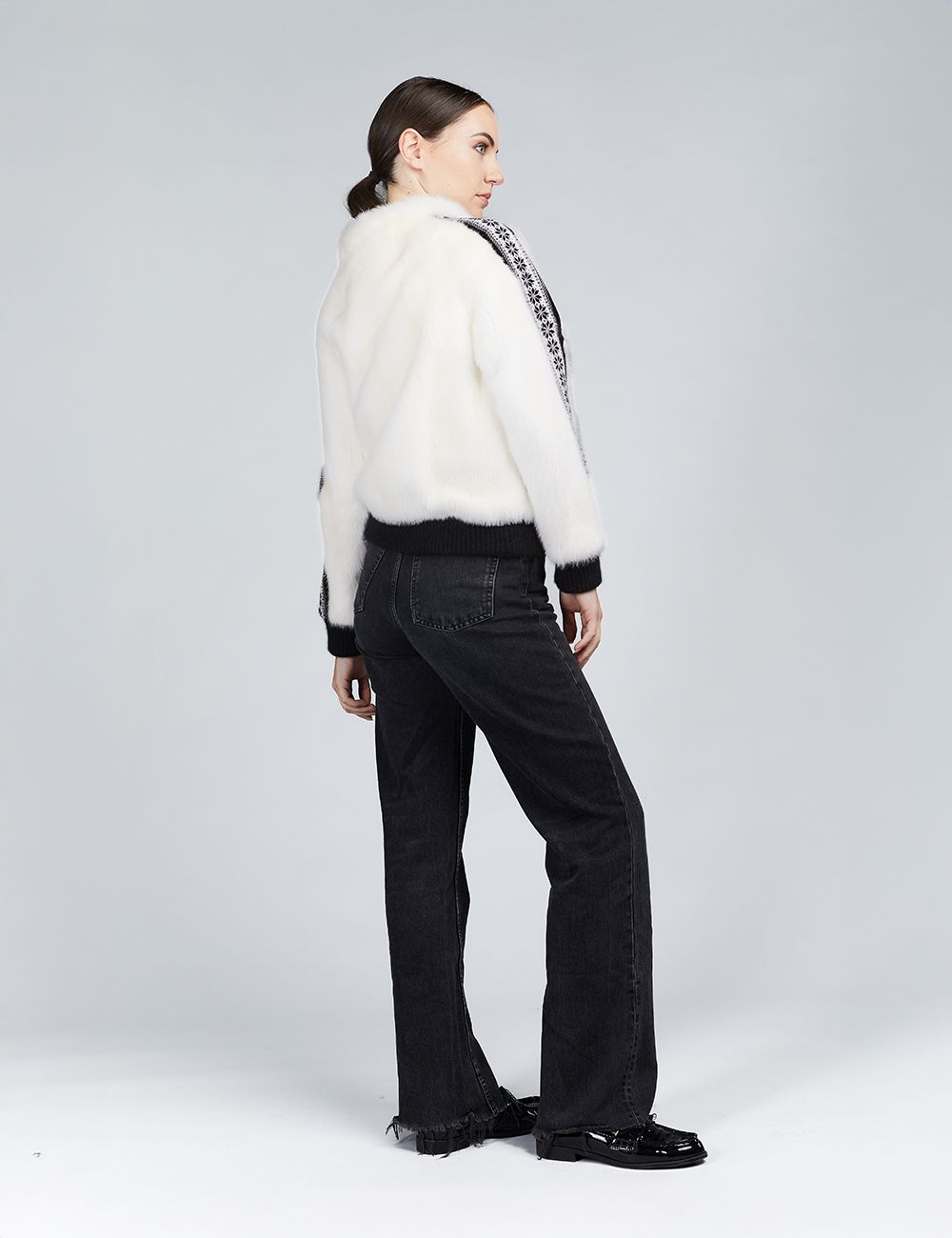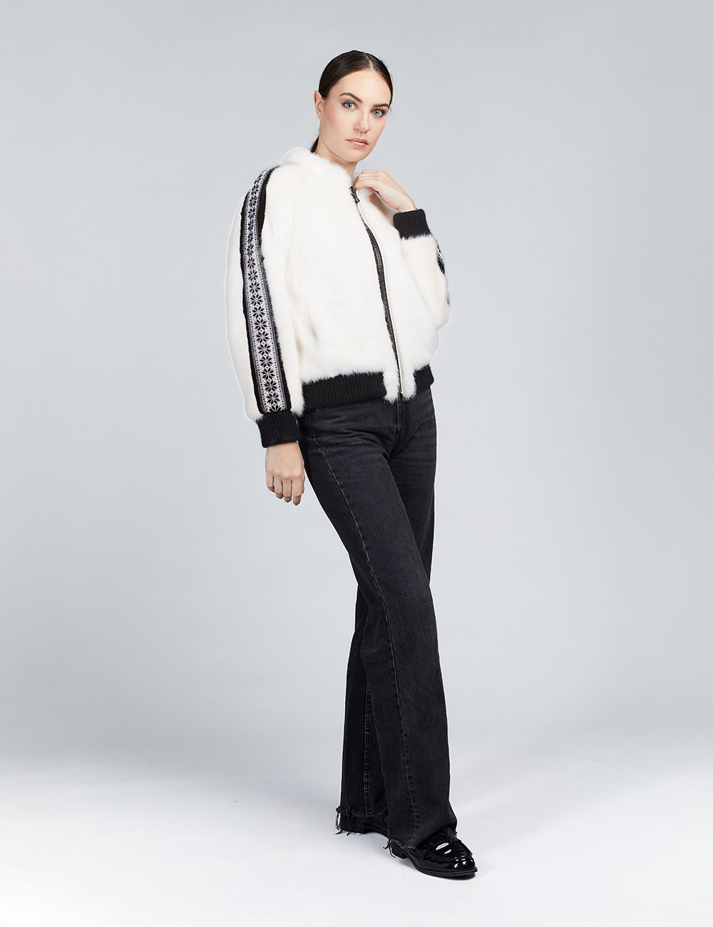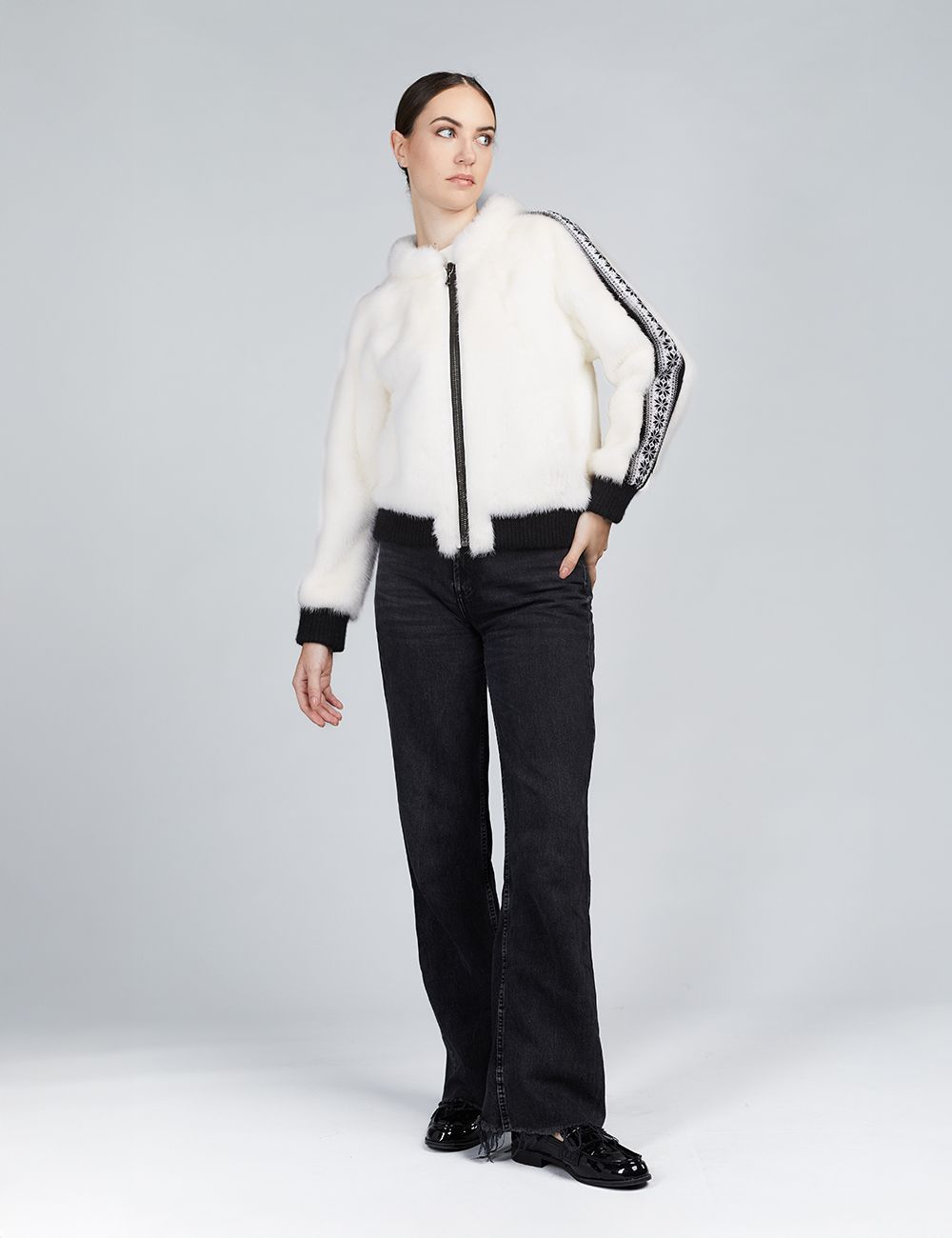 Bomber in visone con chiusura a zip e dettagli in lana bianco 55cm