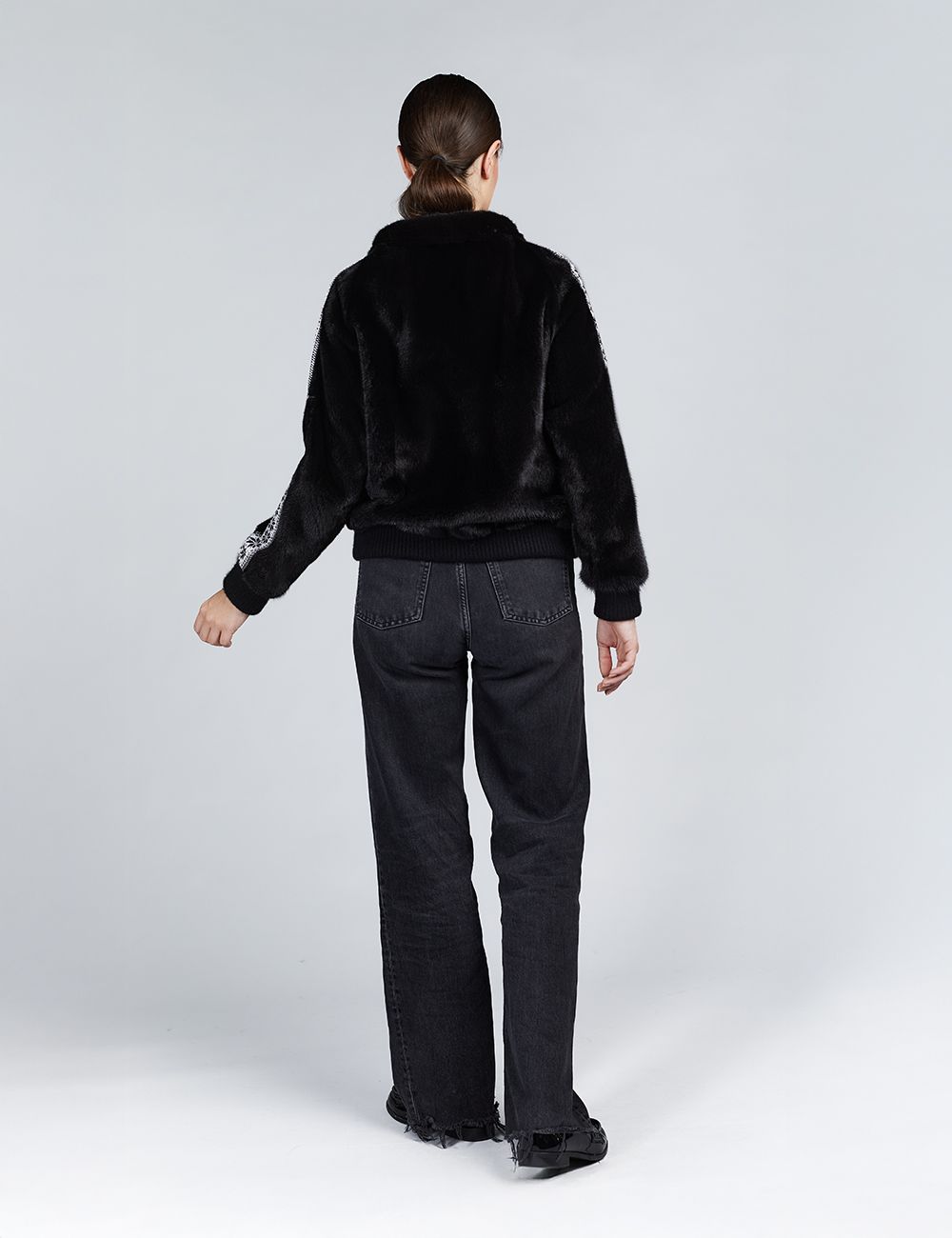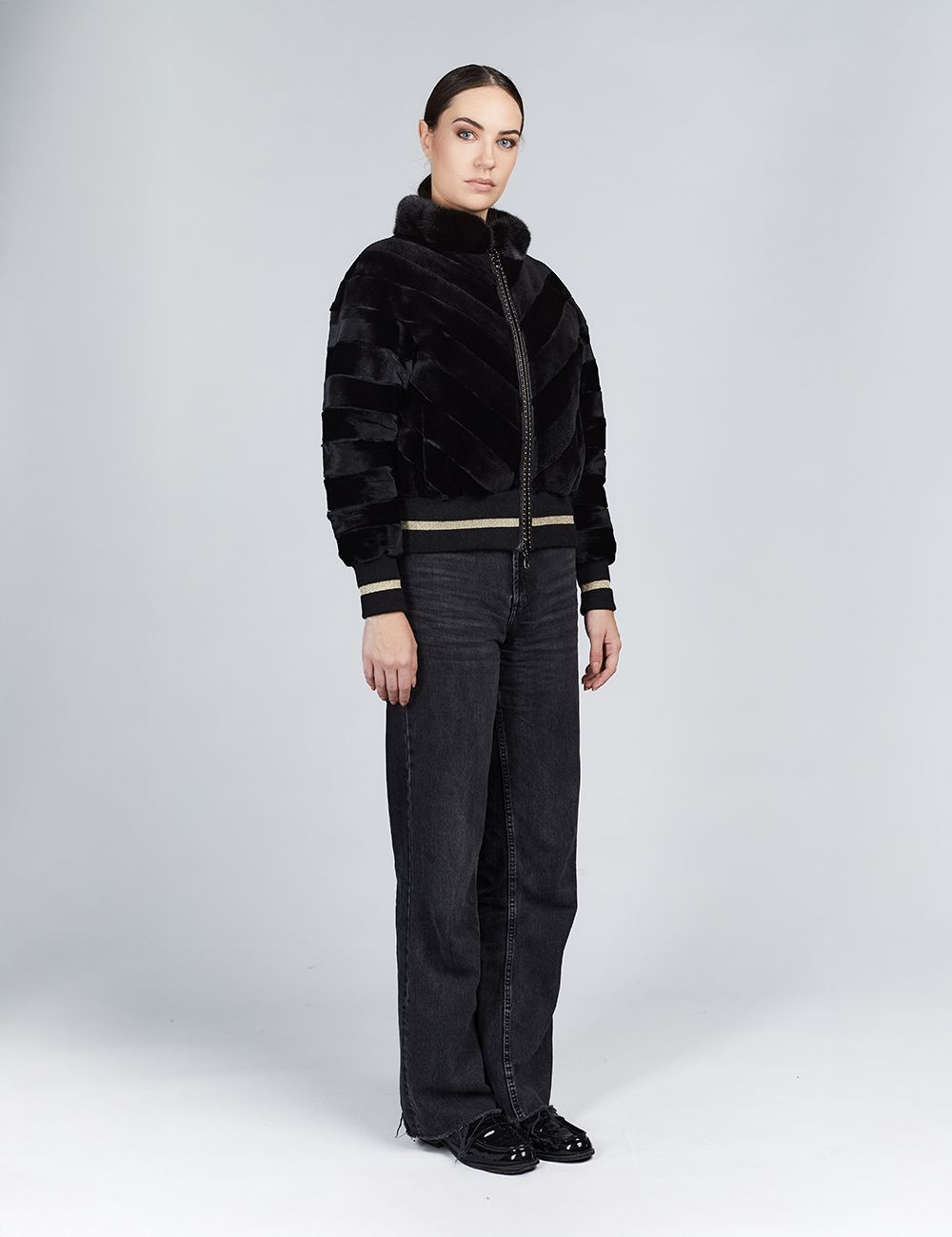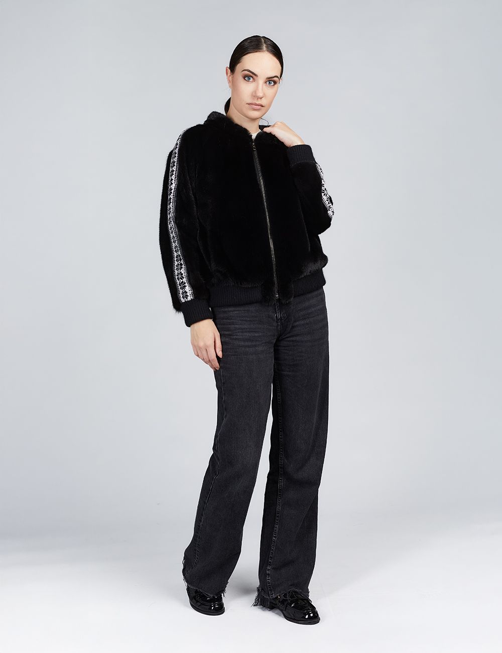 Bomber in visone con chiusura a zip e dettagli in lana nero 55cm