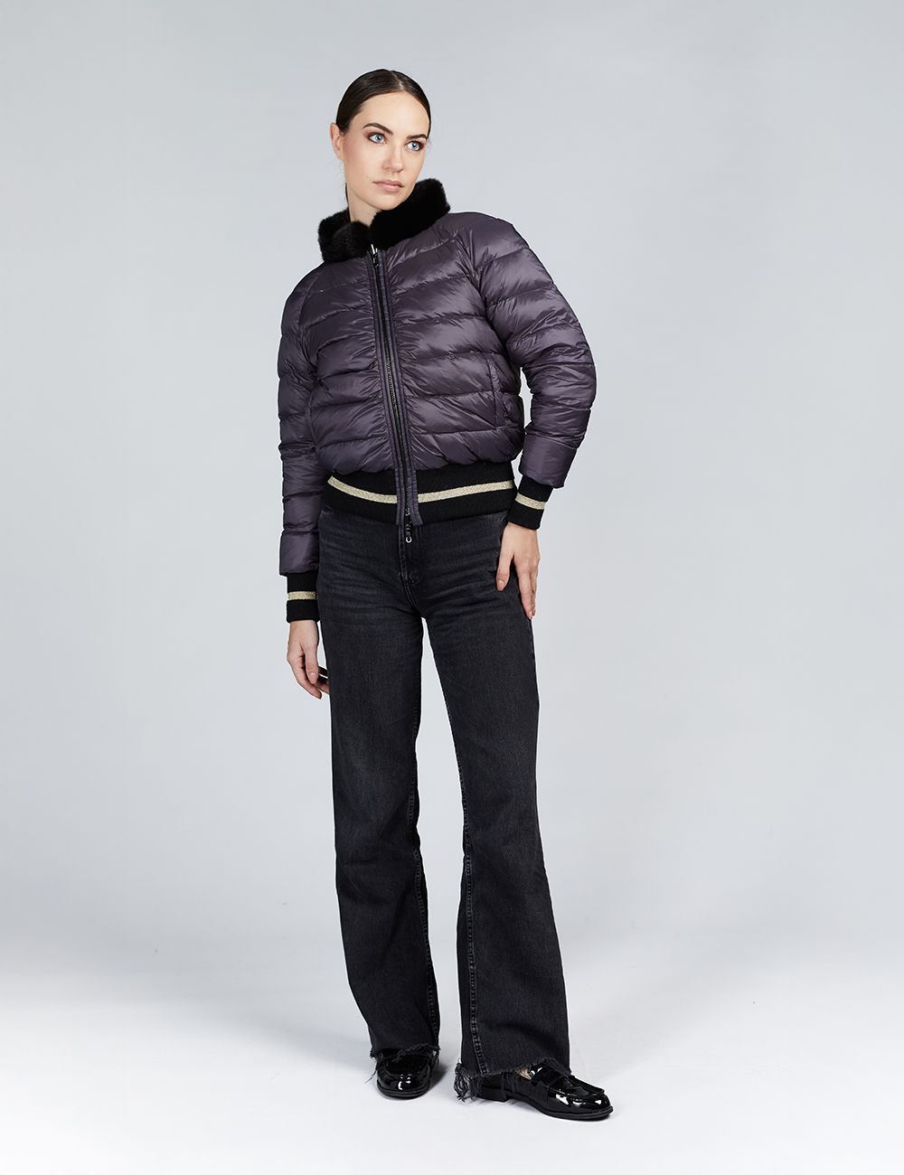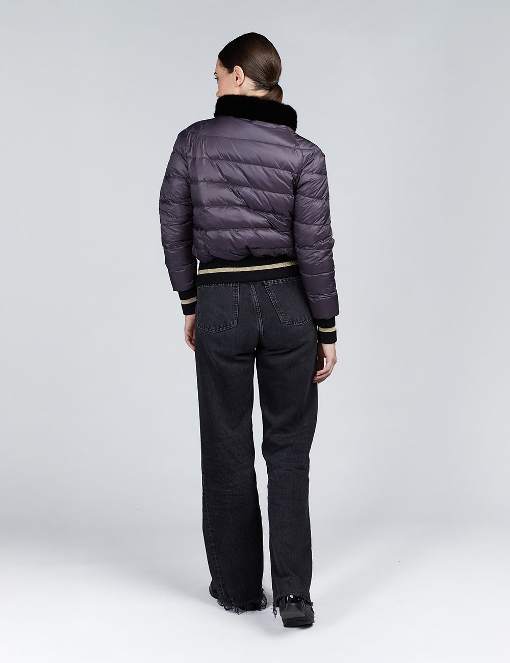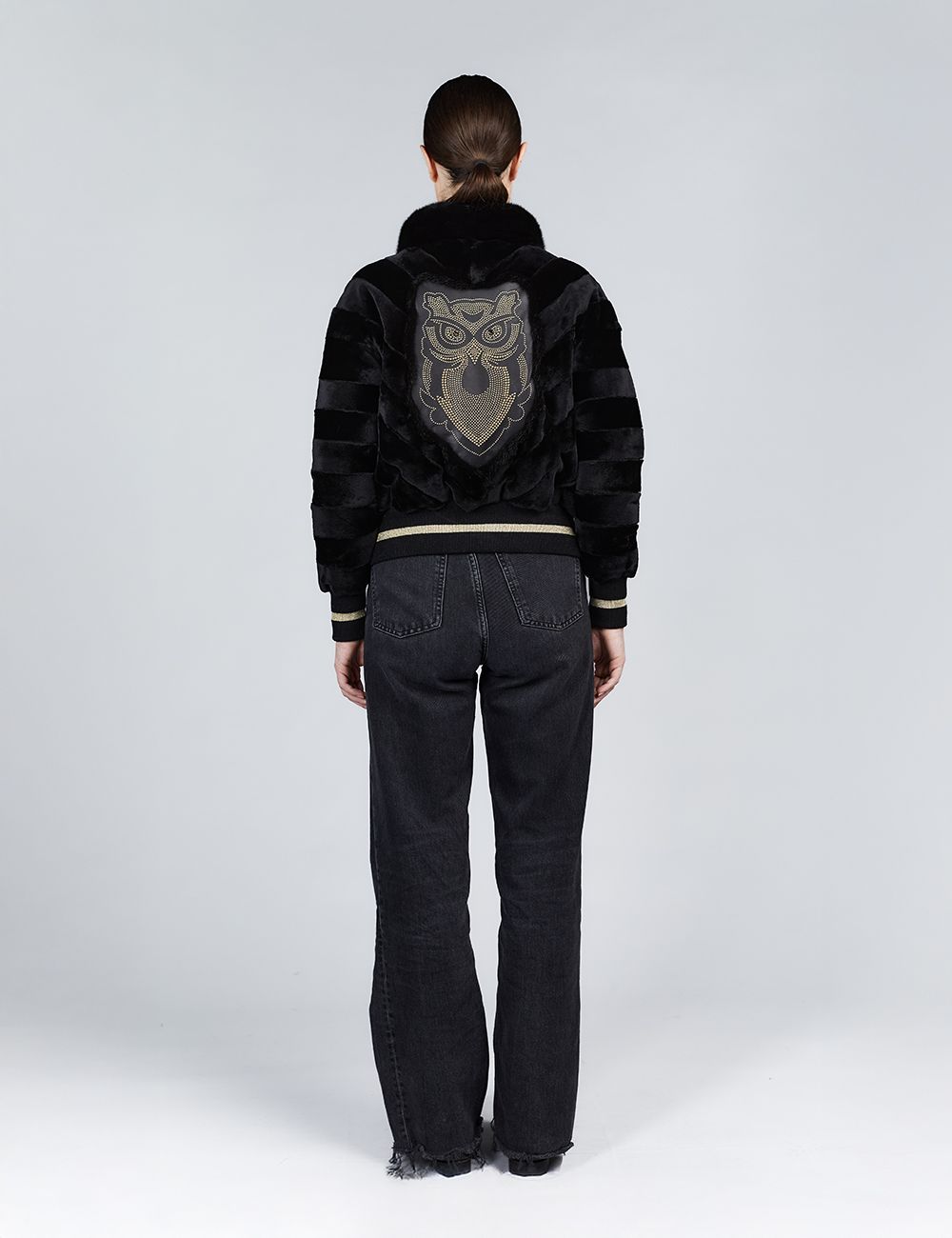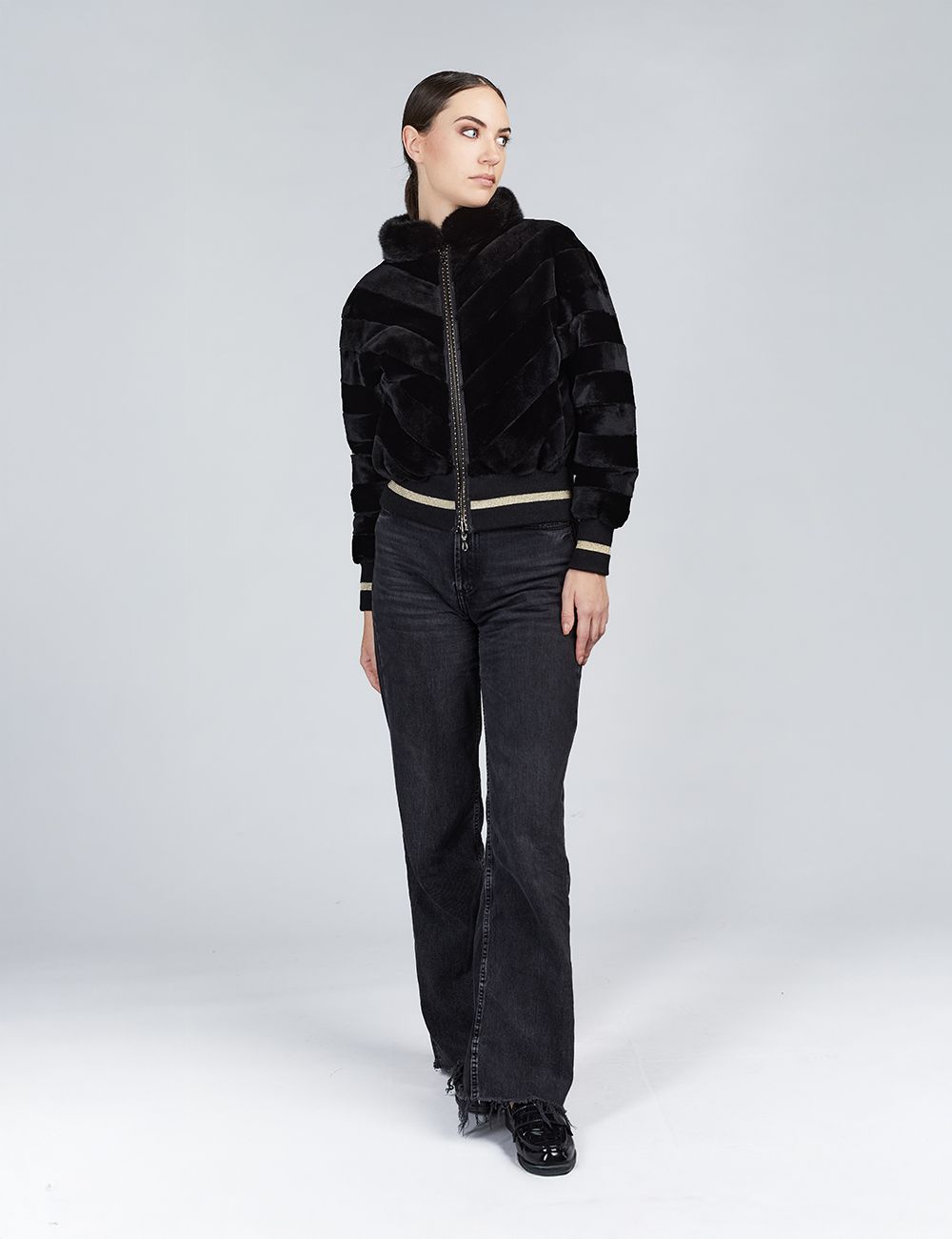 Bomber in visone con zip reversibile ed applicazione sul retro nero 55cm