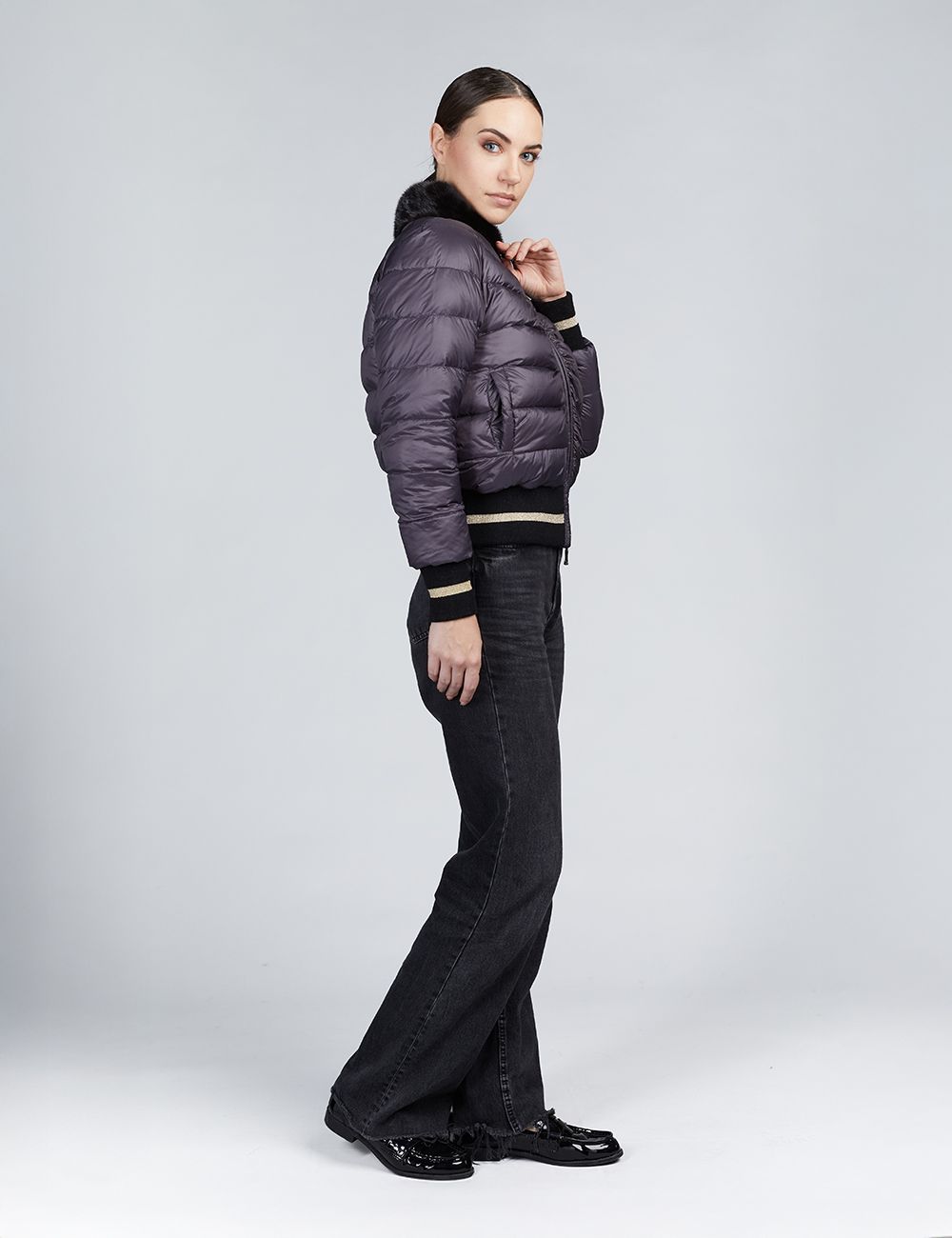 Bomber in visone pelle intera, reversibile con piumino, chiusura a zip, polsini ed elastico in lana merino, applicazione in pelle sul retro, nero,55cm