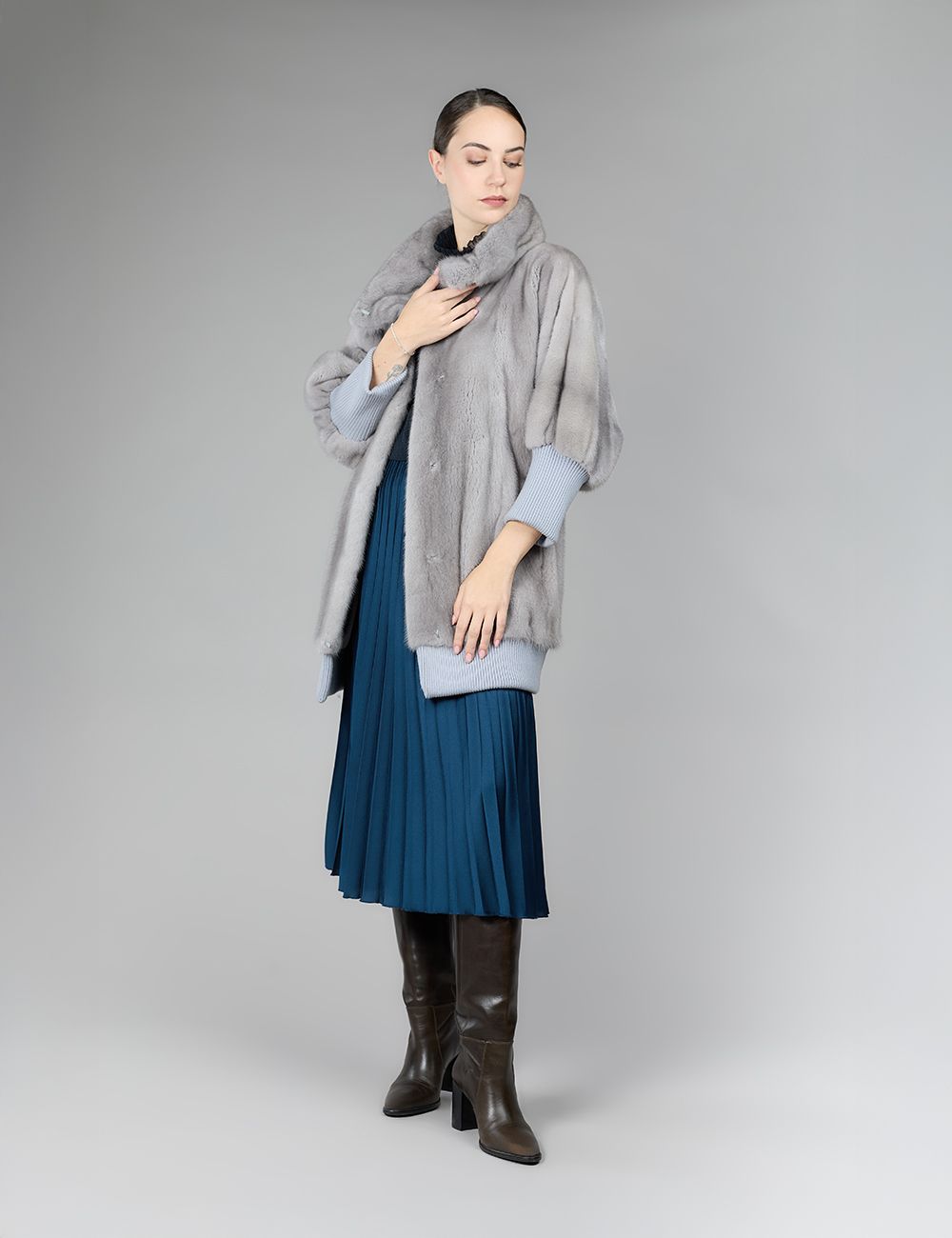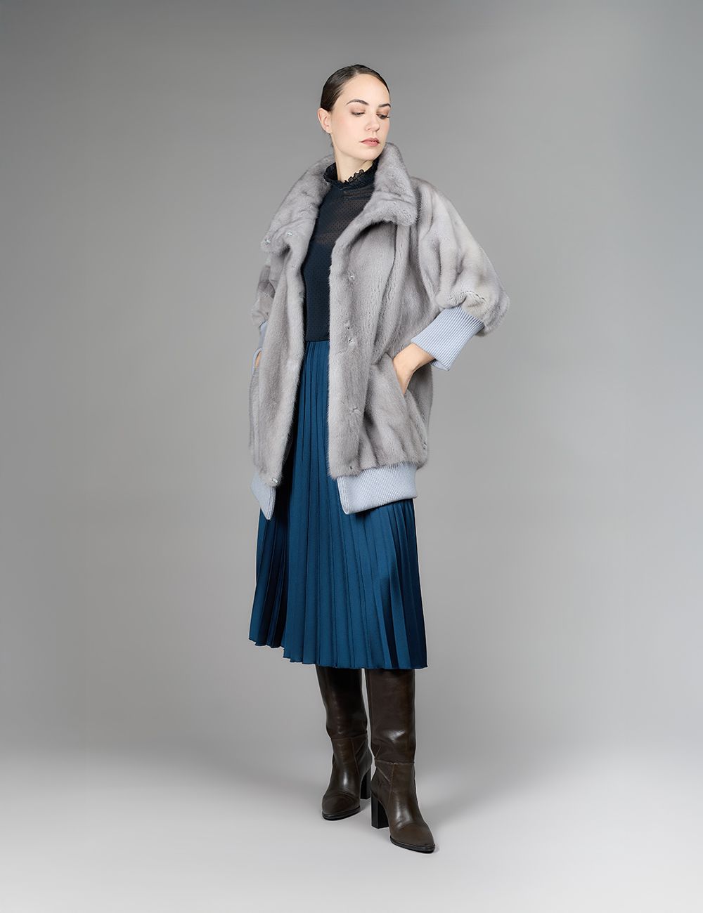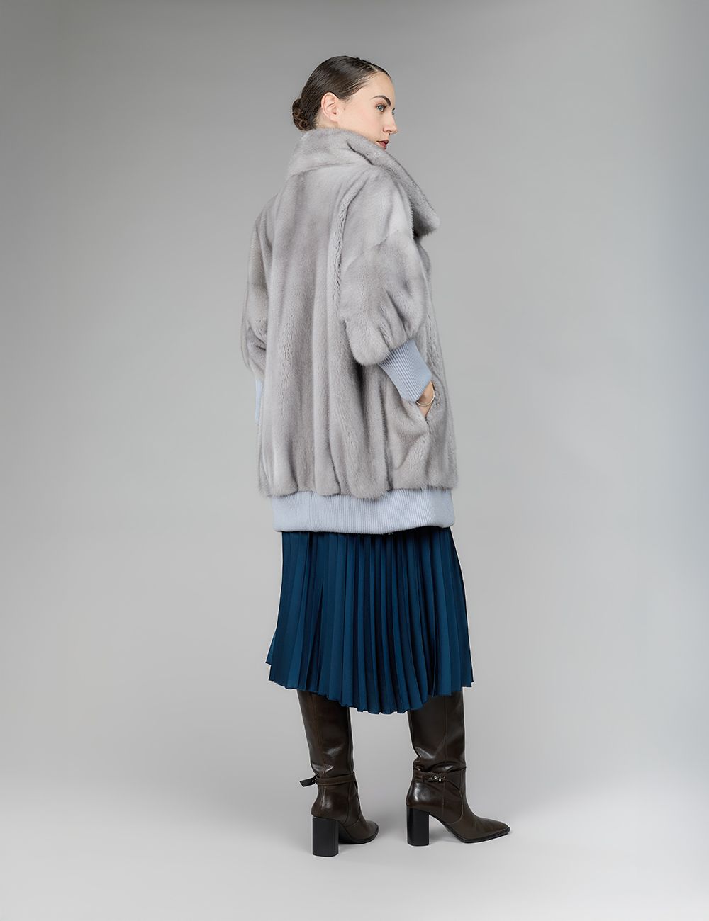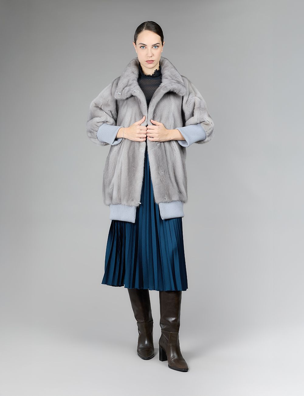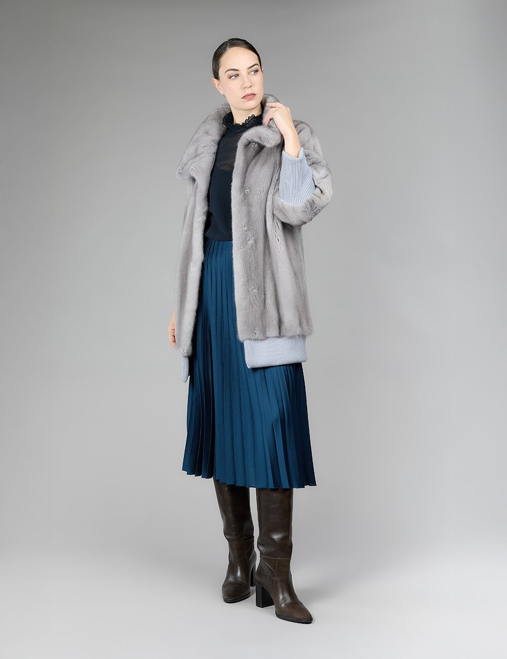 Cappotto di visone, collo alto, polsini e fondo in lana, colore zaffiro, 85 cm