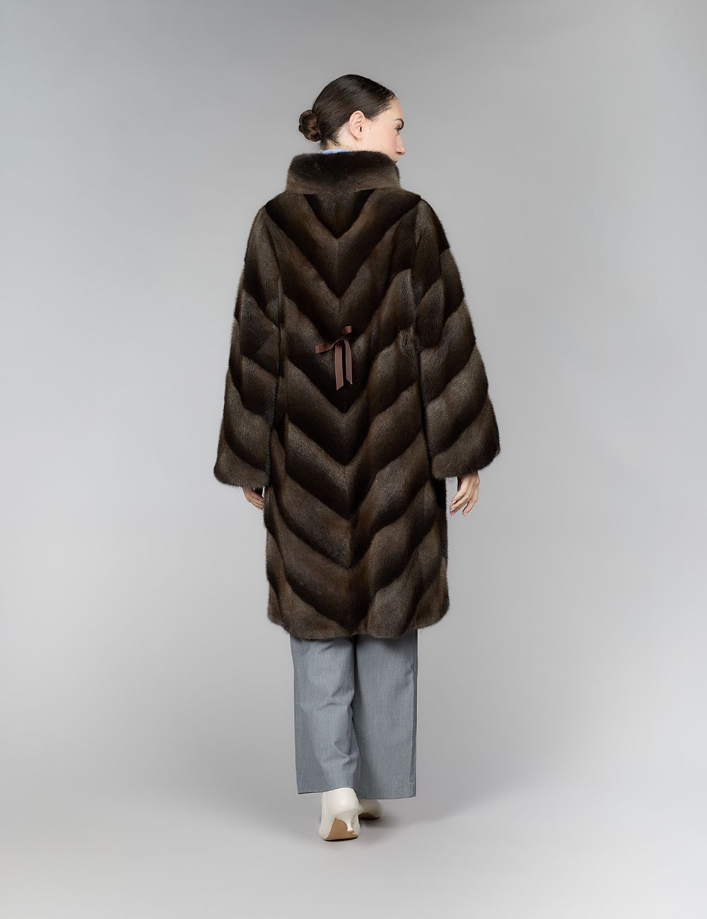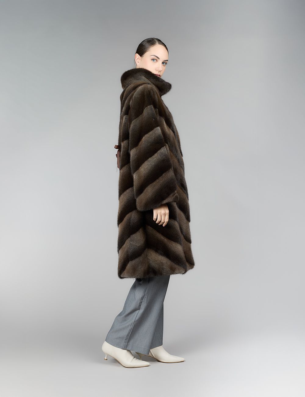 Cappotto di visone, collo alto, lavorazione diagonale, vestibilità ampia, mogano scuro con un morbido gradiente, 105 cm