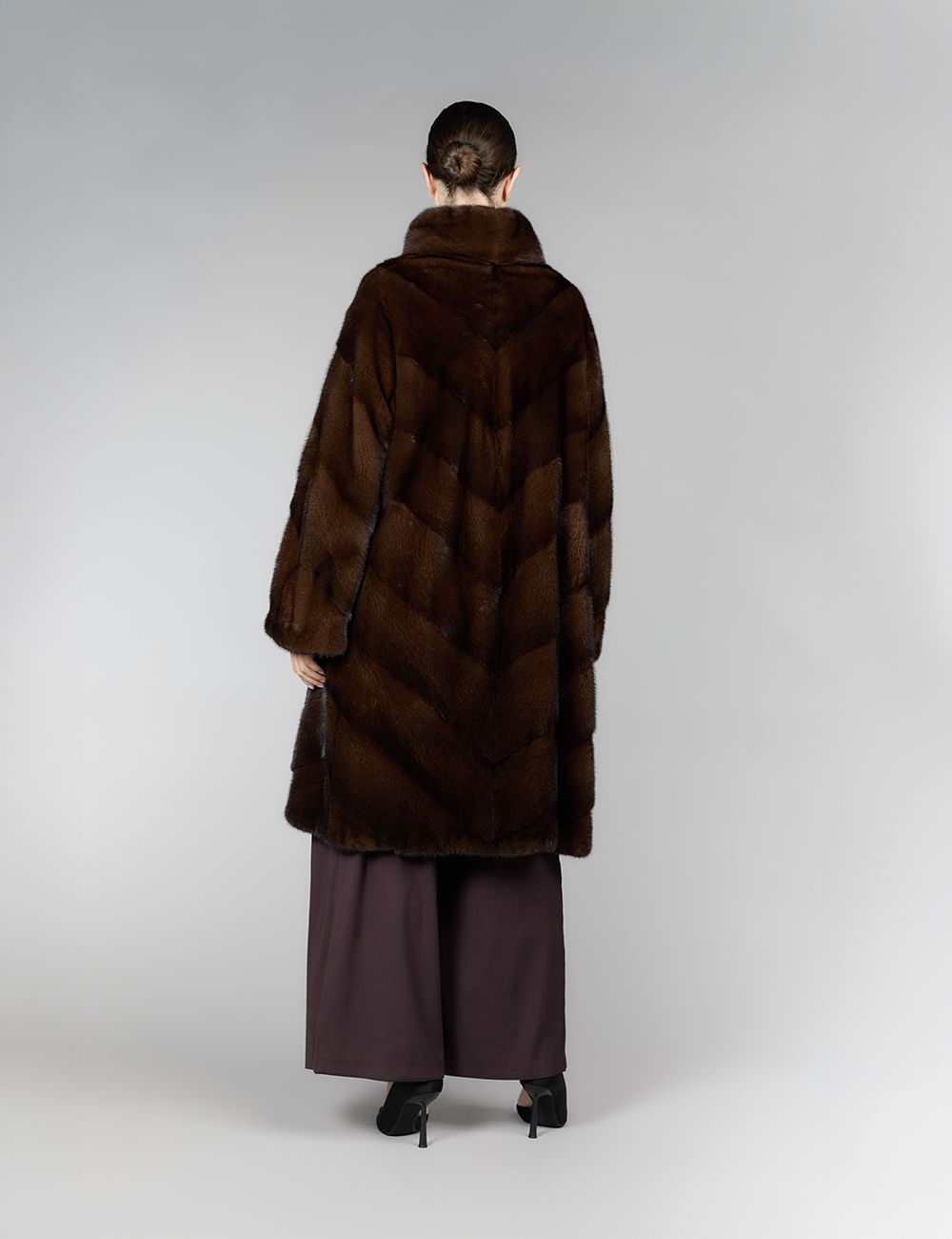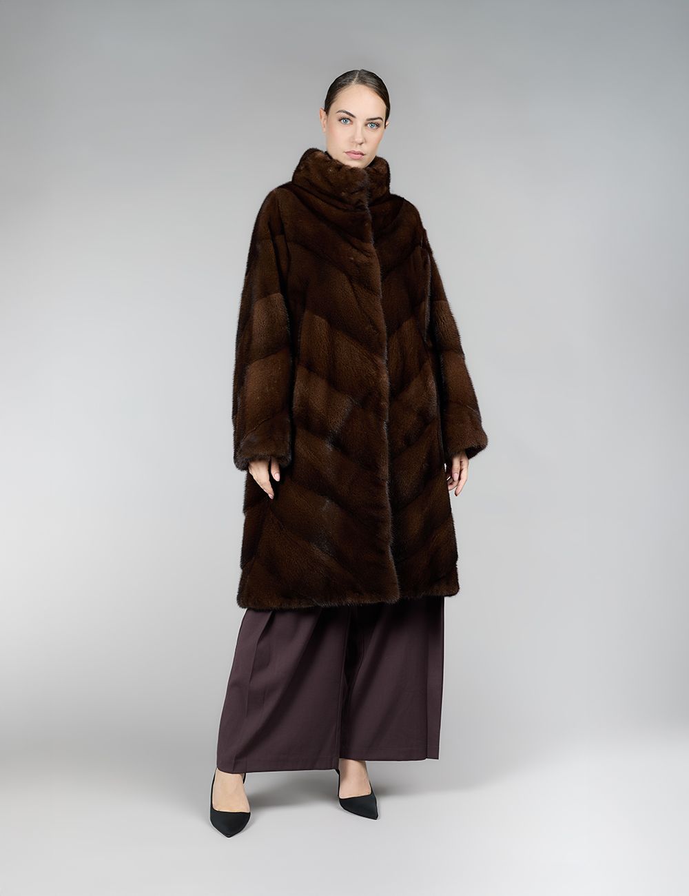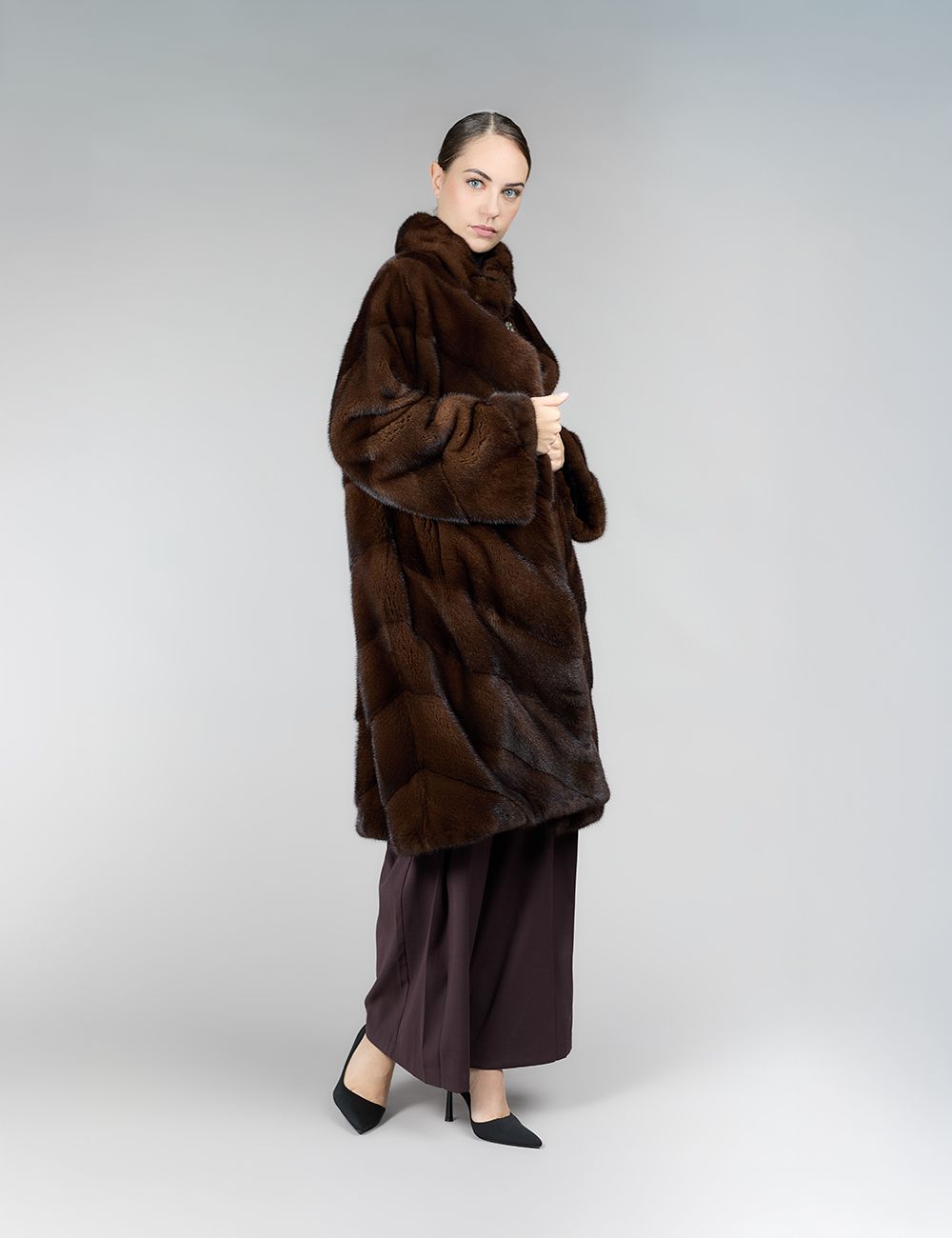 Cappotto di visone, collo alto, lavorazione diagonale, vestibilità ampia, mogano, 105 cm