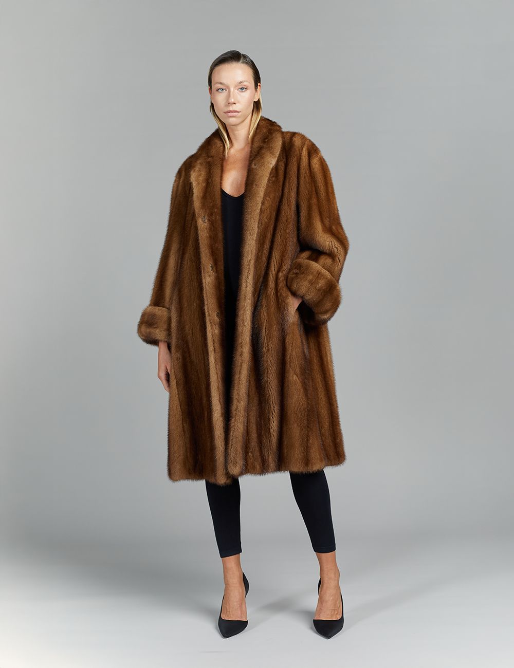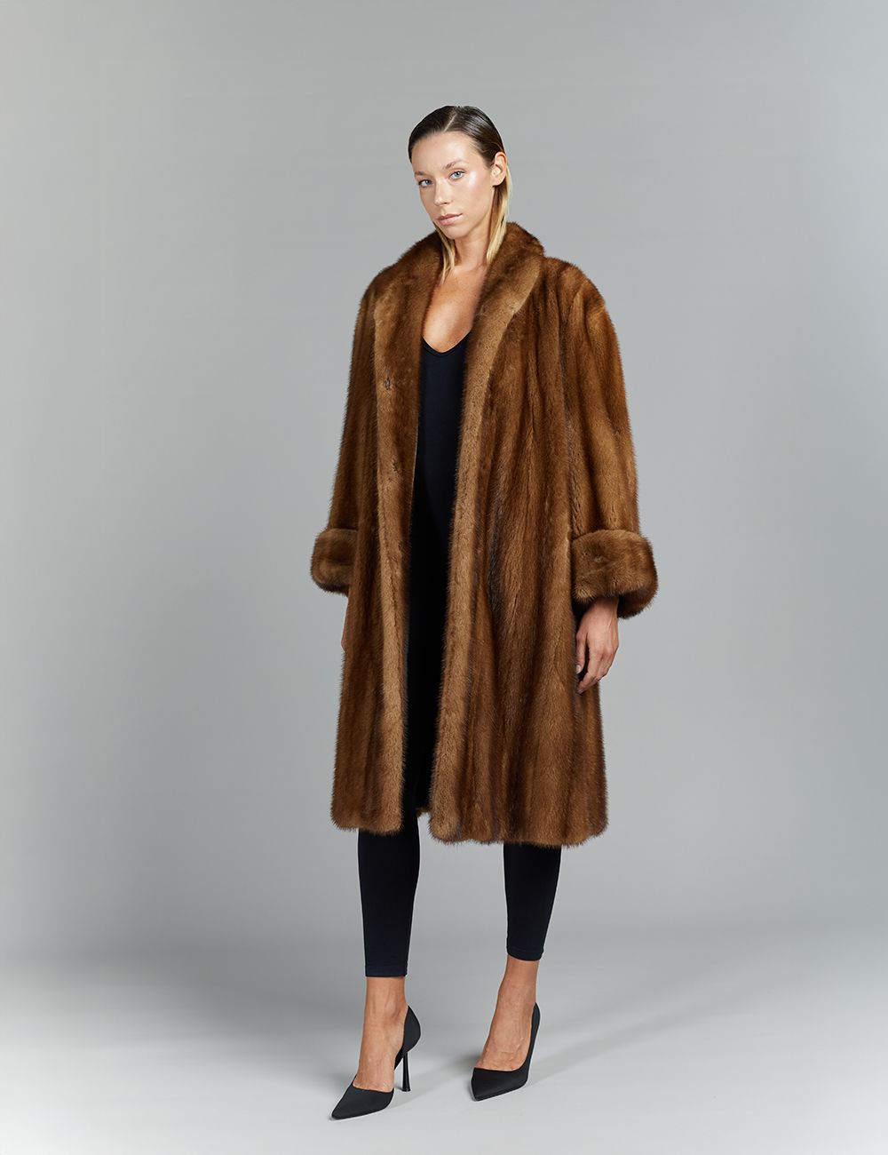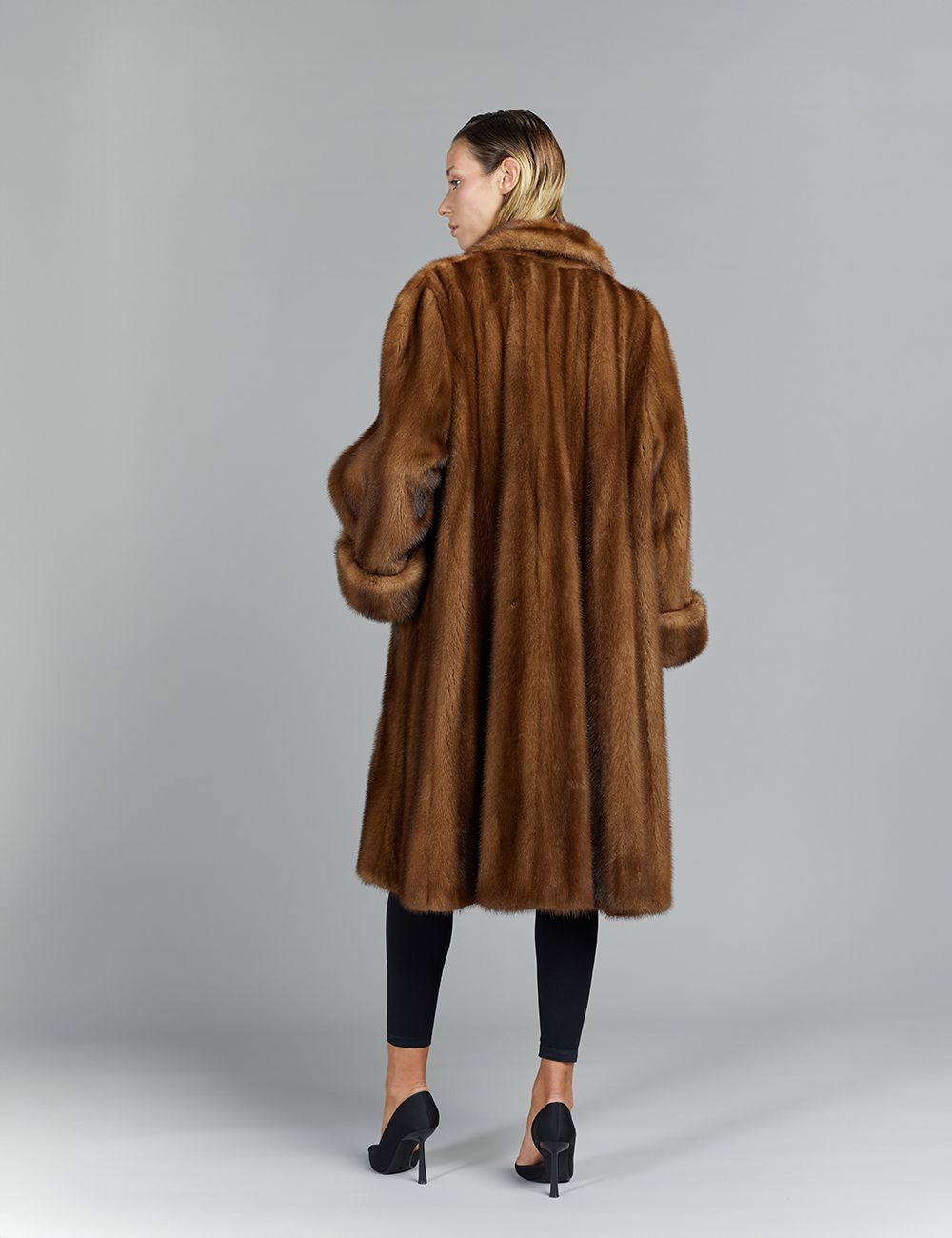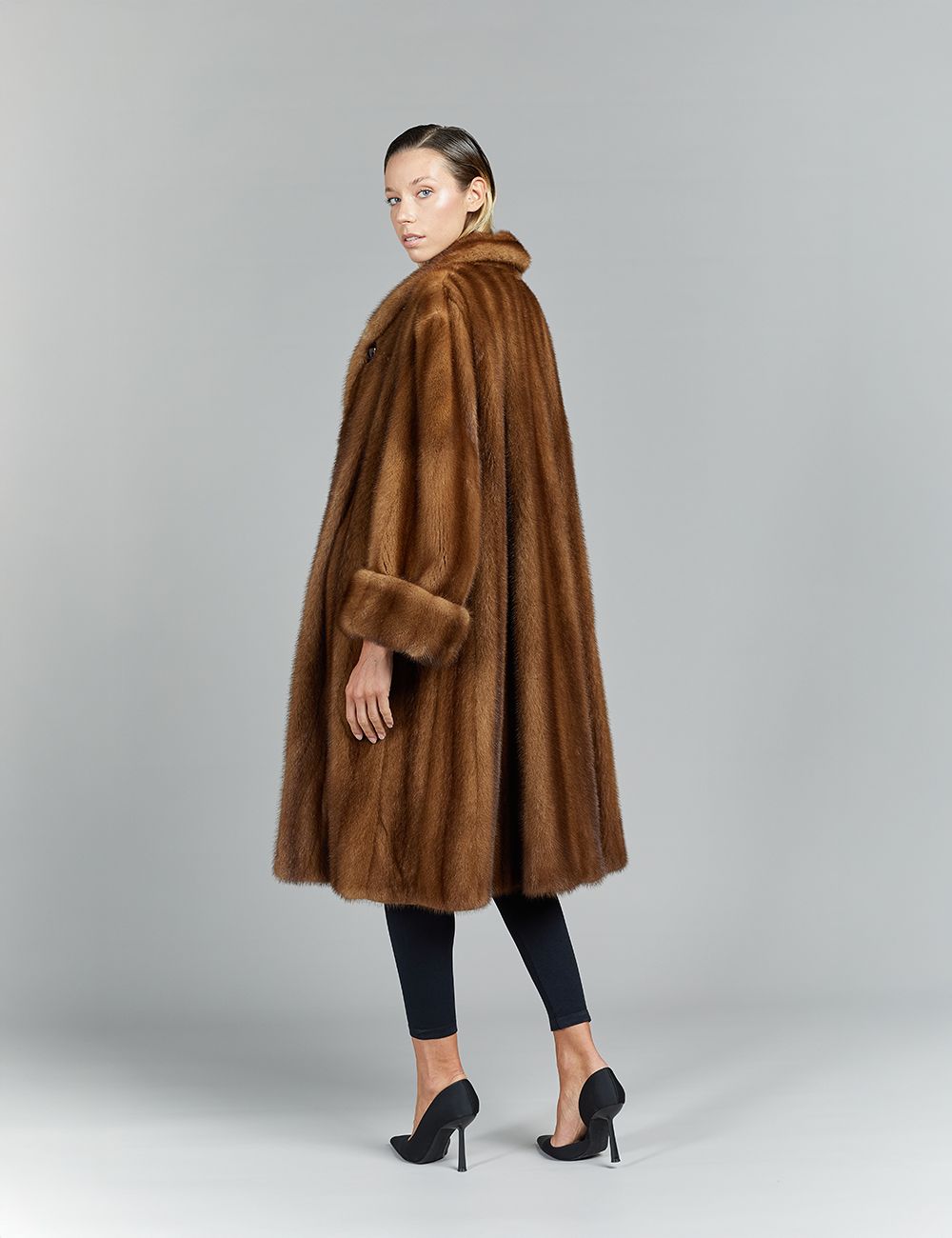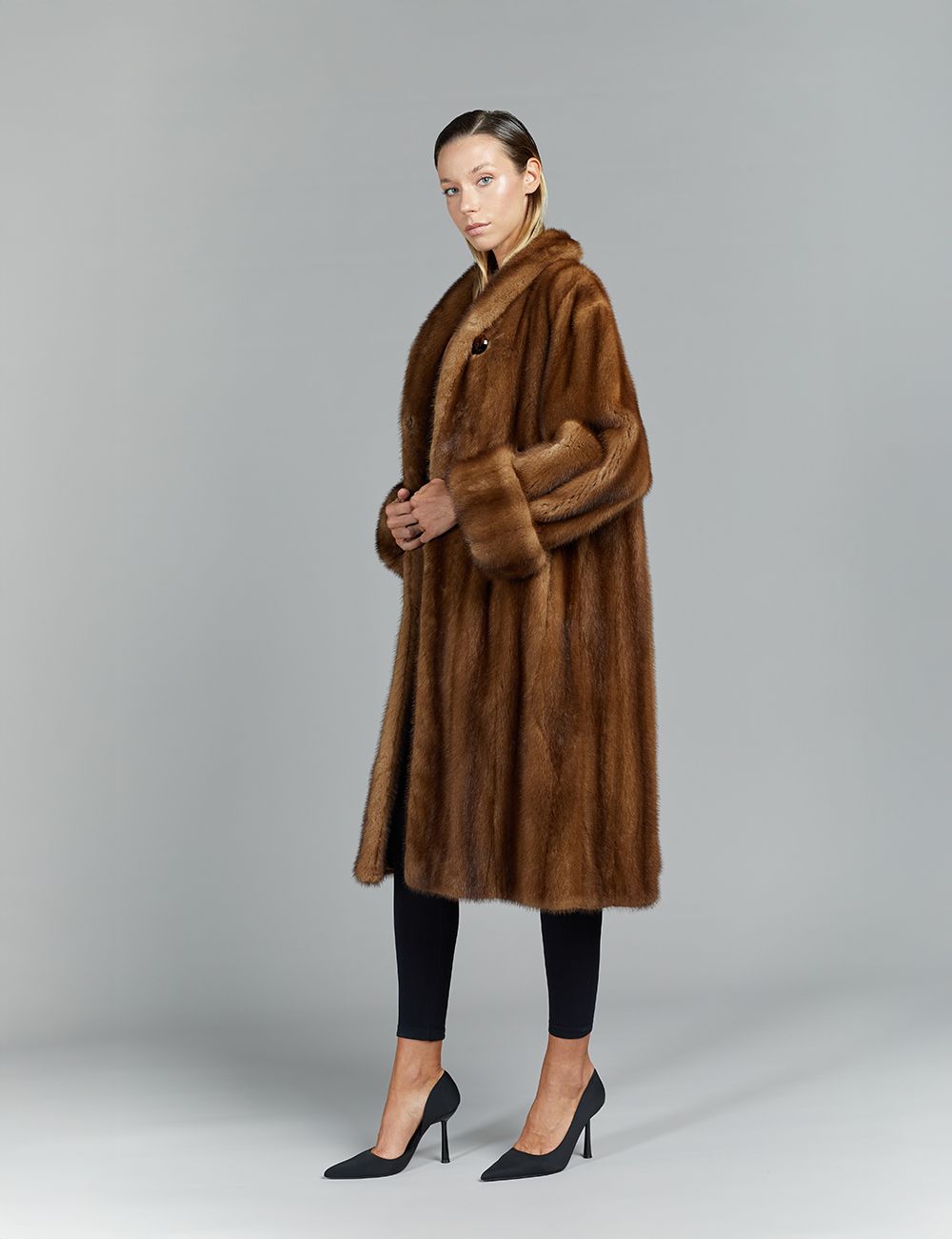 Cappotto in visone a pelle intera, collo a scialle, demi buff, 105 cm