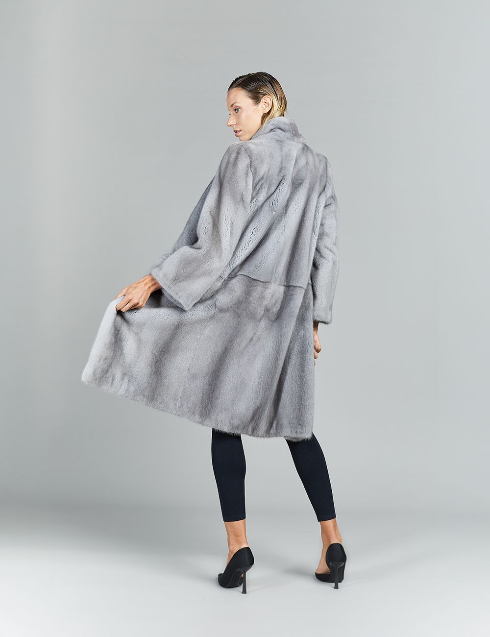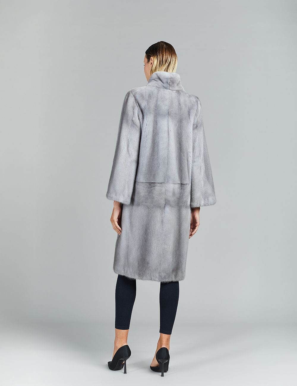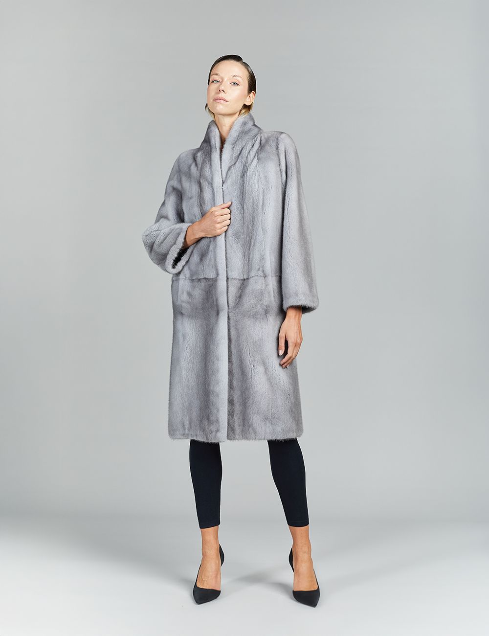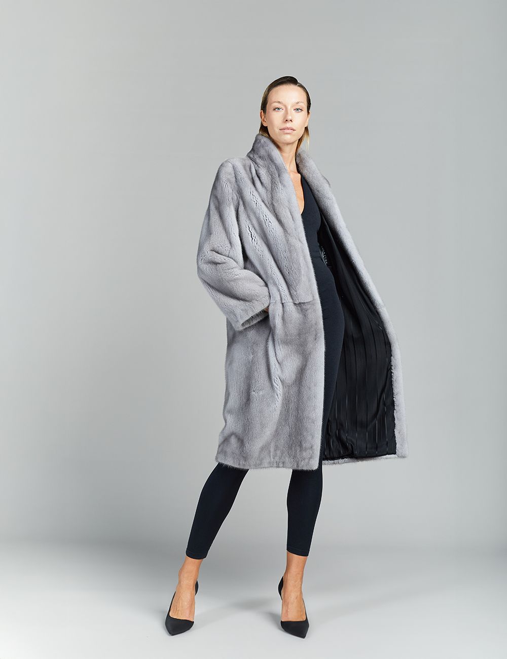 Cappotto in visone a pelle intera, collo a scialle, zaffiro, 105 cm