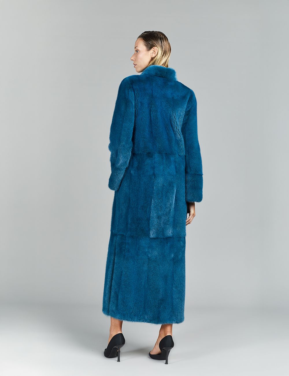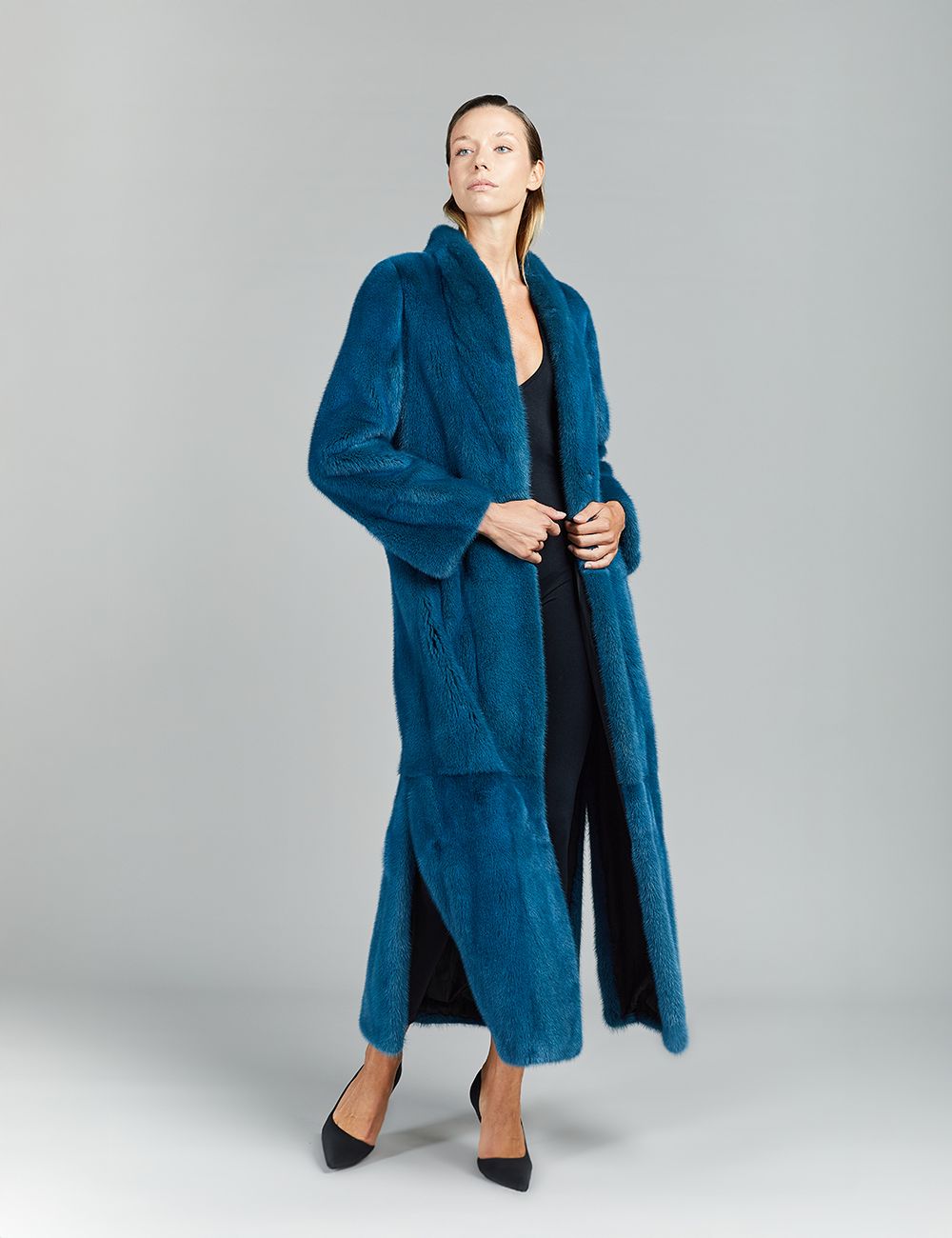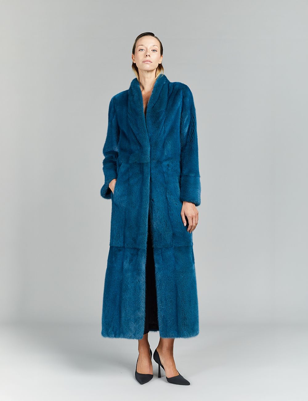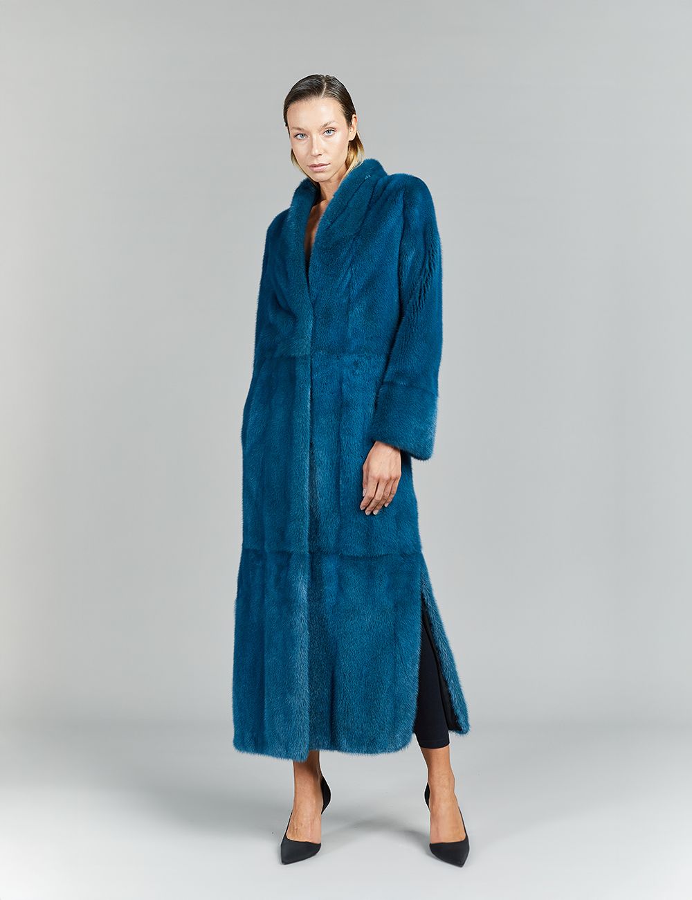Cappotto in visone a pelle intera con collo a scialle, turchese, 135 cm