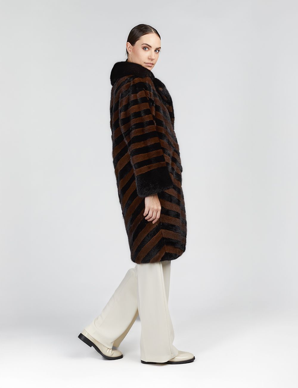Cappotto in visone, chiusura a ganci, collo inglese, ampia vestibilità, intarsi geometrici, demi buff, 95cm