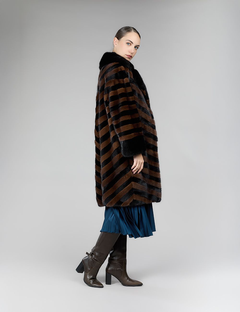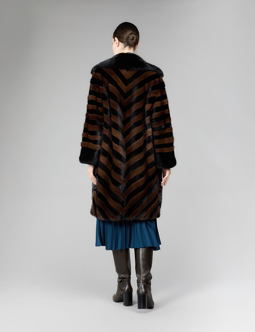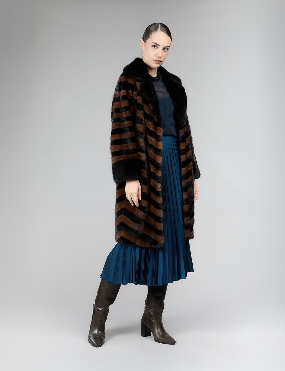 Cappotto in visone, chiusura a ganci, collo inglese, ampia vestibilità, intarsi geometrici, demi buff, 95 cm