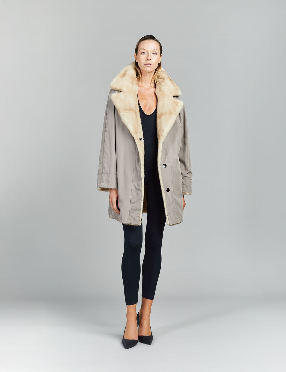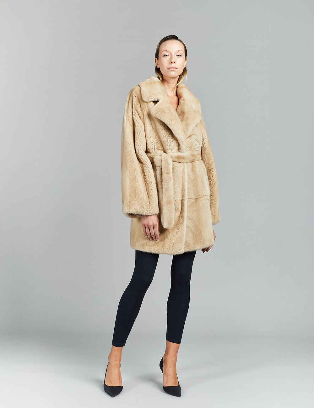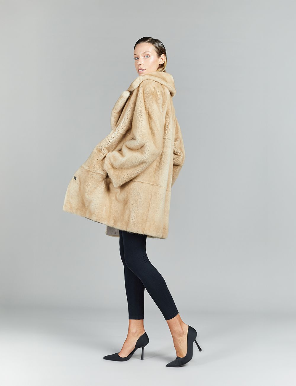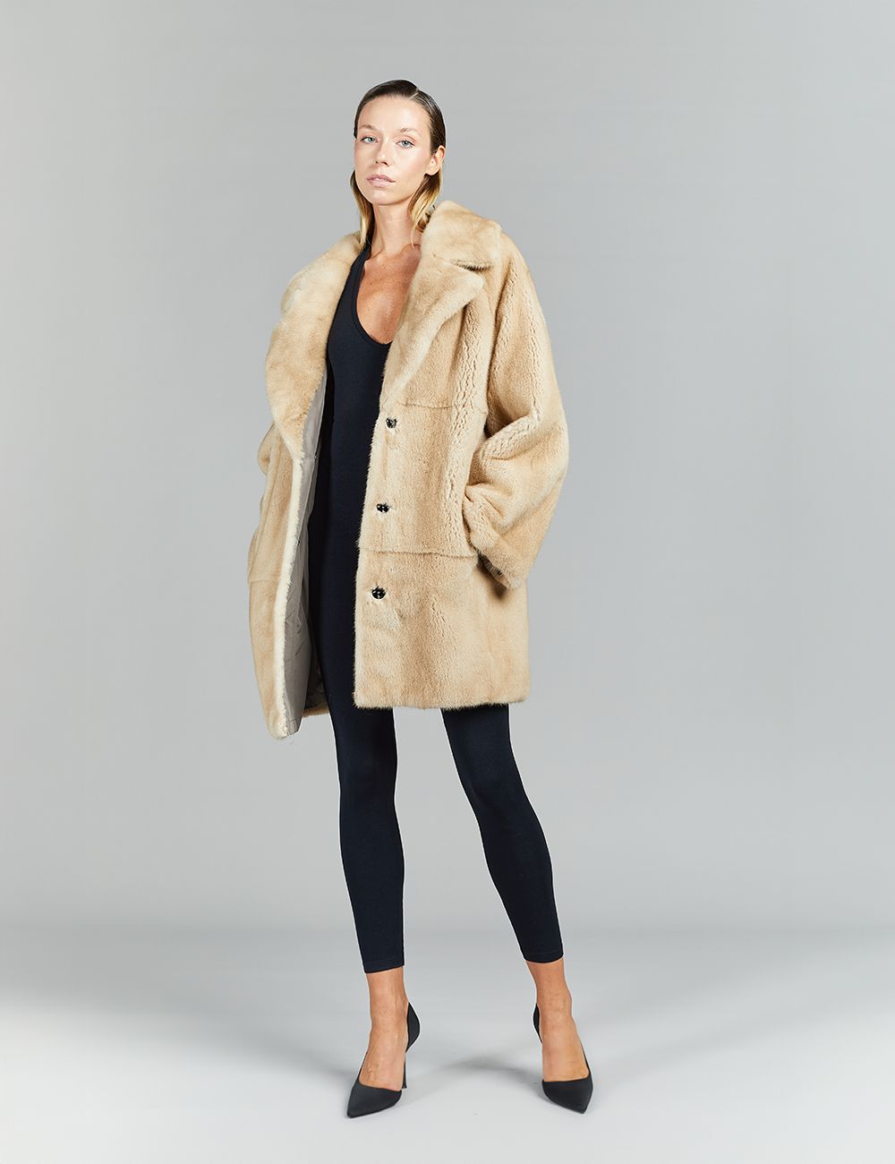 Cappotto in visone, collo inglese, reversibile, palomino, 85 cm