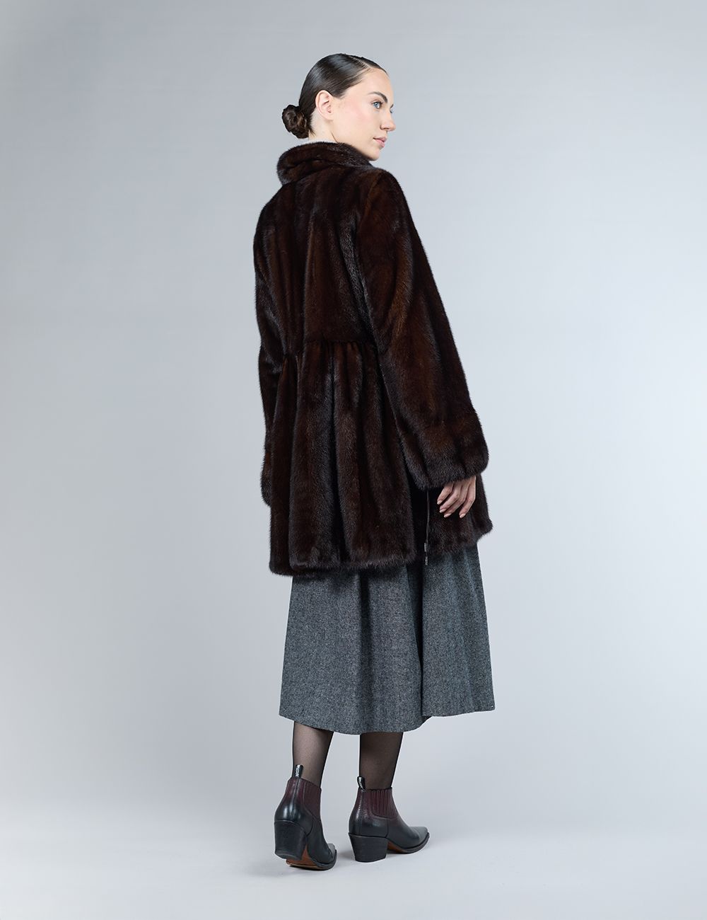 Cappotto in visone color mogano con collo tondo e linea leggermente svasata. Chiusura nascosta e tasche laterali, 85 cm
