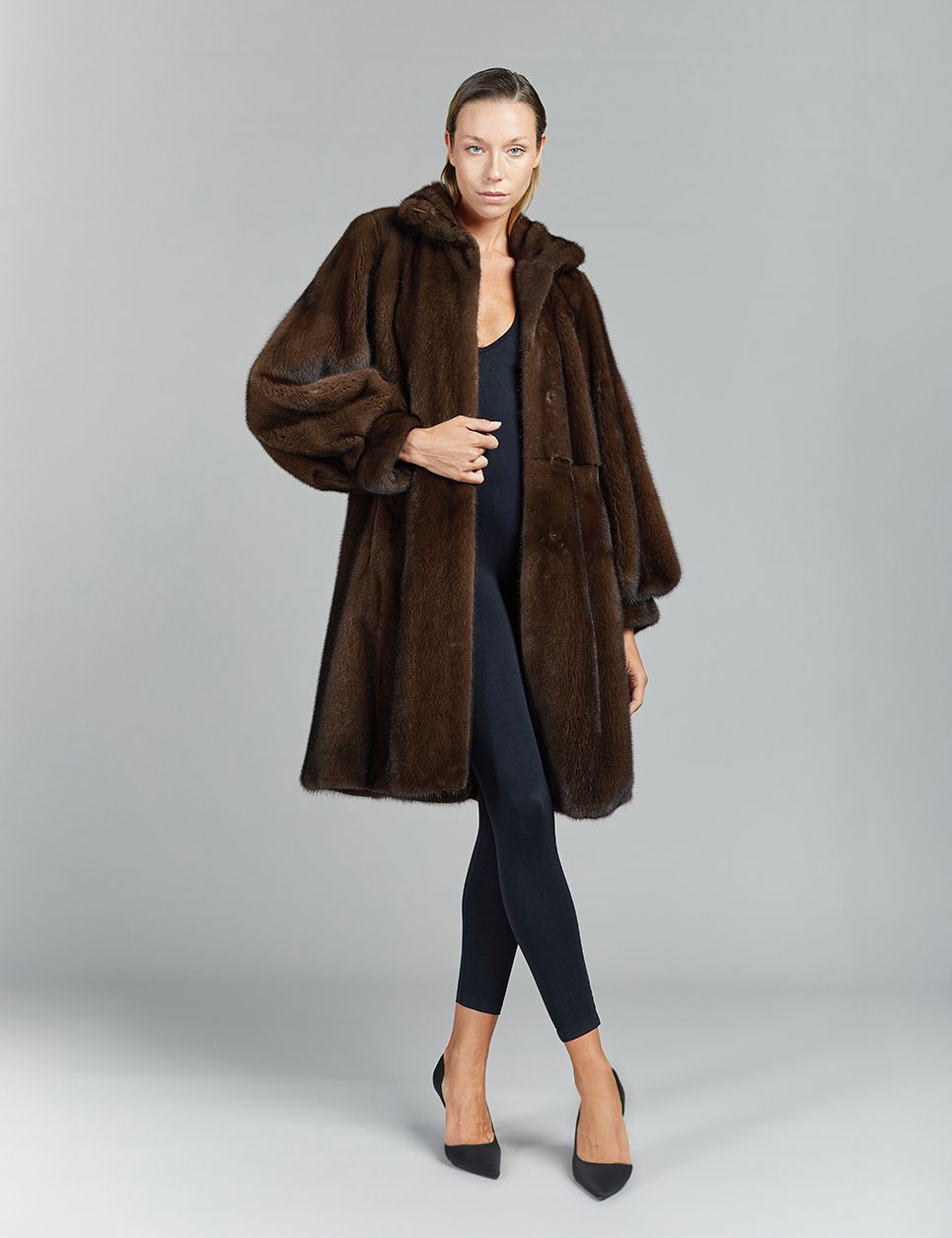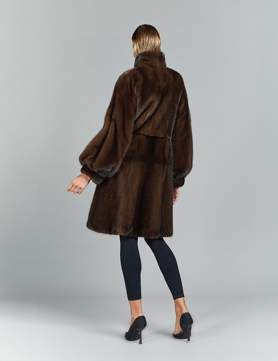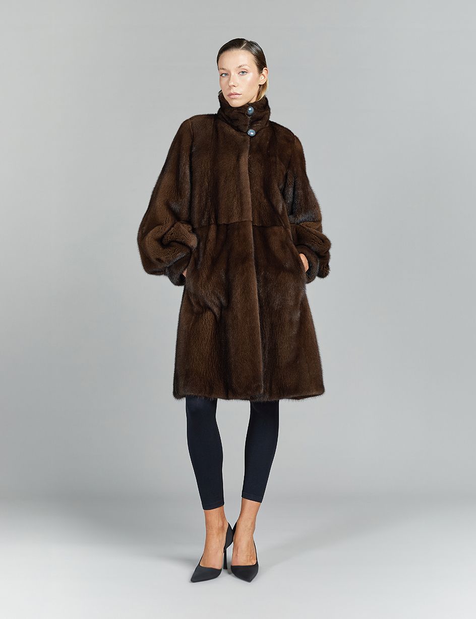 Cappotto in visone a pelle intera, collo alto, demi buff, 95 cm
