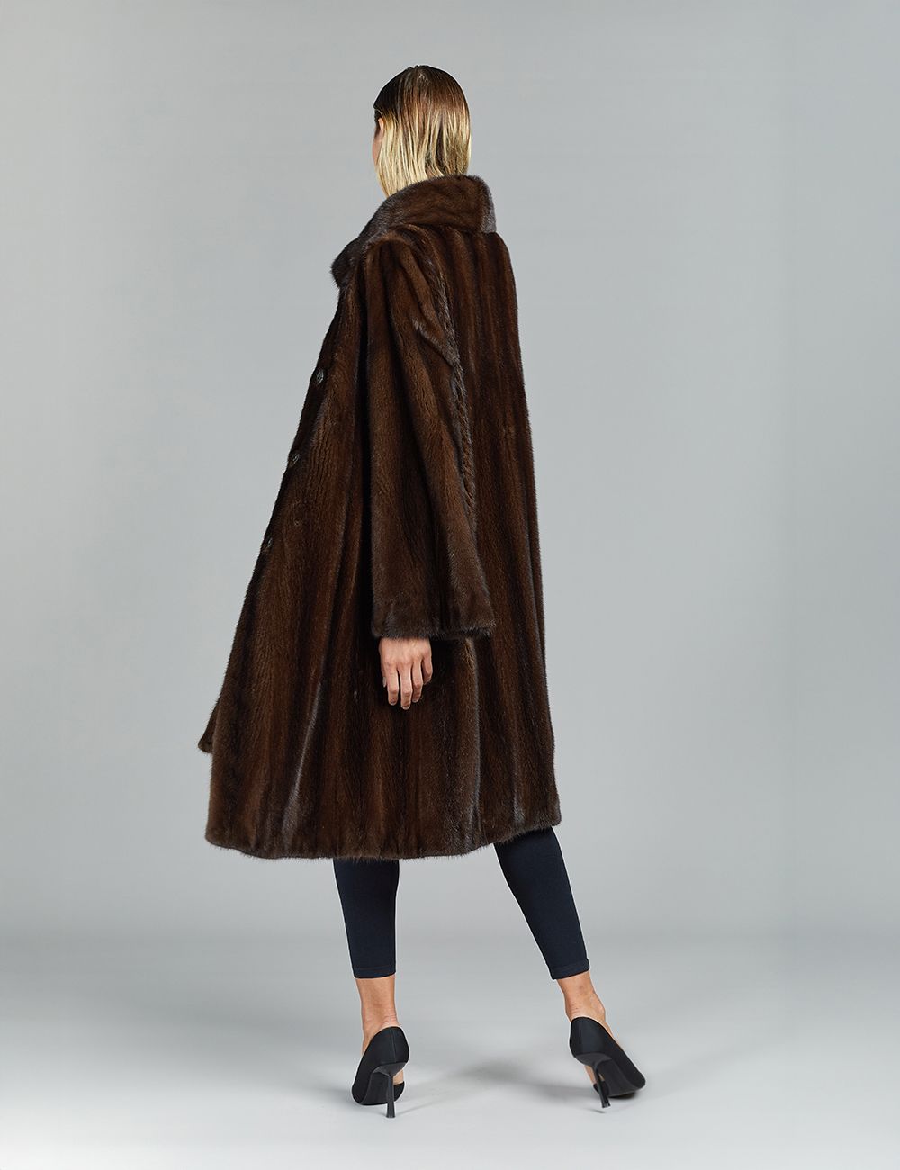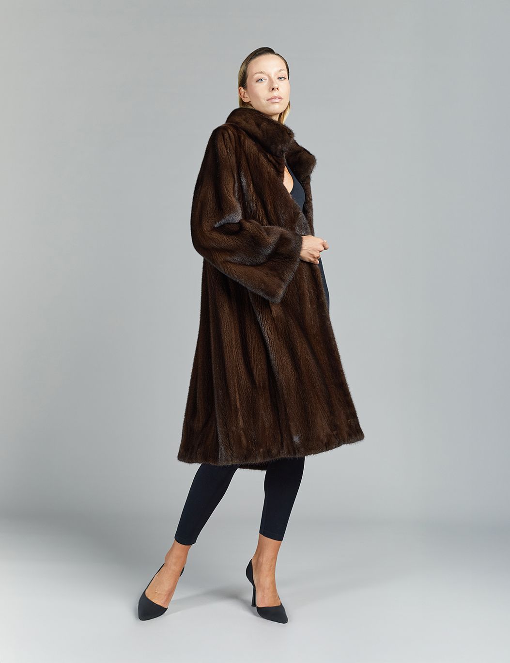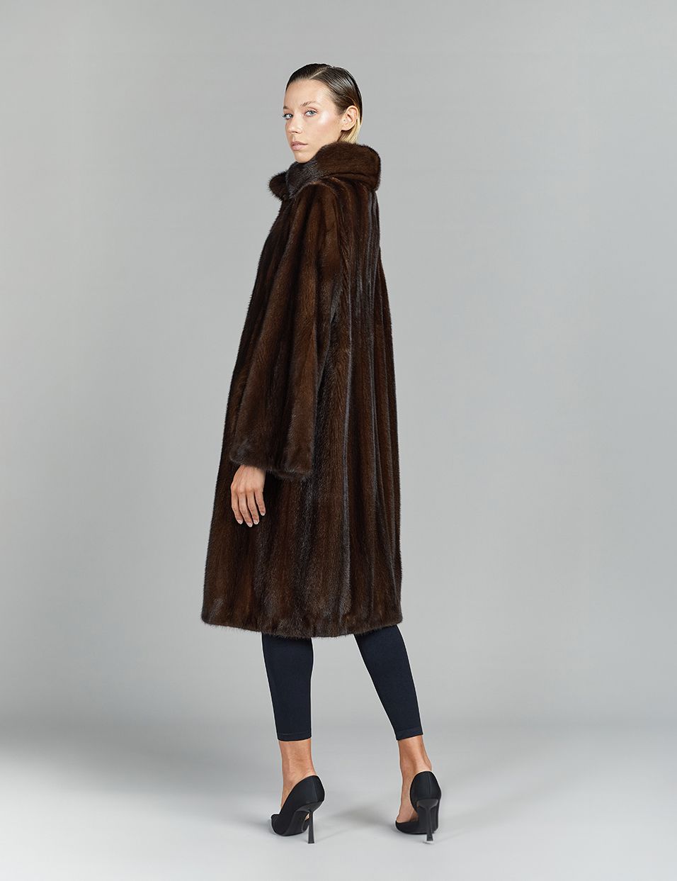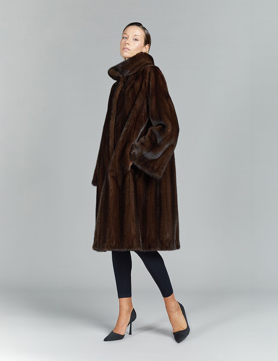 Cappotto in visone con collo alto, a pelle intera, svasato, mogano, 105 cm
