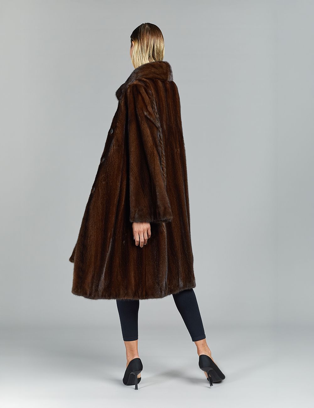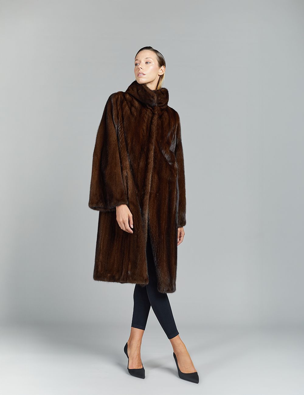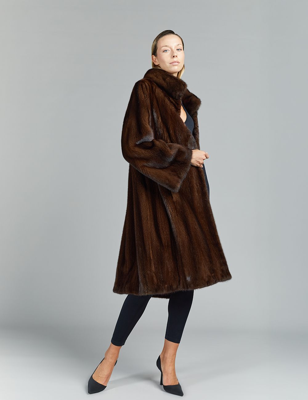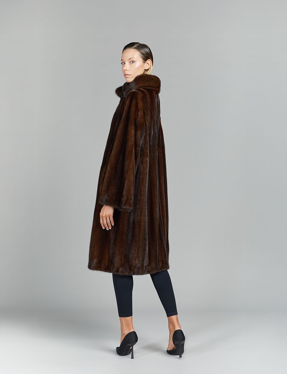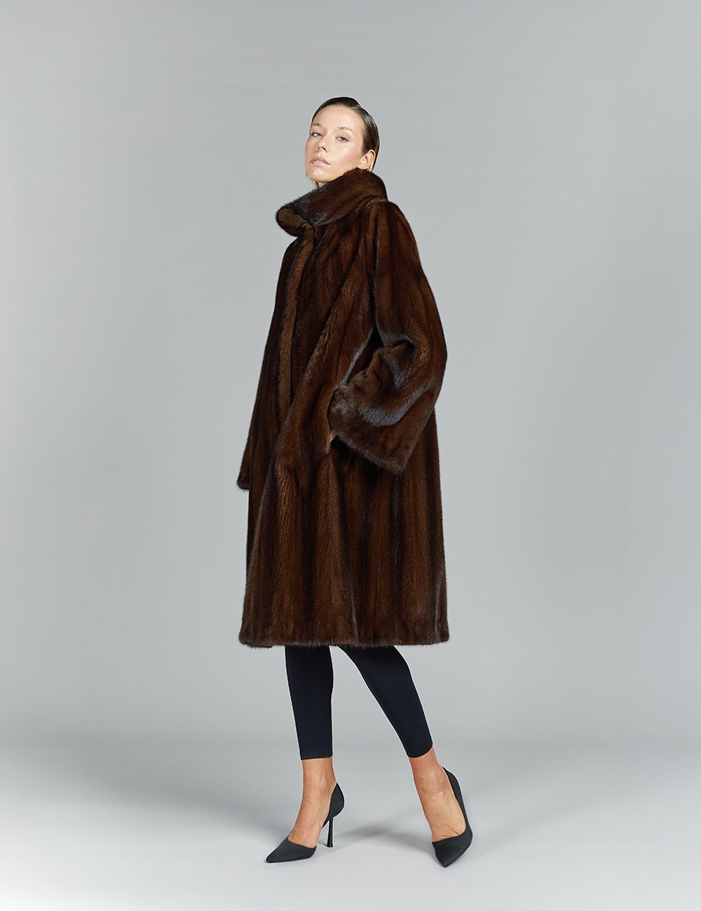 Cappotto in visone con collo alto, svasato, mogano, 105 cm