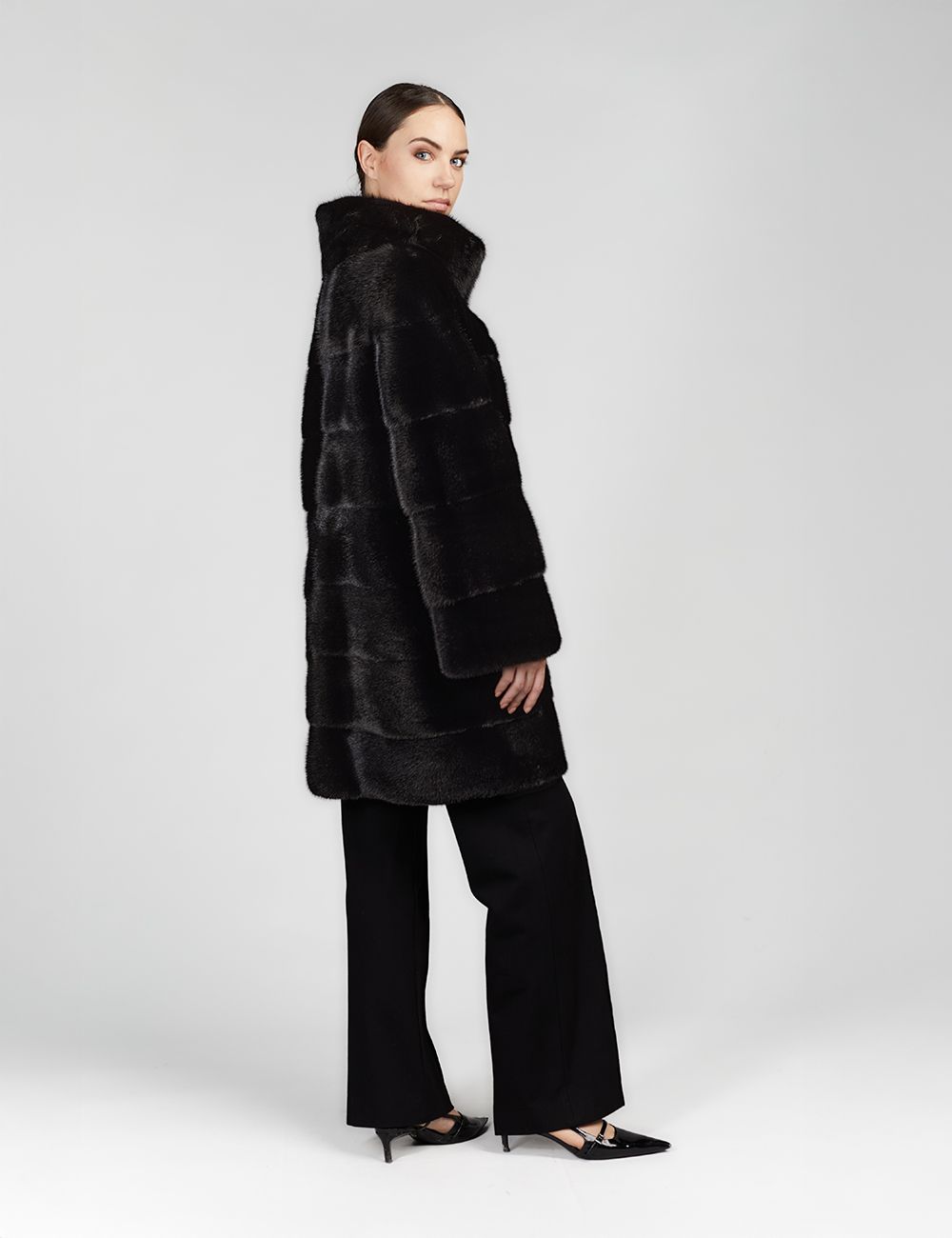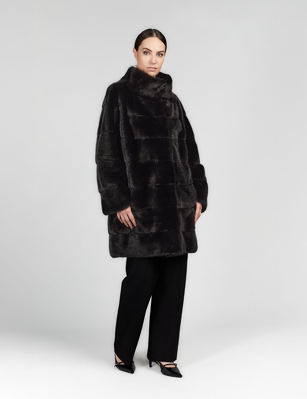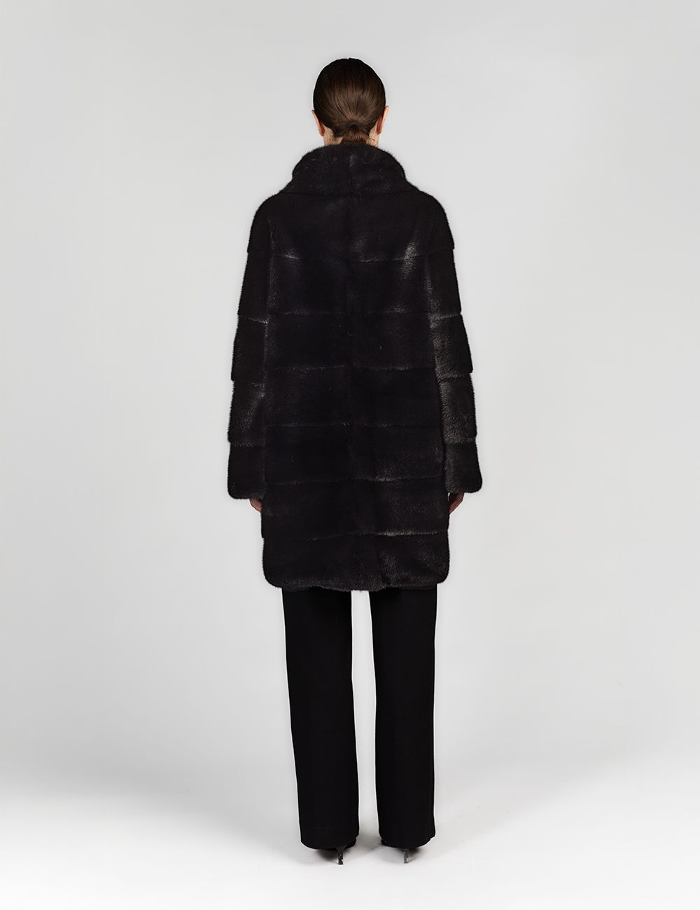 Cappotto in visone al ginocchio, collo alto ampio, vestibilità comoda, nero, 85cm