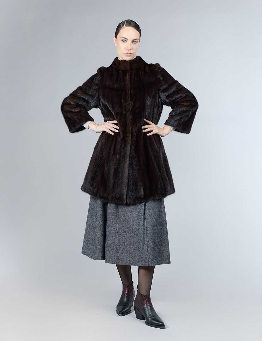 Cappotto in visone con lavorazione verticale e linea svasata. Modello con collo alto, chiusura a ganci e tasche laterali, 85 cm
