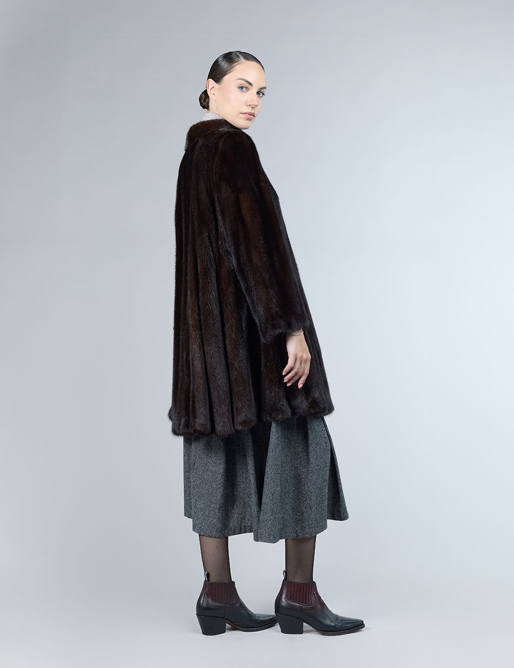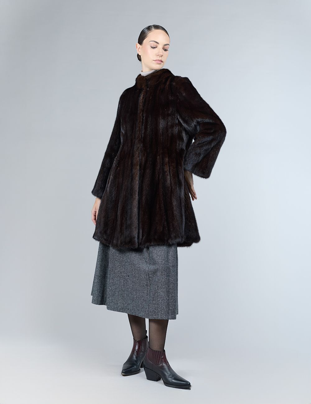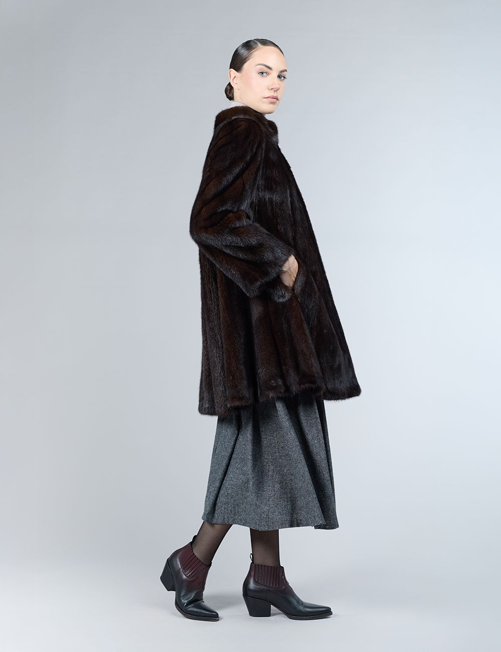 Cappotto in visone, modello svasato con collo alto, mogano, 85 cm