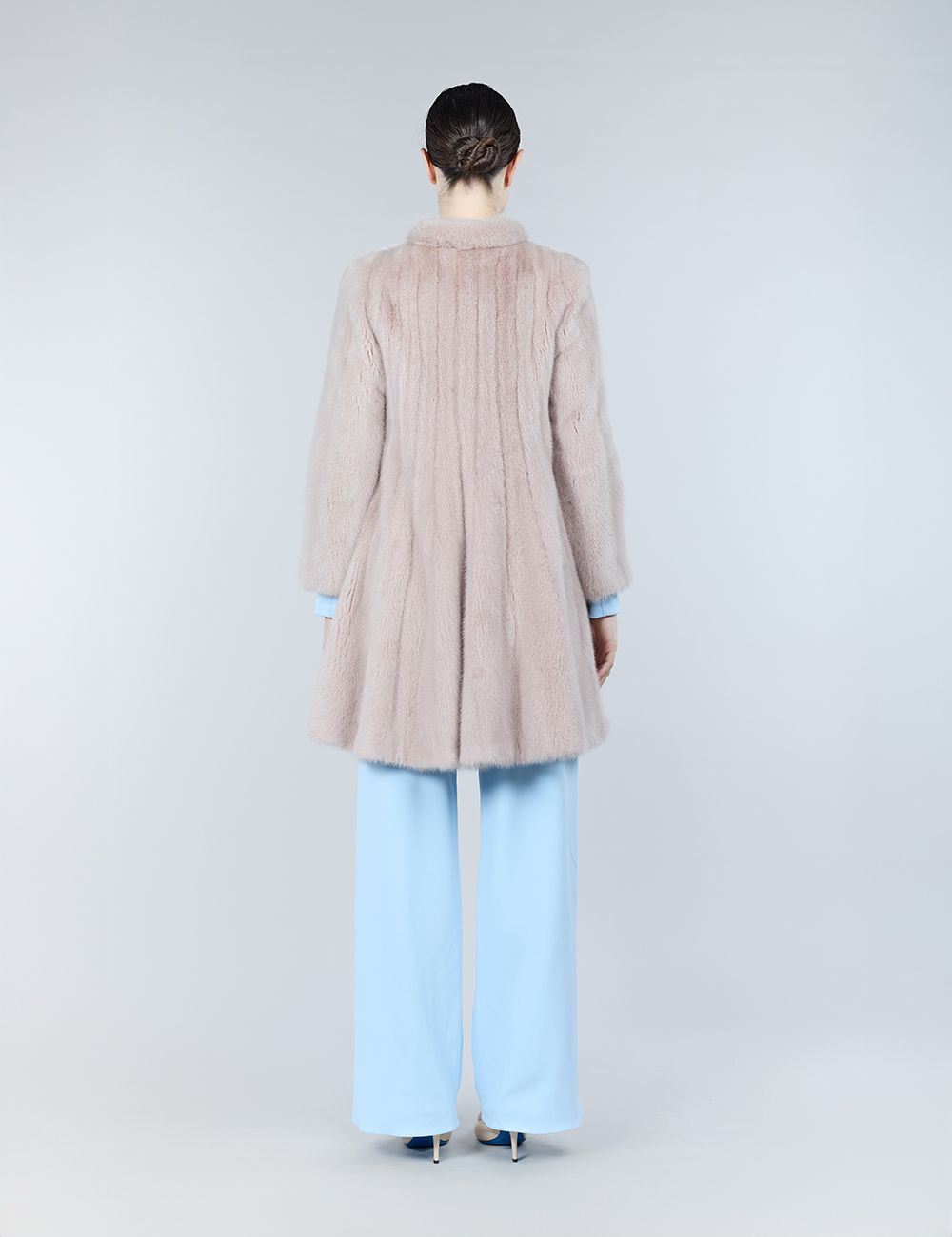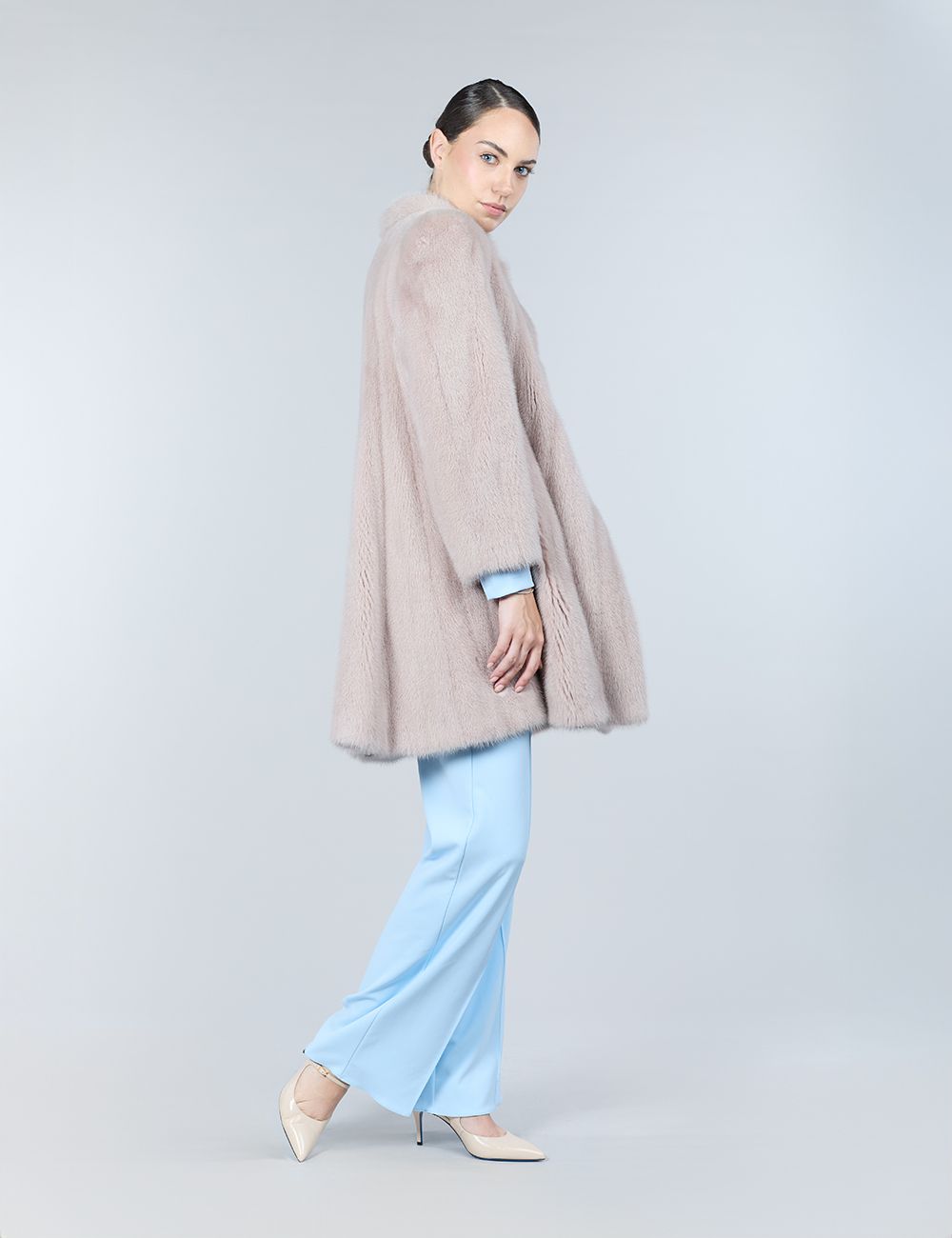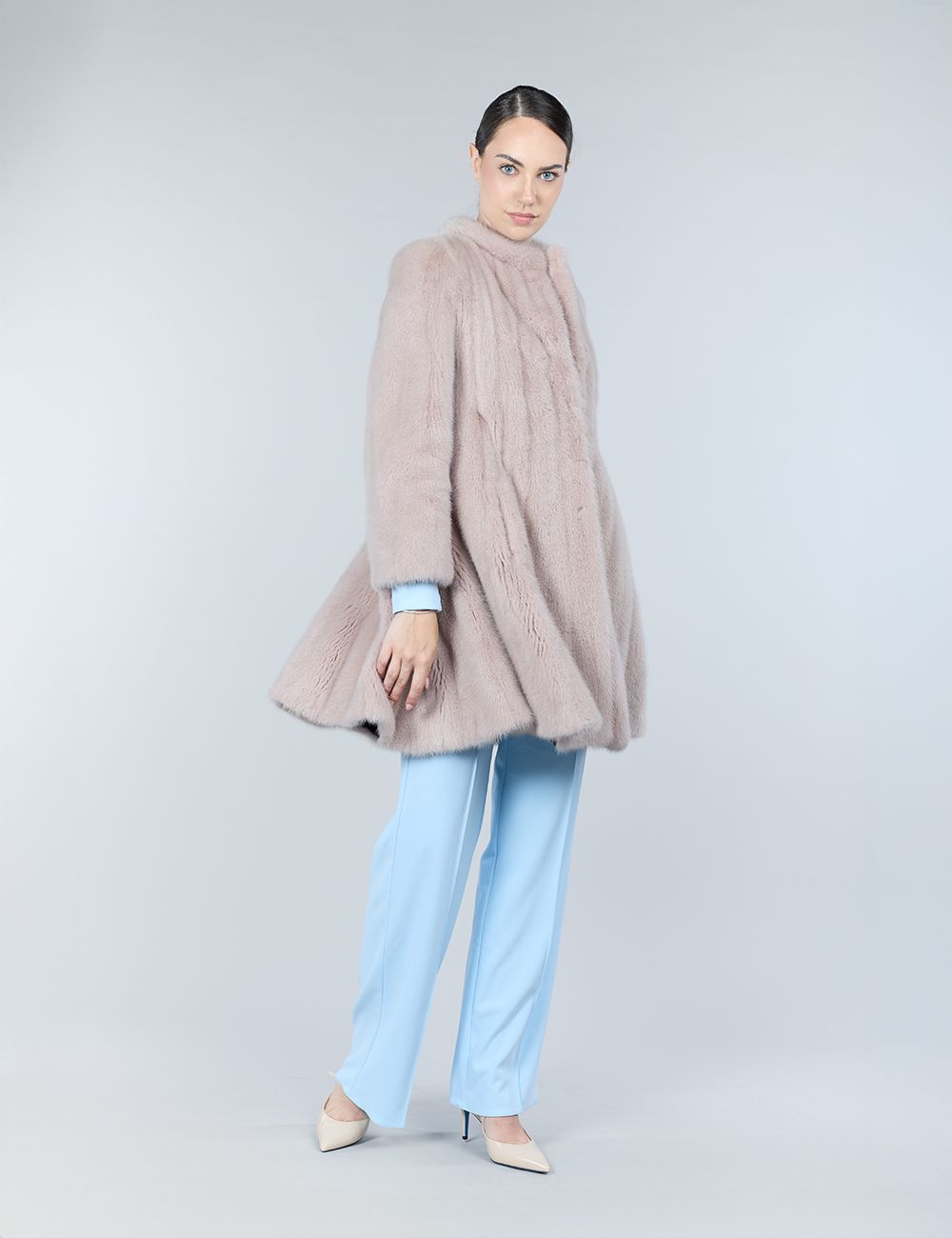 Cappotto in visone, modello svasato con collo alto, rosa, 85 cm