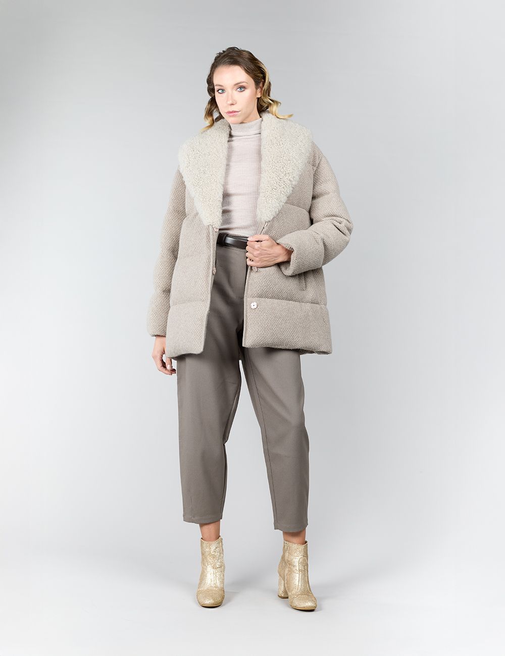 Cappotto reversibile in visone rasato e tessuto tecnico color cammello, collo inglese, maniche con risvolto, coulisse regolabile in vita, chiusura con bottoni, tasche laterali, linea morbida e svasata, 80 cm