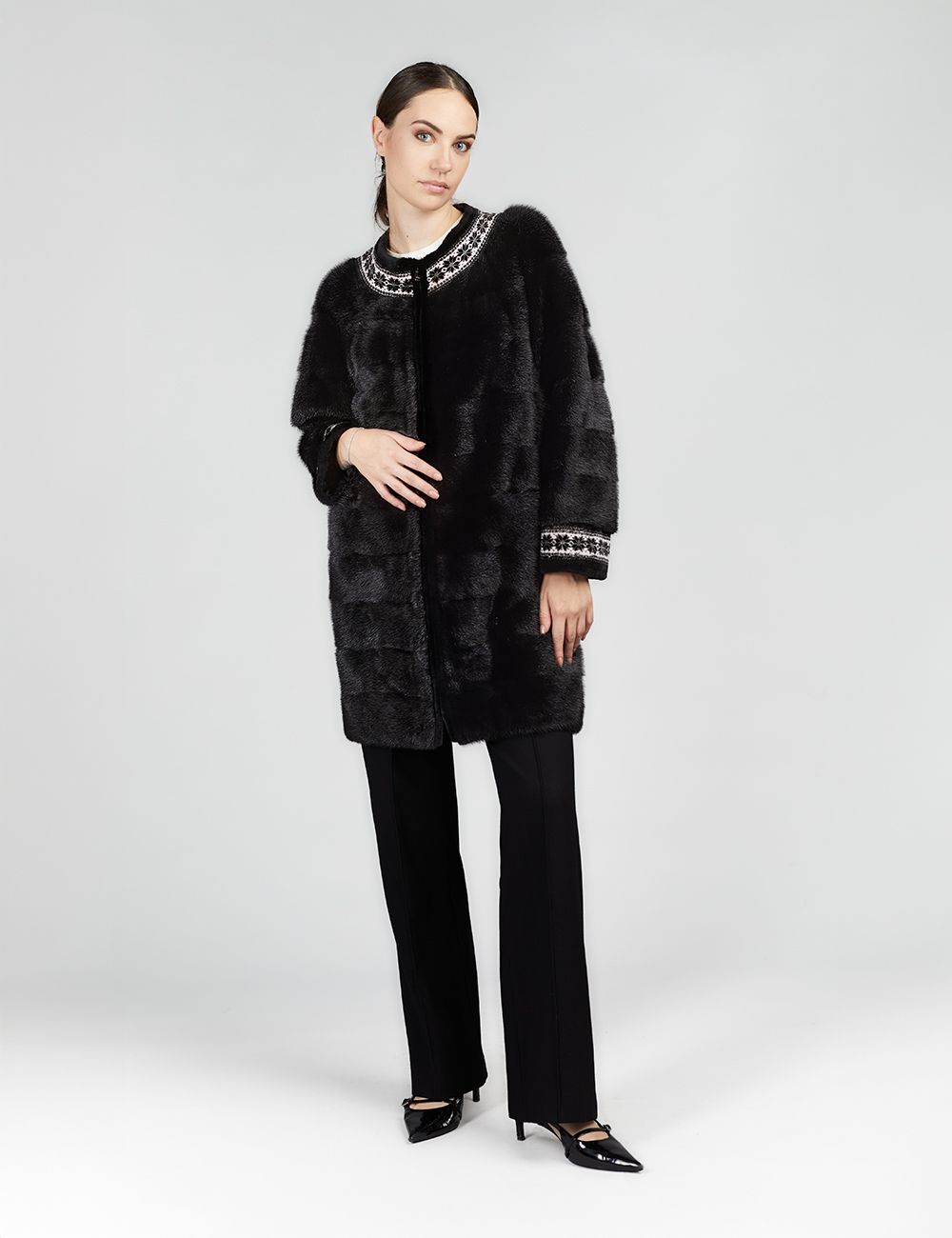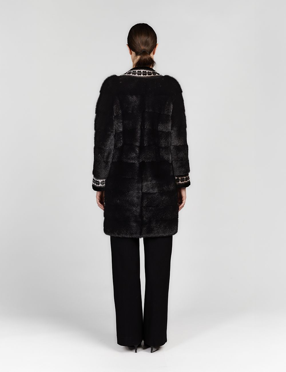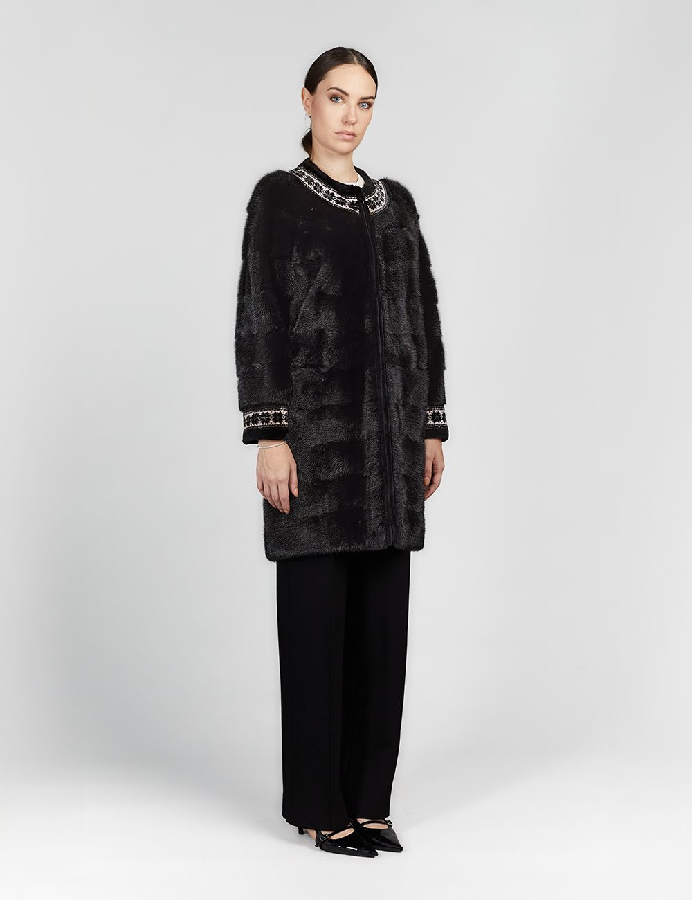 Cappotto in visone senza collo con bordi in lana nero 90cm