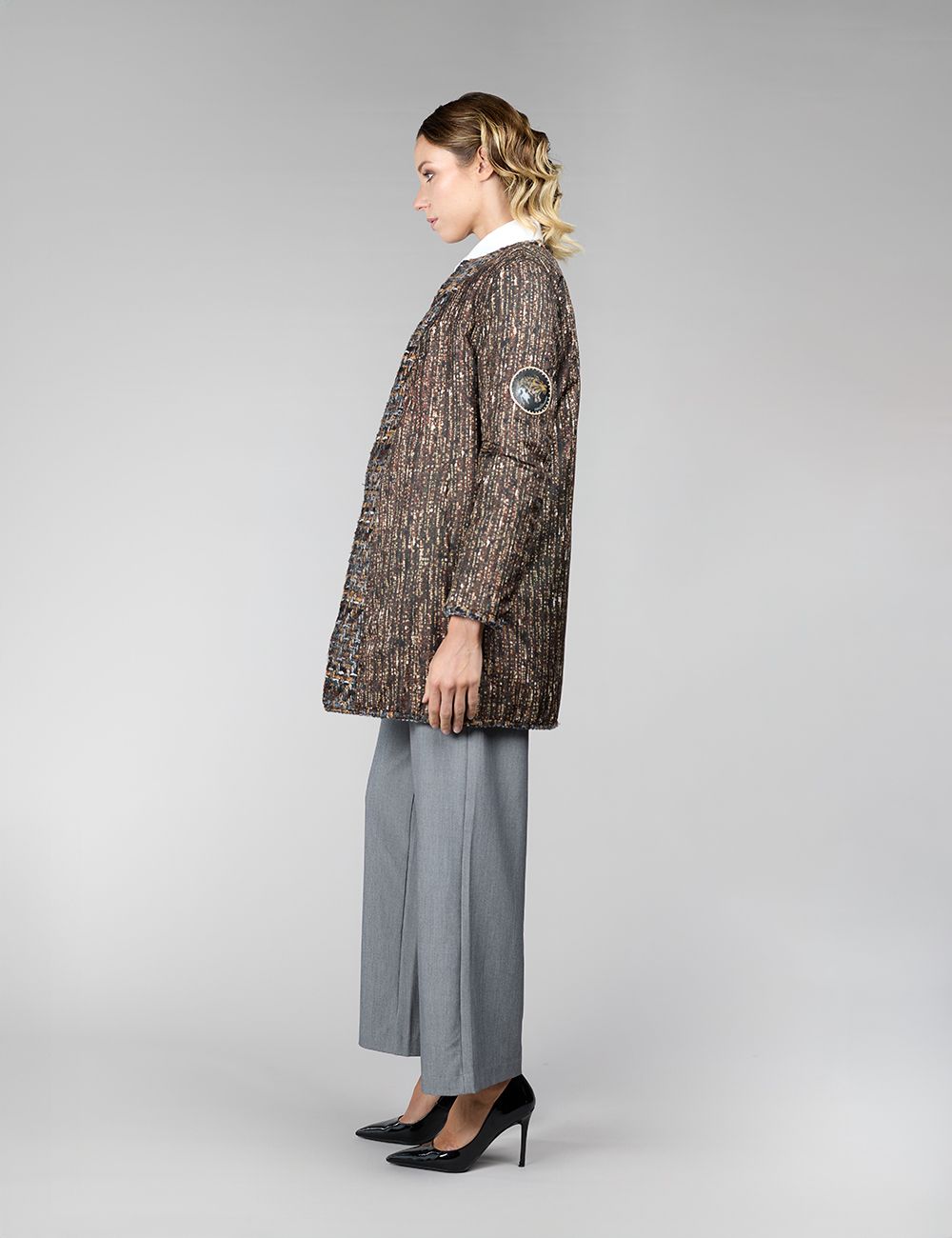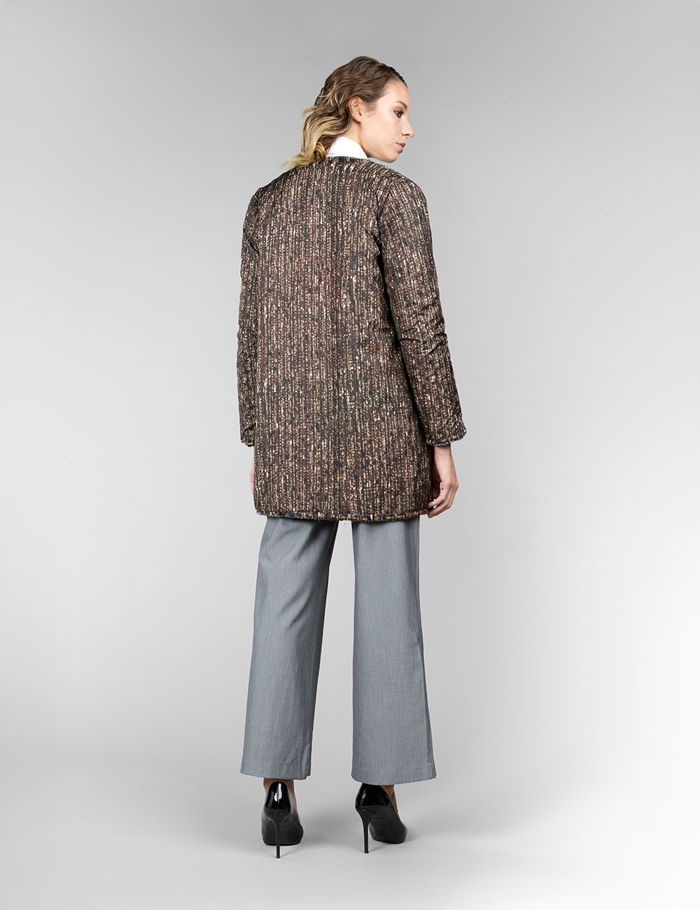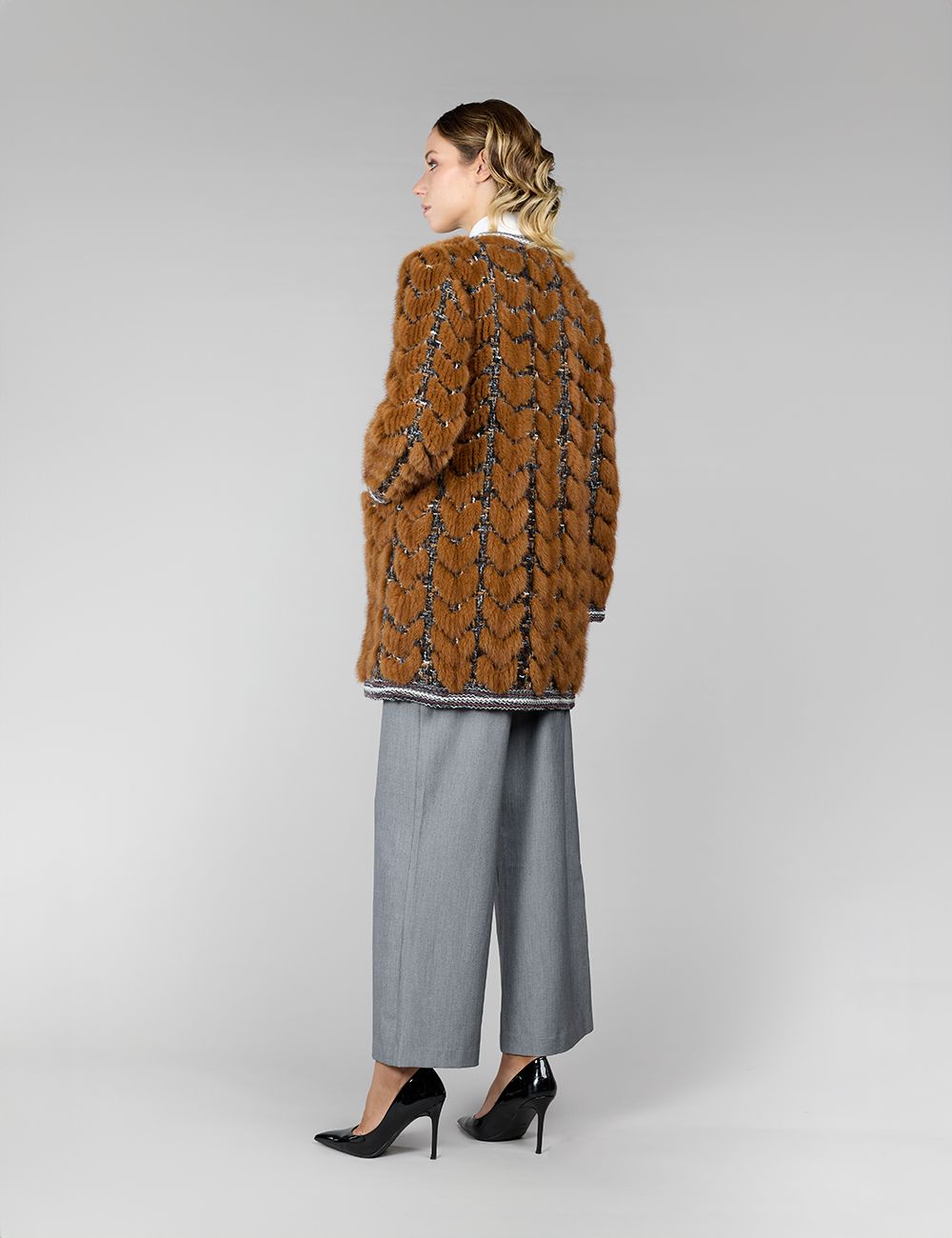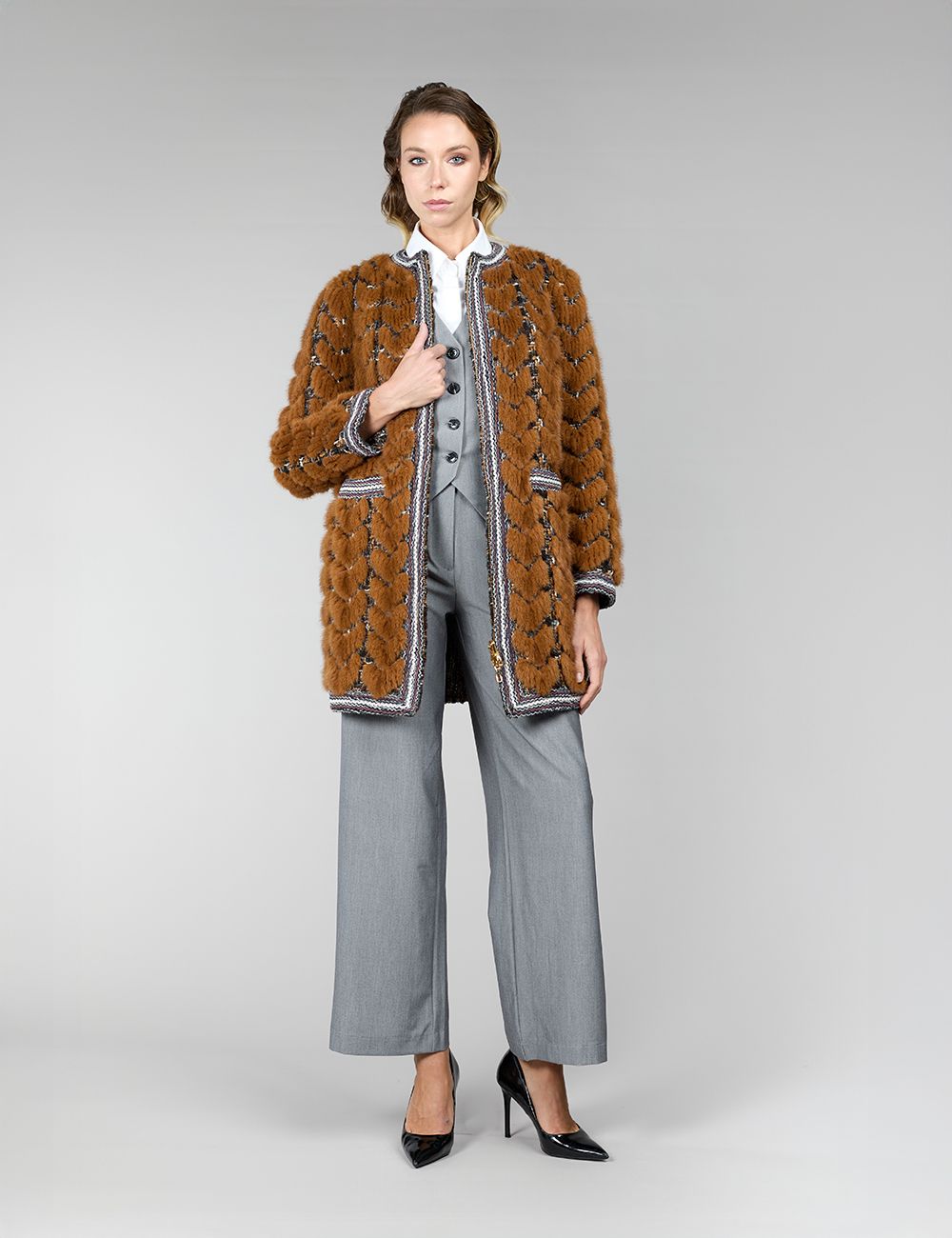 Cappotto corto in visone curry con lavorazione intrecciata e inserti in tessuto bouclé, linea dritta, manica lunga, chiusura con zip, tasche laterali a filetto, 85 cm