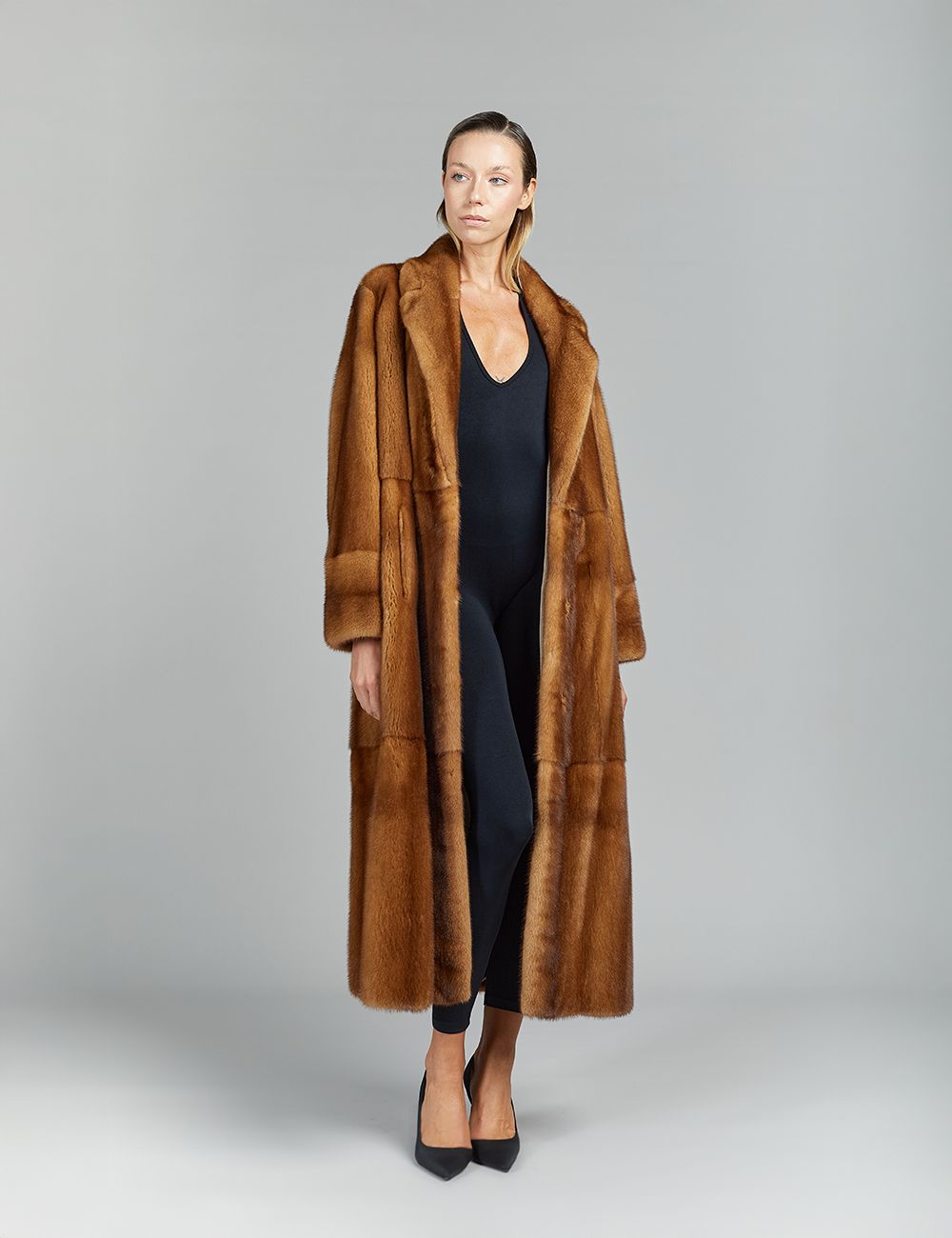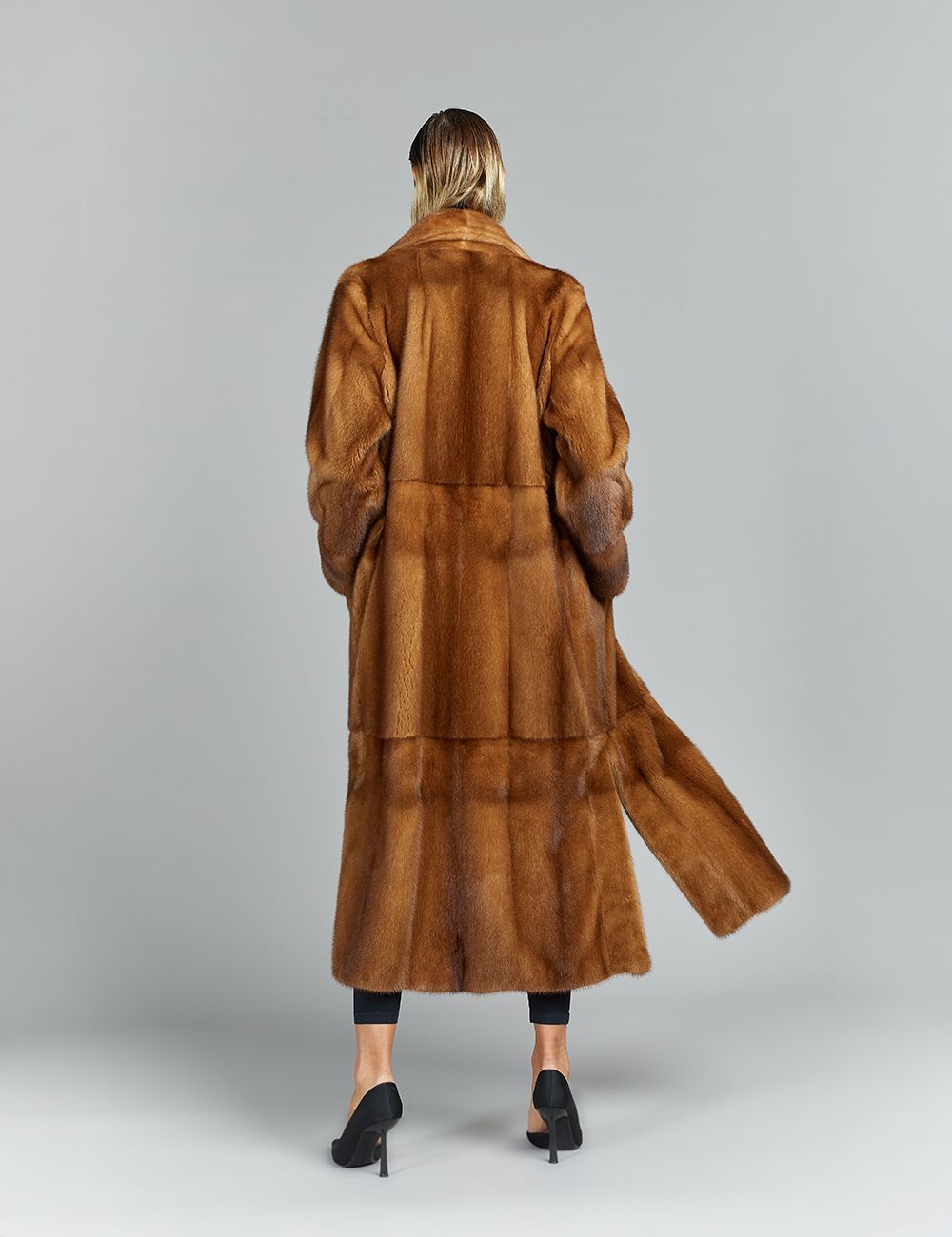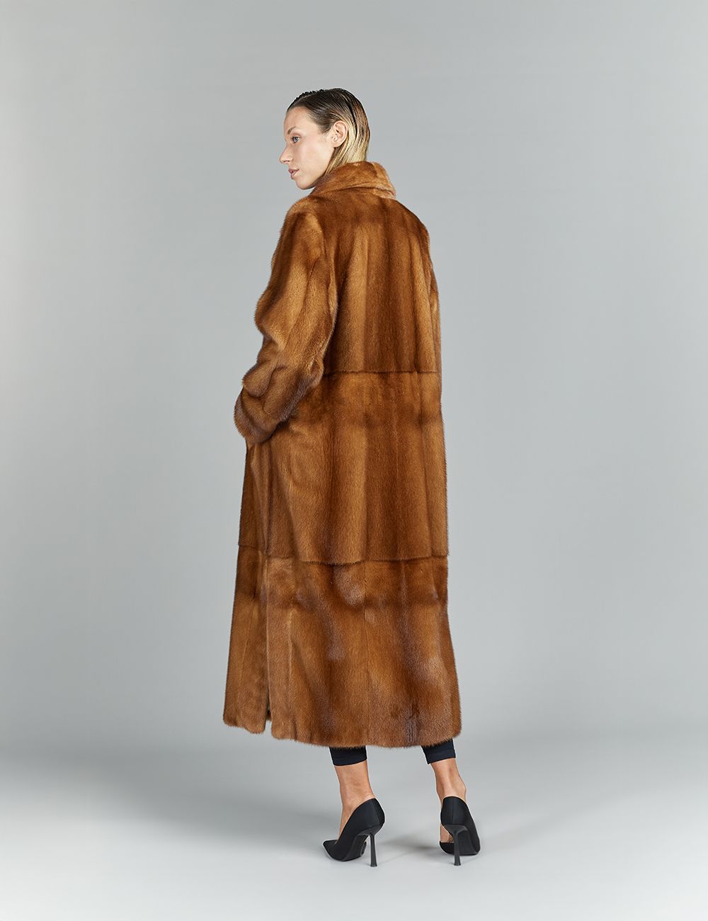 Cappotto lungo in visone, collo inglese, decolorato, 125 cm