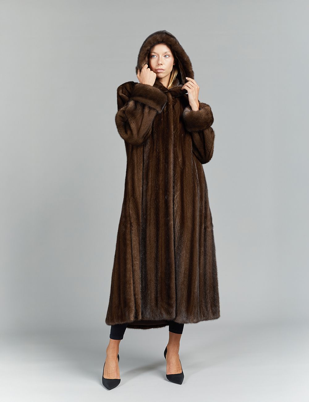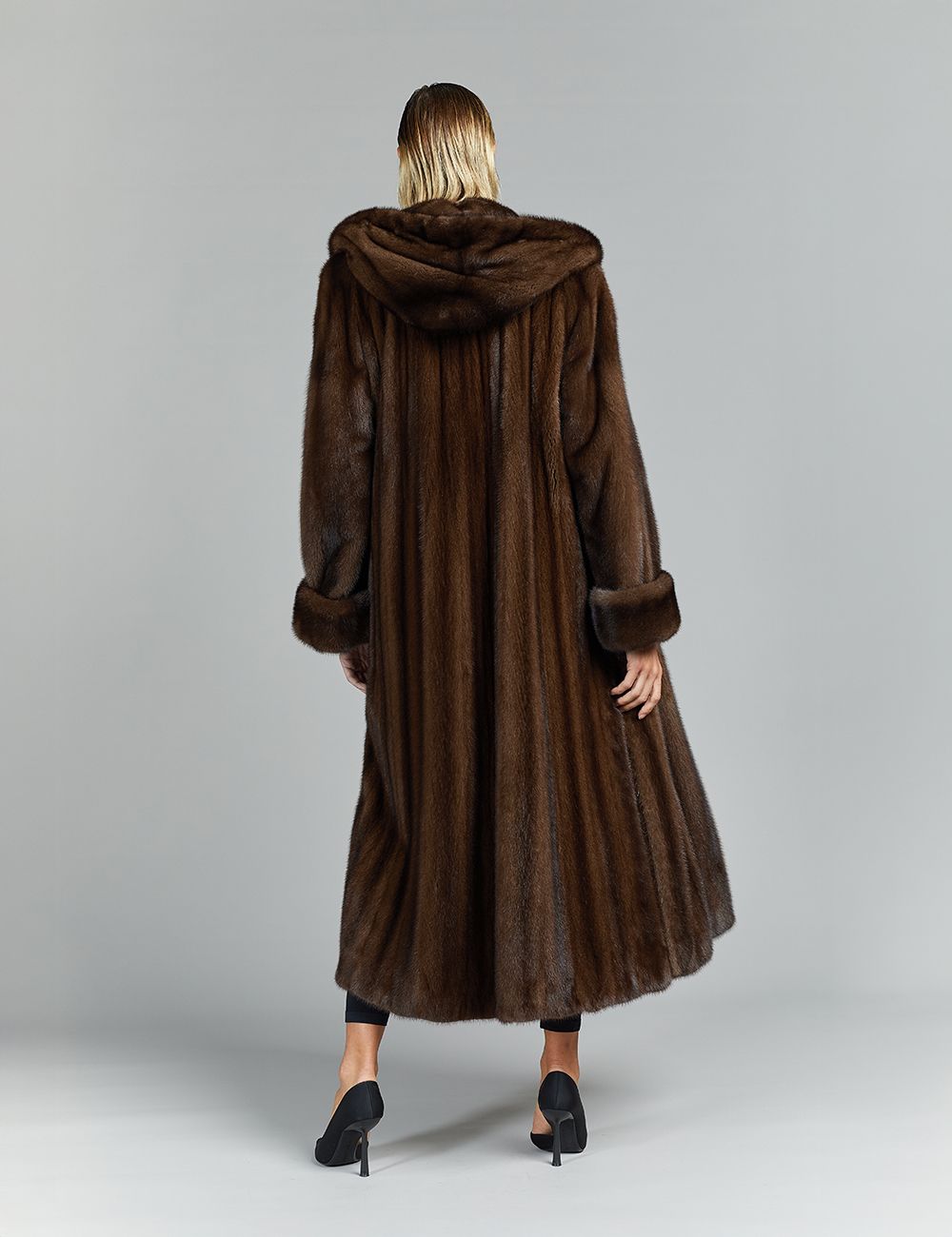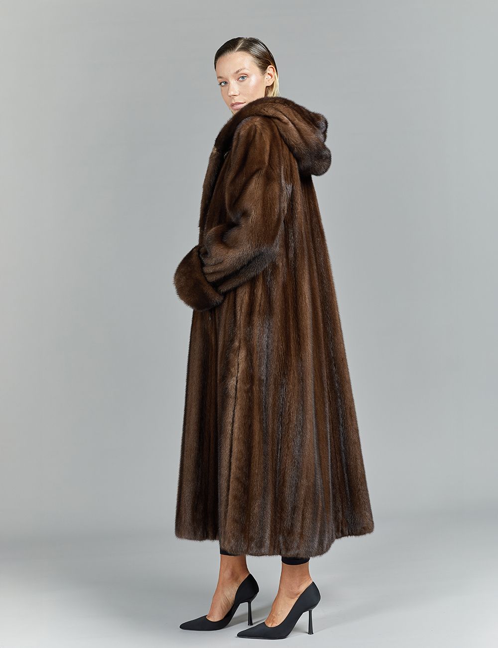 Cappotto lungo in visone a pelle intera, con cappuccio, demi buff, 130 cm