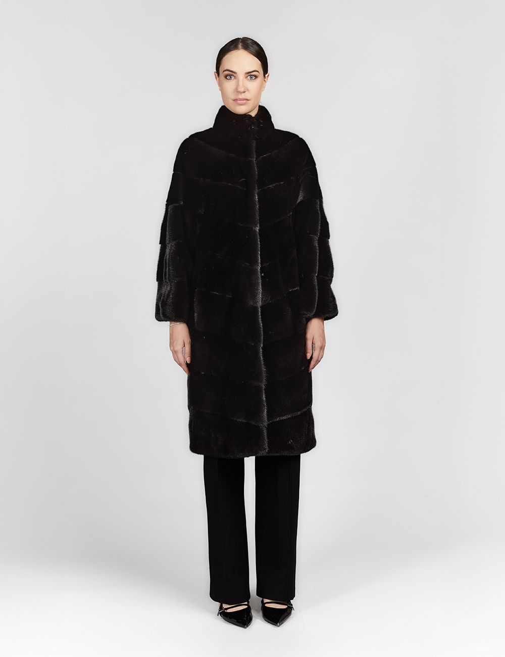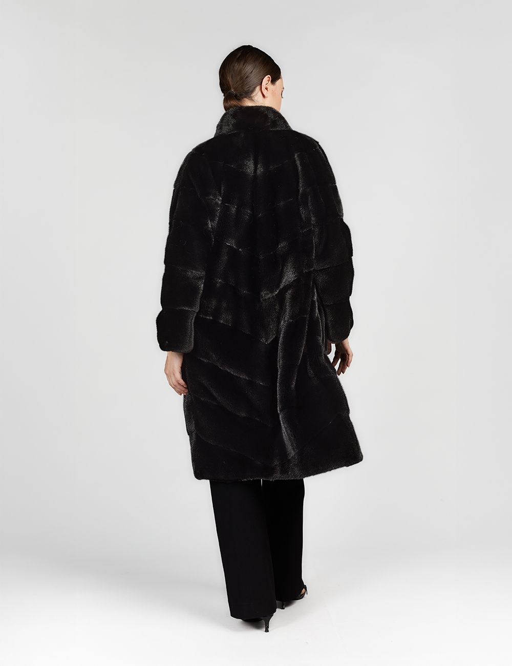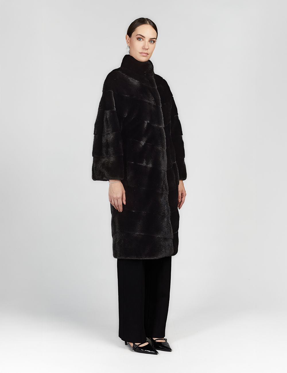 Cappotto in visone lungo, oversized, collo alto, lavorazione diagonale, nero, 100cm