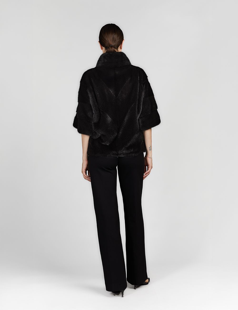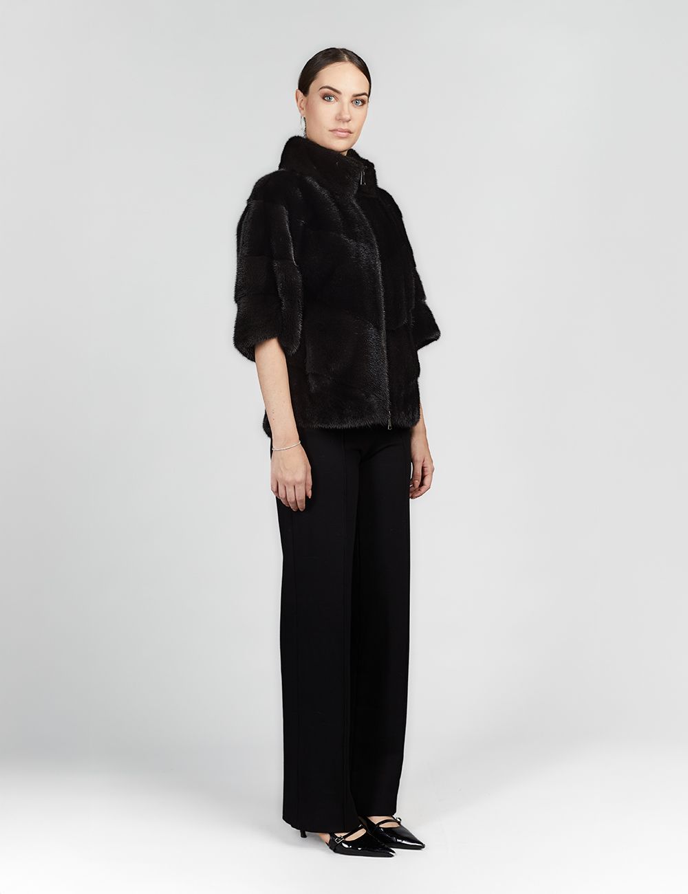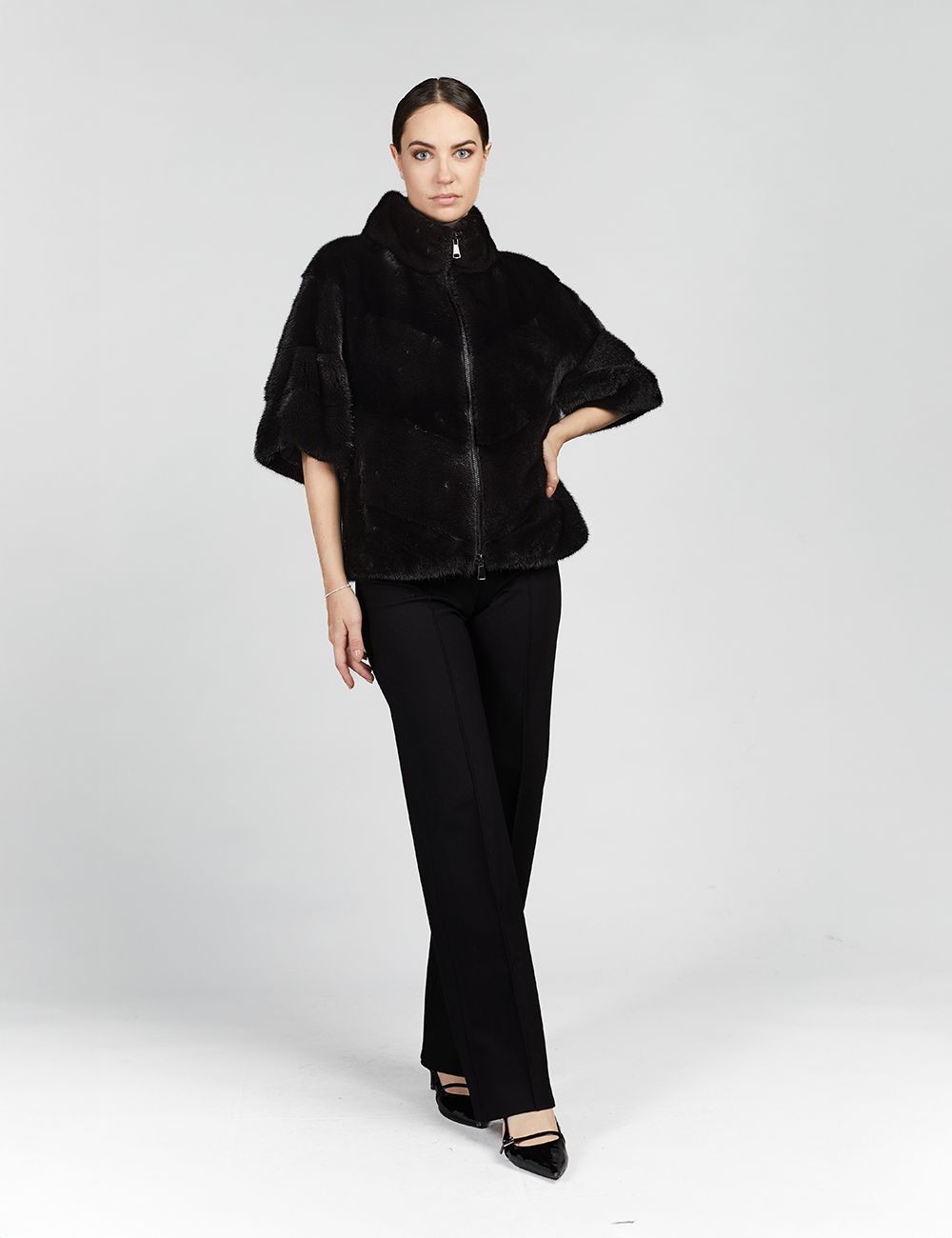 Giacca corta in visone, collo alto, chiusura con zip, manica a tre quarti, vestibilità slim, nero, 60cm
