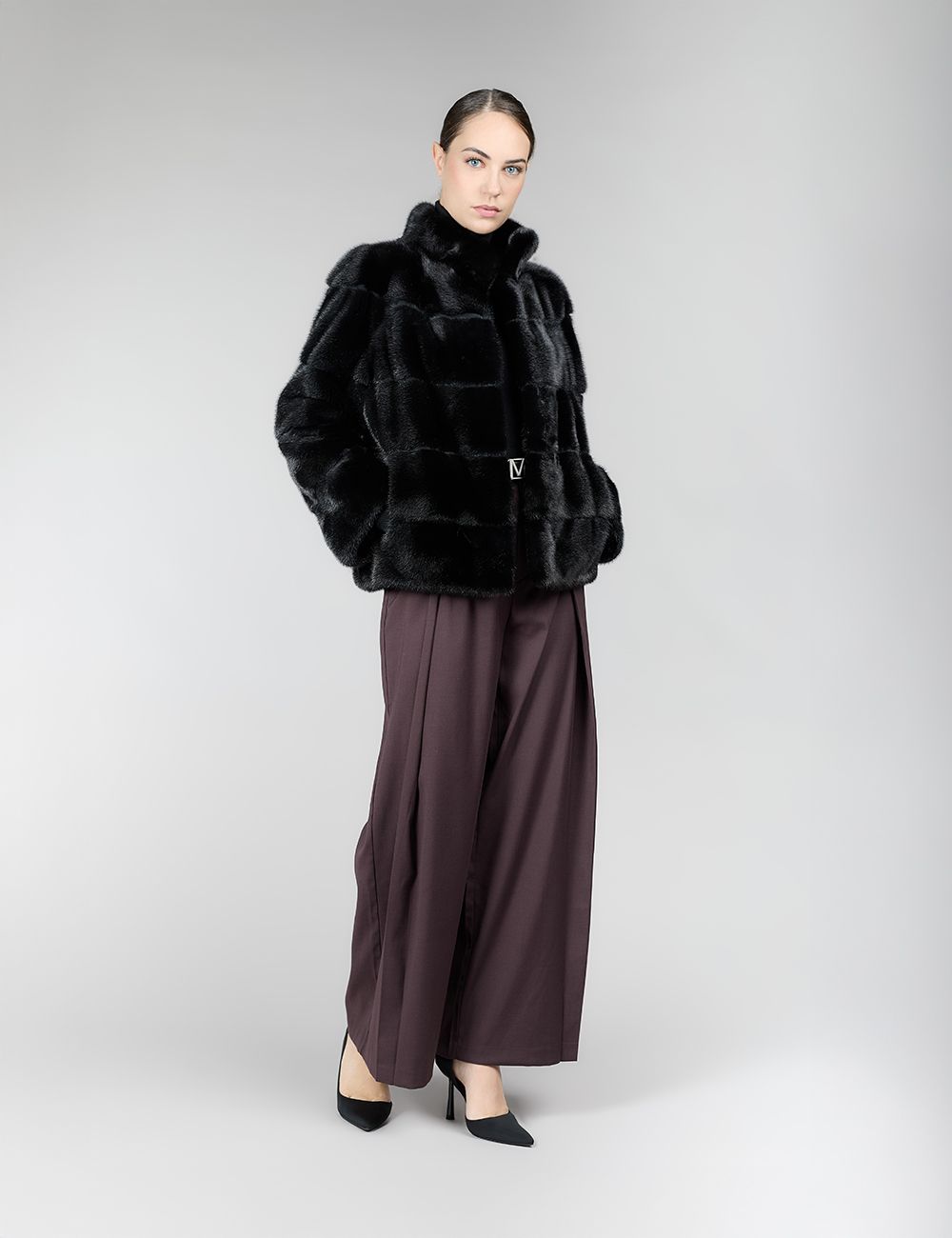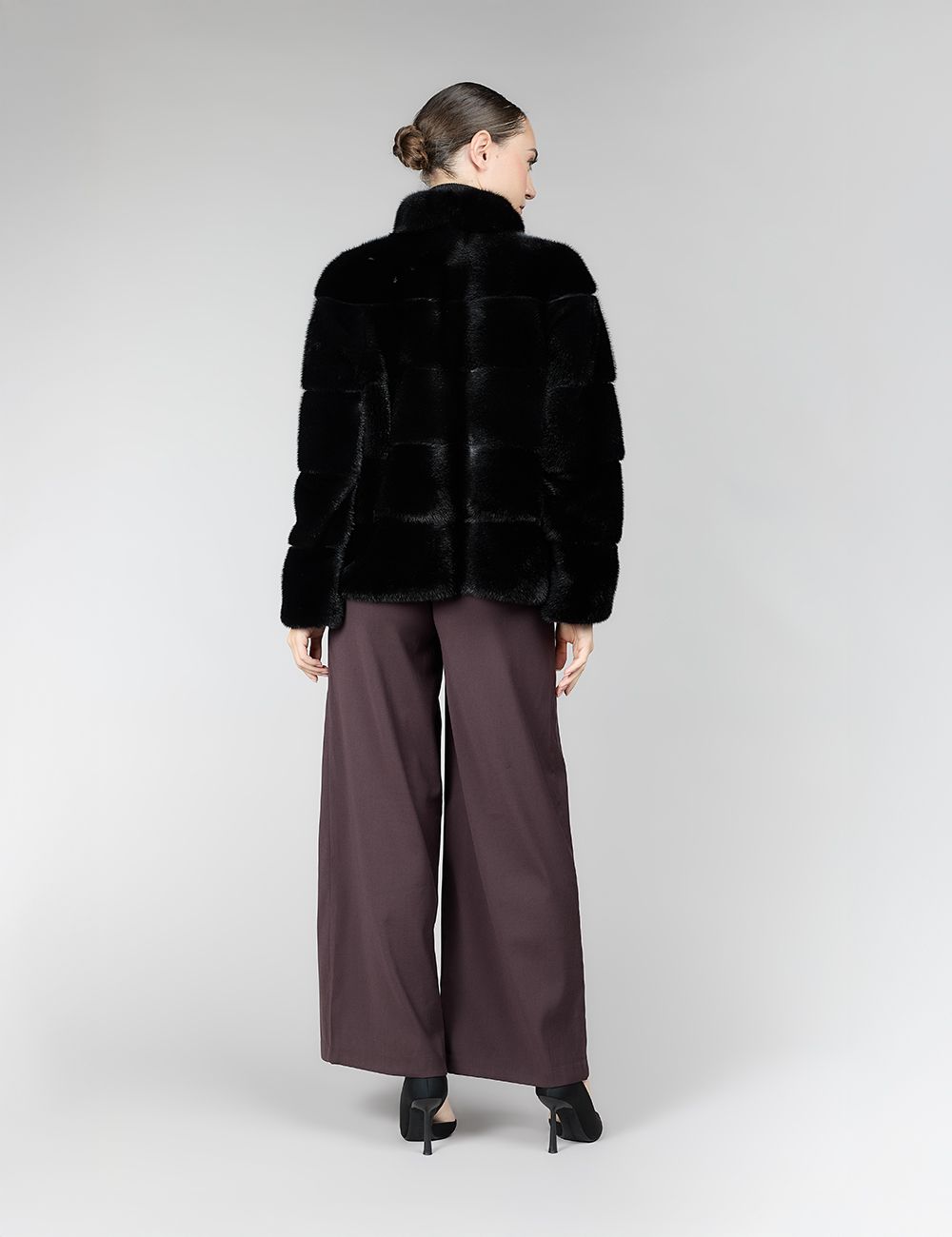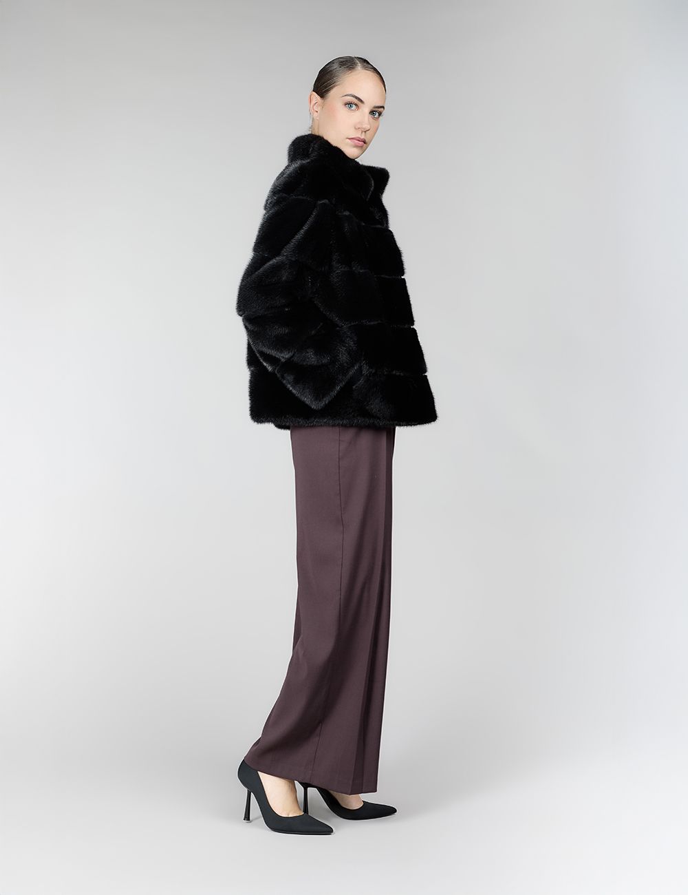 Giacca di visone, collo alto, lavorazione orizontale, nero, 60 cm