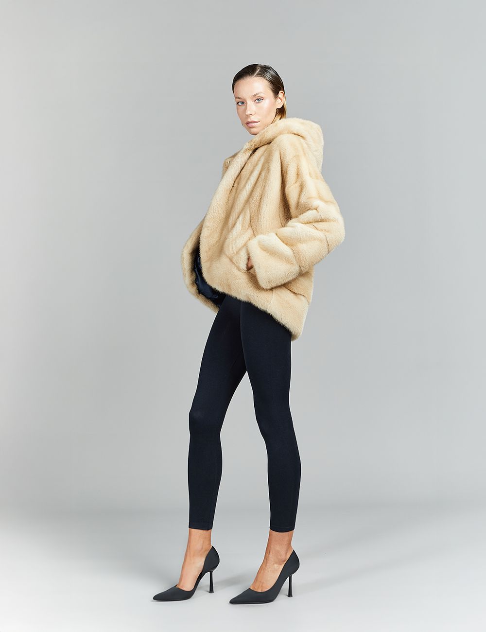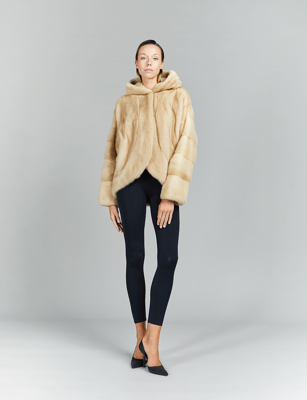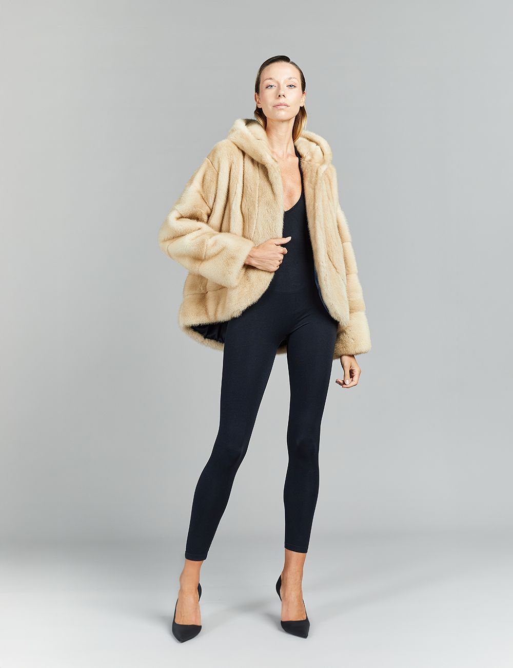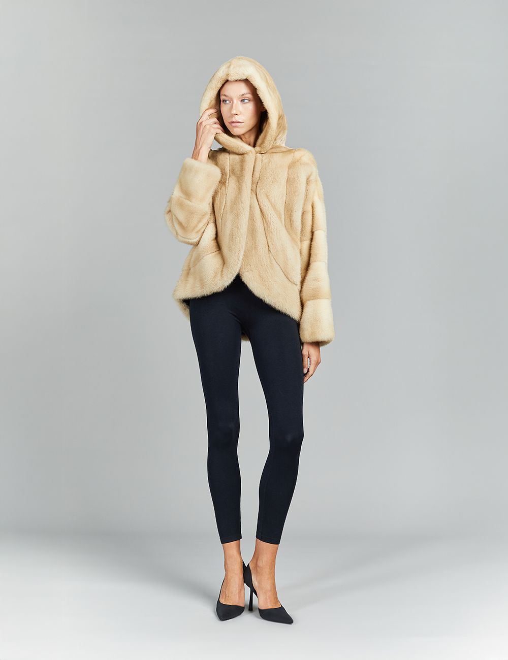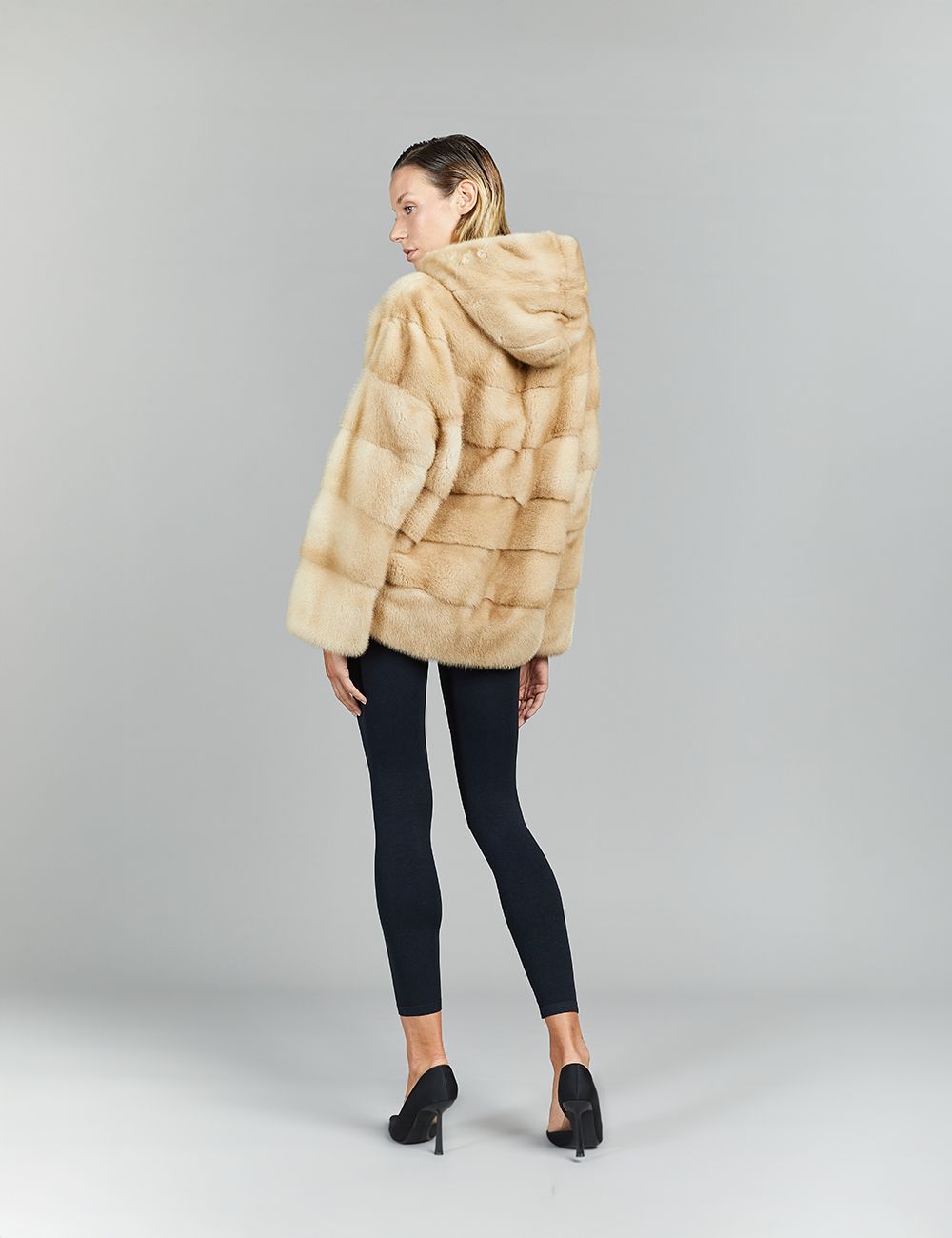 Giacca in visone con cappuccio, palomino, 70 cm