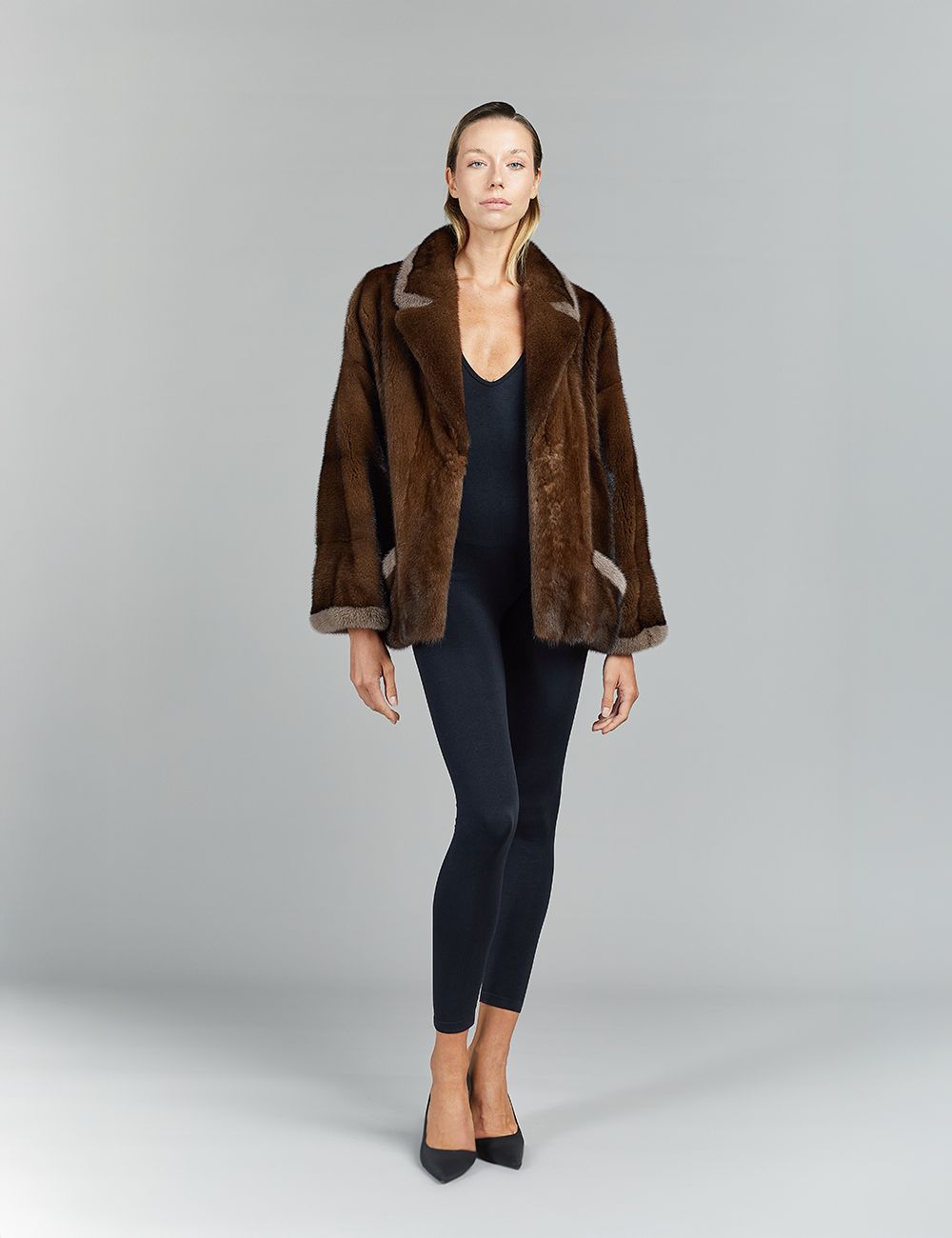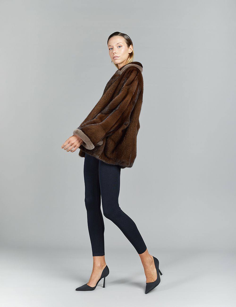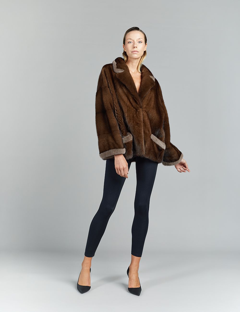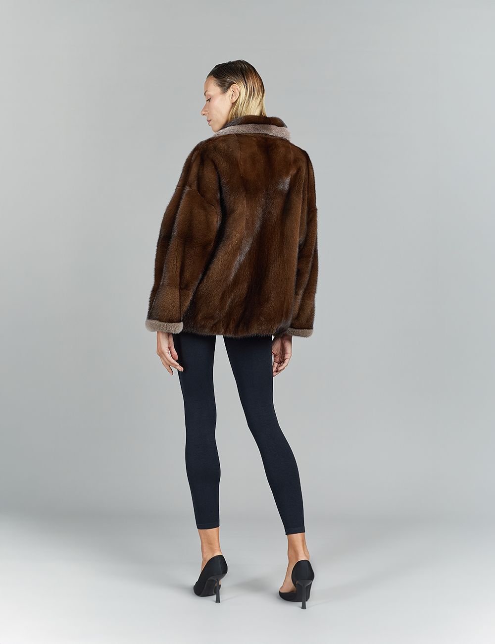 Giacca over in visone, con collo inglese, a pelle intera, demi buff, 70 cm