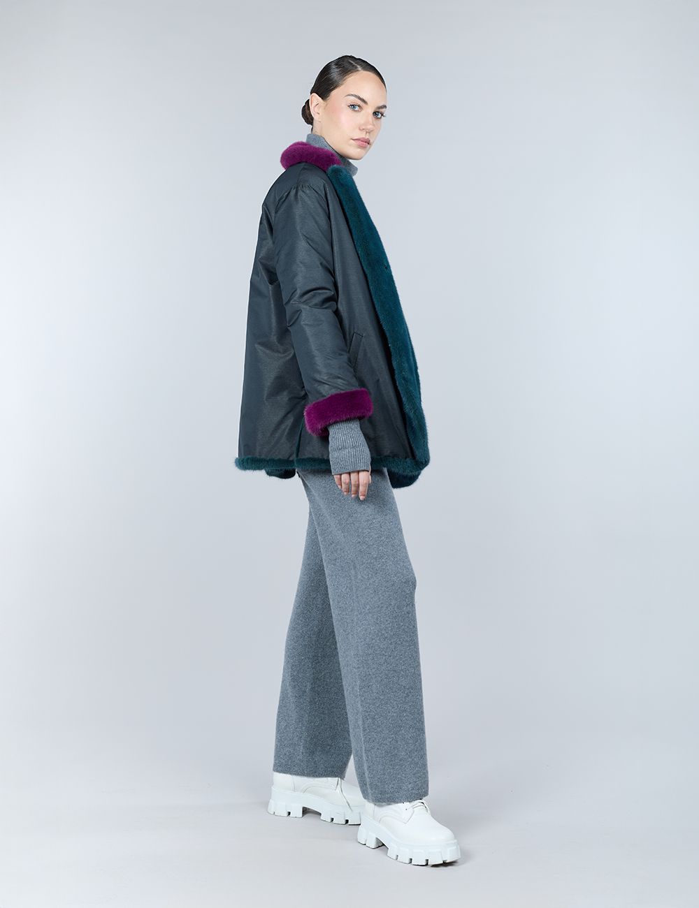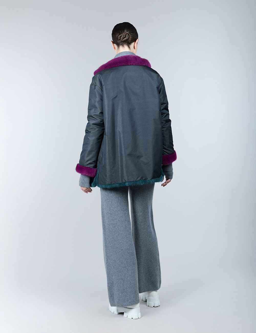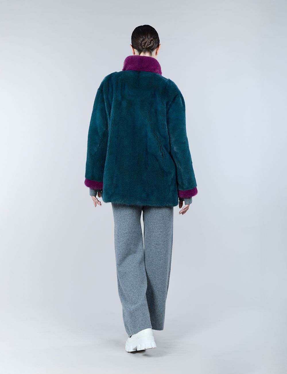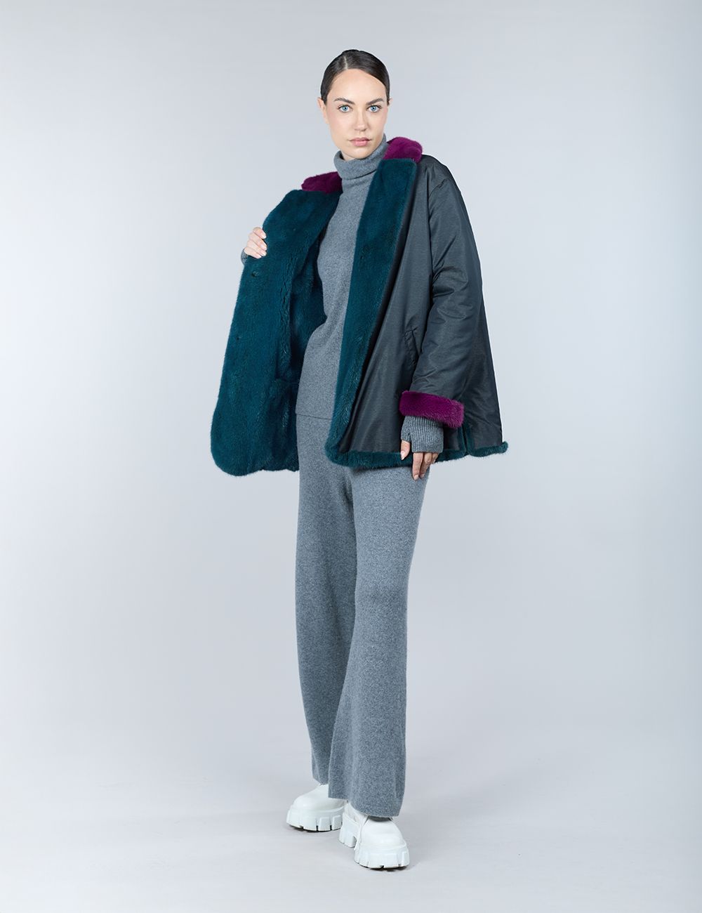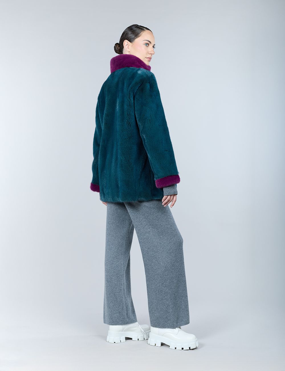 Giacca reversibile in visone, collo alto, petrolio con dettagli viola, 75 cm